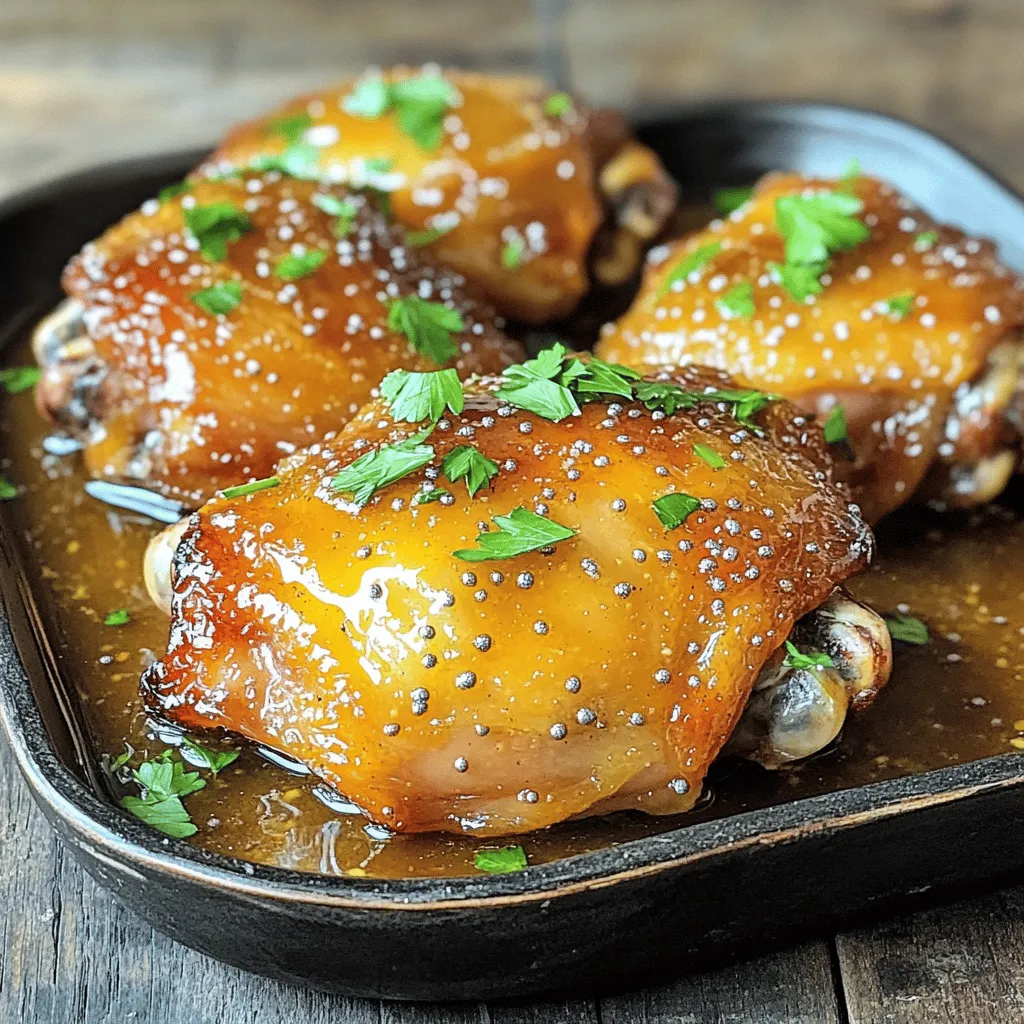 Once cooked, let the chicken rest for 5 minutes before serving. This keeps the meat juicy. For a nice touch, sprinkle chopped fresh parsley on top for color and flavor. Enjoy your delicious honey mustard glazed chicken thighs!