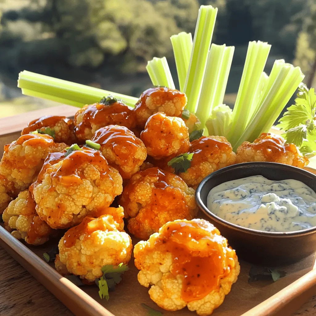 ![- 1 medium head of cauliflower, cut into bite-sized florets - 1 cup all-purpose flour (or gluten-free flour) - 1 cup water - 1 teaspoon garlic powder - 1 teaspoon onion powder - 1 teaspoon smoked paprika - Salt and pepper to taste - 1 cup buffalo sauce - 2 tablespoons melted vegan butter (optional) - Celery sticks - Blue cheese dressing - Calories: 180 - Protein: 5g - Carbohydrates: 25g - Dietary Fiber: 3g - Sugars: 2g - Fat: 7g Buffalo cauliflower bites make a great snack. They are tasty and healthy. You can enjoy them at any time. The ingredients are simple and easy to find. The optional ingredients can add flavor and crunch. You can serve them with celery sticks for a fresh bite. The blue cheese dressing gives a creamy touch that many love. When you make these bites, you get a great mix of flavor and texture. The baking method keeps them crispy without added oil. Each bite is packed with flavor from the spices. The buffalo sauce gives them a spicy kick that makes them hard to resist. For the full recipe, check out the detailed steps in the next section. Enjoy your cooking! First, preheat your oven to 450°F (230°C). This high heat helps to make the bites crispy. Next, line a baking sheet with parchment paper. This prevents sticking and makes cleanup easy. In a large bowl, whisk together: - 1 cup all-purpose flour - 1 cup water - 1 teaspoon garlic powder - 1 teaspoon onion powder - 1 teaspoon smoked paprika - Salt and pepper to taste Mix until smooth. You want the batter to coat the cauliflower well. If it’s too thick, add a bit more water. If too thin, add some flour. Take your cauliflower florets and dip each one into the batter. Make sure each piece is well-coated. After dipping, shake off any extra batter. Place them in a single layer on your baking sheet. Put the baking sheet in the oven and bake for 20-25 minutes. You want them golden brown and crispy. Halfway through, gently flip the bites for even cooking. In a separate bowl, mix 1 cup buffalo sauce with 2 tablespoons melted vegan butter, if you like. This adds richness and tones down the heat of the sauce. When the cauliflower bites are golden, take them out of the oven. Carefully toss them in the buffalo sauce until every piece is coated. Return the bites to the oven for another 10-15 minutes. This makes the sauce stick and enhances crispiness. Once done, let the bites cool for a few minutes. For the best experience, serve with celery sticks and blue cheese dressing. This adds a nice crunch and flavor. You can find the full recipe above for more details! To make sure your Buffalo Cauliflower Bites are crispy, follow these steps: - Use a hot oven. Preheat it to 450°F (230°C) for best results. - Don’t overcrowd the baking sheet. Place florets in a single layer. - Flip halfway through. This helps them brown evenly on all sides. - Bake longer if needed. Keep an eye on them until they look golden and crunchy. If you have dietary needs, don’t worry! Here are some easy swaps: - Gluten-free flour. Substitute the all-purpose flour with gluten-free flour. - Vegan butter. Skip the butter for a completely plant-based snack. - Spicy buffalo sauce. Choose a milder sauce if you prefer less heat. Want to save time? You can prep these bites in advance: - Cut the cauliflower. Do this a day ahead and store it in the fridge. - Make the batter. Prepare it and store it in the fridge for a day. - Bake ahead. You can bake the bites and reheat them later. For the complete recipe, check out the [Full Recipe]. {{image_4}} You can easily adjust the heat of your Buffalo Cauliflower Bites. For a spicy kick, use extra hot buffalo sauce. If you prefer a milder flavor, choose a mild buffalo sauce. You can also mix sauces. Blend hot and mild sauces to find your perfect balance. Add more or less sauce to control the heat. This way, you can please everyone at your table. If you want a quicker and healthier option, try the air fryer. This method makes the bites crispy without deep frying. Set your air fryer to 400°F (200°C). Cook the coated cauliflower for about 15 minutes, shaking the basket halfway through. Check for crispiness. This method cuts down on oil and keeps the bites light and tasty. You can make these bites even more fun by adding flavors. Try mixing in different spices like cayenne, cumin, or even lemon zest. For a cheesy touch, sprinkle nutritional yeast into the batter. If you love herbs, toss in some dried oregano or thyme. These simple changes can elevate your bites and keep your taste buds excited. For the complete recipe, check out the Full Recipe section. You can store leftover Buffalo Cauliflower Bites in an airtight container. Keep them in the fridge for up to three days. Make sure they cool down first to prevent moisture buildup. If you have a lot of leftovers, you can separate them into smaller portions. This helps with easy reheating later. To reheat, preheat your oven to 400°F (200°C). Place the cauliflower bites on a baking sheet. Heat them for about 10-15 minutes until they are crispy again. You can also use an air fryer for a quick reheat. Just heat them for about 5 minutes for the best crunch. If you want to freeze them, do it before tossing in the buffalo sauce. Place the uncooked battered cauliflower bites on a baking sheet in a single layer. Freeze them until solid, then transfer to a freezer bag. They can last for up to three months. When ready to eat, bake them straight from the freezer, adding a few extra minutes to the cooking time. Enjoy your snack any time! For the full recipe, please check the complete instructions. Buffalo Cauliflower Bites can last for about 3-5 days in the fridge. Make sure to store them in an airtight container. If you want to keep them longer, consider freezing them. Just be aware that freezing may change their texture. Yes, you can use frozen cauliflower. Just thaw it and drain any excess water. This will help the batter stick better. Keep in mind that fresh cauliflower may give a cri
