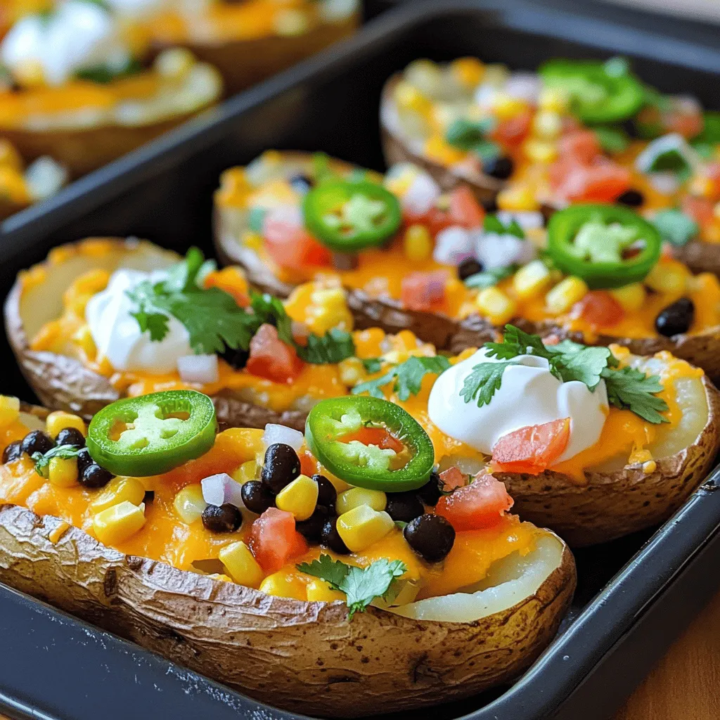 - 4 large russet potatoes - 1 cup shredded cheddar cheese - 1/2 cup sour cream - 1 cup canned black beans, drained and rinsed - 1/2 cup corn kernels (either fresh or frozen) - 1/2 cup diced tomatoes - 1/4 cup sliced jalapeños (choose between fresh or pickled) - 1/4 cup chopped green onions - Fresh cilantro for garnish (optional) - 2 tablespoons olive oil - 1 teaspoon garlic powder - 1 teaspoon chili powder - Salt and pepper to taste Using fresh ingredients makes this dish even better. I love how the creamy cheese complements the crispy potatoes. The black beans and corn add a nice texture too. This combo of flavors makes every bite special. You can mix and match toppings to suit your taste. The Full Recipe offers more details to help you make this snack delight! - Preheating the Oven: Start by preheating your oven to 400°F (200°C). This ensures even cooking. - Washing and Scrubbing: Wash and scrub the russet potatoes under running water. This removes dirt and makes them clean. - Prickling and Seasoning: Use a fork to prick each potato all over. This step is key to stop them from bursting. Rub olive oil on the potatoes and sprinkle salt and pepper evenly. - Initial Baking: Place the seasoned potatoes on the oven rack. Bake them for 45-60 minutes. They are done when a fork goes in easily. - Cooling Process: Carefully take the potatoes out of the oven. Let them cool for a few minutes before handling. - Cutting and Scooping: Cut each potato in half lengthwise. Scoop out some flesh from each half, leaving about 1/4 inch. You can save this for mashed potatoes. - Increasing Oven Temperature: Raise the oven temperature to 425°F (220°C). This helps achieve a crispier skin. - Layering the Ingredients: Place the potato halves cut side up on a baking sheet. Brush the insides with olive oil and sprinkle garlic powder and chili powder. - Melting the Cheese: After crisping the skins for 10-15 minutes, fill them with black beans, corn, tomatoes, and cheese. Bake for another 10-12 minutes until the cheese is melted. - Garnishing and Serving: Let the potato skins cool for a couple of minutes. Top them with sour cream, green onions, and cilantro for a fresh touch. Enjoy these tasty snacks right away! For more details, check out the Full Recipe. How to Choose the Right Potatoes I love using large russet potatoes for this recipe. They have thick skins and a fluffy inside. These features make them perfect for holding toppings. Look for potatoes that are firm and without any blemishes. This ensures they cook evenly and taste great. Cooking Times Adjustments Cooking times can vary. If your potatoes are smaller, check them at 40 minutes. For larger ones, they may need a bit longer. You want them fork-tender. Always keep an eye on them to avoid overcooking. Additional Seasoning Suggestions To boost flavor, try adding smoked paprika or cumin. These spices give a warm, smoky taste. You can also sprinkle some cayenne for heat. Mix and match according to your taste. Don’t forget to season the potato skins well before baking! Ideal Cheese Choices Cheddar is my go-to for these potato skins. It melts beautifully and has a sharp flavor. You can also mix in Monterey Jack or pepper jack for a little kick. Feel free to experiment with your favorite cheeses! Creative Serving Suggestions Serve your loaded nacho potato skins on a colorful platter. Arrange them in a circle and place toppings in small bowls. This way, guests can add their own toppings. It makes the dish interactive and fun. Garnishing Ideas Fresh herbs like cilantro or parsley add a pop of color. A sprinkle of lime juice can brighten the flavors. You could also add some diced avocado for creaminess. These garnishes elevate the look and taste of your dish. For the complete recipe, check out the [Full Recipe]. {{image_4}} Alternative Beans and Veggies You can change the beans or veggies in your loaded nacho potato skins. Try pinto beans or kidney beans for a twist. Fresh spinach or bell peppers can add color and flavor, too. Use what you like best! Different Cheeses Cheese is key in this recipe. If you want a different taste, try pepper jack or mozzarella. You could also use a vegan cheese for a plant-based option. Each cheese brings its unique flavor to the dish. Vegan Options To make this dish vegan, swap out the cheddar cheese and sour cream for plant-based versions. Use cashew cream or coconut yogurt instead of sour cream. This keeps the dish creamy and delicious without animal products. Gluten-Free Suggestions This recipe is already gluten-free with the right ingredients. Just check that your toppings, like canned beans, are certified gluten-free. This way, everyone can enjoy the snack without worry. Spicy Versus Mild Variations For spice lovers, add more jalapeños or try hot sauce before serving. If you prefer mild flavors, reduce or skip the spicy toppings. Adjusting spice levels makes the dish perfect for your taste. International Twists You can give these potato skins global flair! Add salsa for a Mexican twist or top with BBQ sauce for a Southern flavor. Think outside the box and explore different cuisines to make this snack your own. For the complete recipe, check out the [Full Recipe]. Enjoy making these tasty loaded nacho potato skins! To keep your loaded nacho potato skins fresh, follow these tips: - Best Practices for Refrigeration: Let the potato skins cool to room temperature. Place them in an airtight container. This helps keep the skins moist and prevents them from drying out. You can also wrap them tightly in plastic wrap for extra protection. - How Long They Last: The loaded potato skins can last in the fridge for up to three days. After that, they may lose their taste and texture. When it comes to reheating, you have two main options: - Oven Versus Microwave Reheating: The oven is the best choice for reheating. It keeps the skins crispy. Preheat your oven to 350°F (175°C) and bake for about 10-15 minutes. The microwave is faster but