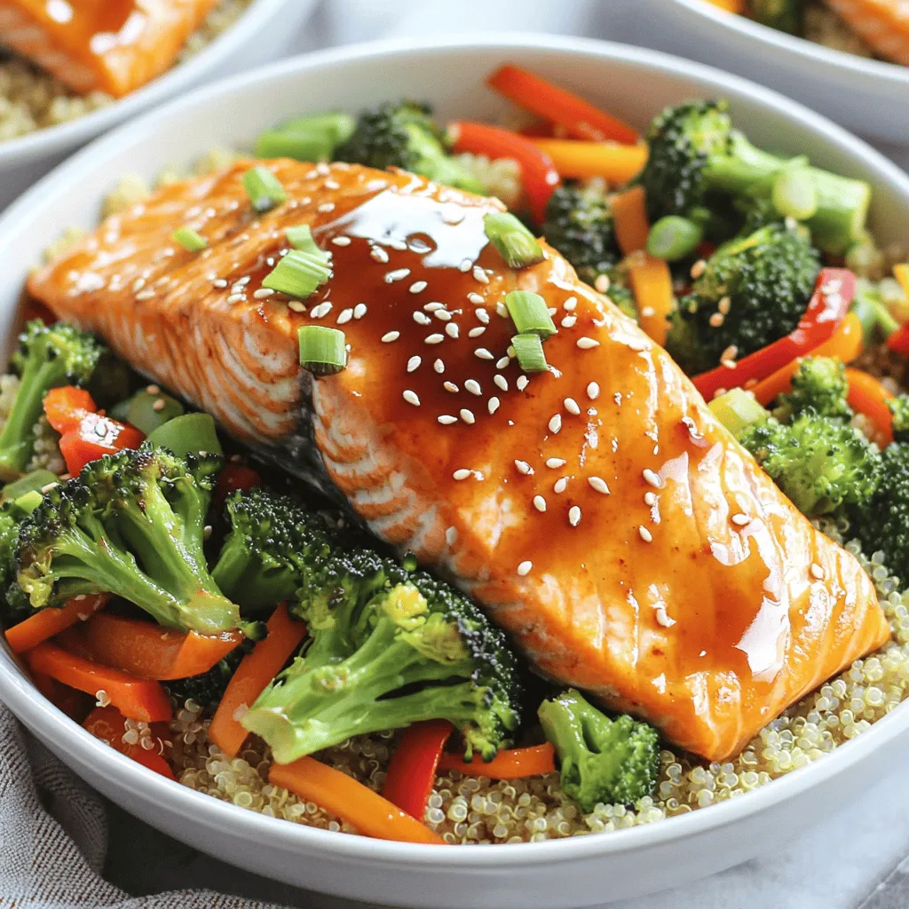 ![- 4 salmon fillets (approximately 6 ounces each) - 1 cup quinoa, thoroughly rinsed - 2 cups low-sodium vegetable or chicken broth - 1 cup broccoli florets - 1 bell pepper, thinly sliced (choose red or yellow for color) - 1 medium carrot, julienned - 3 tablespoons teriyaki sauce (can be store-bought or homemade) - 1 tablespoon sesame oil - 1 tablespoon olive oil I love using fresh ingredients for my teriyaki salmon bowls. The salmon fillets are the star. They bring rich flavor and healthy fats. Quinoa serves as a great base. It is full of protein and fills you up. The broth adds depth to the quinoa. It makes each bite tasty. For vegetables, I pick bright colors. Broccoli gives a nice crunch. Bell peppers add sweetness and color. Carrots bring a touch of earthiness. These veggies are not only healthy but also make the dish look pretty. Seasoning is key to flavor. Teriyaki sauce gives the salmon a sweet and savory taste. I also use sesame oil for a nutty touch. Olive oil helps the salmon roast nicely. With this mix, every bite is a delight. Try this recipe [Full Recipe] to create your own teriyaki salmon bowls. You’ll find it easy and fun! - In a medium saucepan, combine 1 cup of rinsed quinoa and 2 cups of broth. - Bring this mix to a boil over high heat, watching closely. - Once boiling, reduce the heat to low. Cover and let it simmer for 15 minutes. - After the time is up, remove it from heat. Fluff the quinoa gently with a fork. - Preheat your oven to 400°F (200°C). - On a lined baking sheet, place 4 salmon fillets skin-side down. - Drizzle olive oil over the salmon and season with salt and pepper. - Generously brush each fillet with teriyaki sauce, ensuring it’s well-coated. - Heat 1 tablespoon of sesame oil in a skillet over medium heat. - Add 1 cup of broccoli florets, 1 sliced bell pepper, and 1 julienned carrot. - Sauté the vegetables for 5 to 7 minutes, stirring often, until they look vibrant and tender. These steps are key for your teriyaki salmon bowls. Each part creates a delicious meal you can enjoy. For the complete recipe, visit the Full Recipe section. To get the best salmon, you want it to flake easily. After baking, gently poke with a fork. If it breaks apart without effort, it’s ready. If not, give it a couple more minutes in the oven. Also, watch your oven temperature. Too hot can dry it out. Keep it at 400°F (200°C) for the best results. After cooking, fluff your quinoa with a fork. This keeps the grains light and separate. If you stir with a spoon, it can turn mushy. To prevent this, let it sit for a few minutes after cooking. The steam will help separate the grains. Timing is key for crisp vegetables. Sauté for about 5 to 7 minutes. Stir often but don’t overcook. You want them bright and tender. To add flavor, toss in a bit of garlic or ginger. This gives a great taste without losing nutrients. Keep it fresh and vibrant! {{image_4}} You can change the protein in this dish. Tofu is a great option if you want vegetarian. It absorbs flavors well and gives a nice texture. Just press it to remove extra moisture before cooking. For a twist, try chicken or shrimp. Both cook quickly and pair well with teriyaki sauce. Not a fan of quinoa? Use brown rice instead. It has a nutty flavor and adds nice texture. Cauliflower rice is another option. It’s low-carb and works well in bowls. Just sauté it lightly to keep it crisp. While teriyaki sauce shines in this dish, you can make your own. Combine soy sauce, honey, and ginger for a homemade version. If you want something different, use peanut sauce or a tangy soy sauce mix. Each sauce brings its own flair to the meal. For the full recipe, check out Teriyaki Salmon Bowls with Quinoa. To keep your Teriyaki Salmon Bowls fresh, store leftovers in the fridge. Place the salmon and quinoa in an airtight container. Add some vegetables on the side. This helps keep them crisp. You can refrigerate them for up to three days. For longer storage, freeze your leftovers. Wrap the salmon and quinoa tightly in plastic wrap. Then, place them in a freezer-safe bag. This way, they can last for up to three months. When it’s time to enjoy your leftovers, you have a few options. The best method is to reheat in the oven. Preheat the oven to 350°F (175°C). Place the salmon and quinoa in an oven-safe dish. Cover with foil to keep moisture in. Heat for about 15 minutes. If you're in a hurry, you can also use a microwave. Heat in short bursts of 30 seconds. Stir and check often to avoid overcooking. Leftover Teriyaki Salmon Bowls can last three days in the fridge. If you freeze them, they will stay good for up to three months. Always check for signs of spoilage. Look for a change in color or an off smell. If anything seems off, it’s best to toss it. Enjoy your meal, but safety comes first! You can tell salmon is cooked by looking for a few signs. The color should change from bright pink to a pale pink or opaque. It should flake easily when you poke it with a fork. The internal temperature should reach 145°F (63°C) for safe eating. This ensures it is not raw but still moist and tender. Yes! You can easily swap quinoa for other grains. Brown rice works well; it adds a nutty flavor. You can also use farro or barley for a different texture. Each grain brings its own taste and nutrition, so feel free to explore what you like best. You can add many kinds of vegetables to your teriyaki salmon bowls. Seasonal veggies like asparagus or zucchini can brighten the dish. Personal favorites like snap peas or bok choy also work great. Just remember to cut them into bite-sized pieces for easy eating. You can mix and match based on what you enjoy! This blog post covered a healthy salmon dish with quinoa and colorful vegetables. You learned how to cook quinoa and roast salmon with the right seasonings. We shared tips for perfect results and various options for proteins, grains, and sauces. By following these steps, you can create a tasty meal that suit