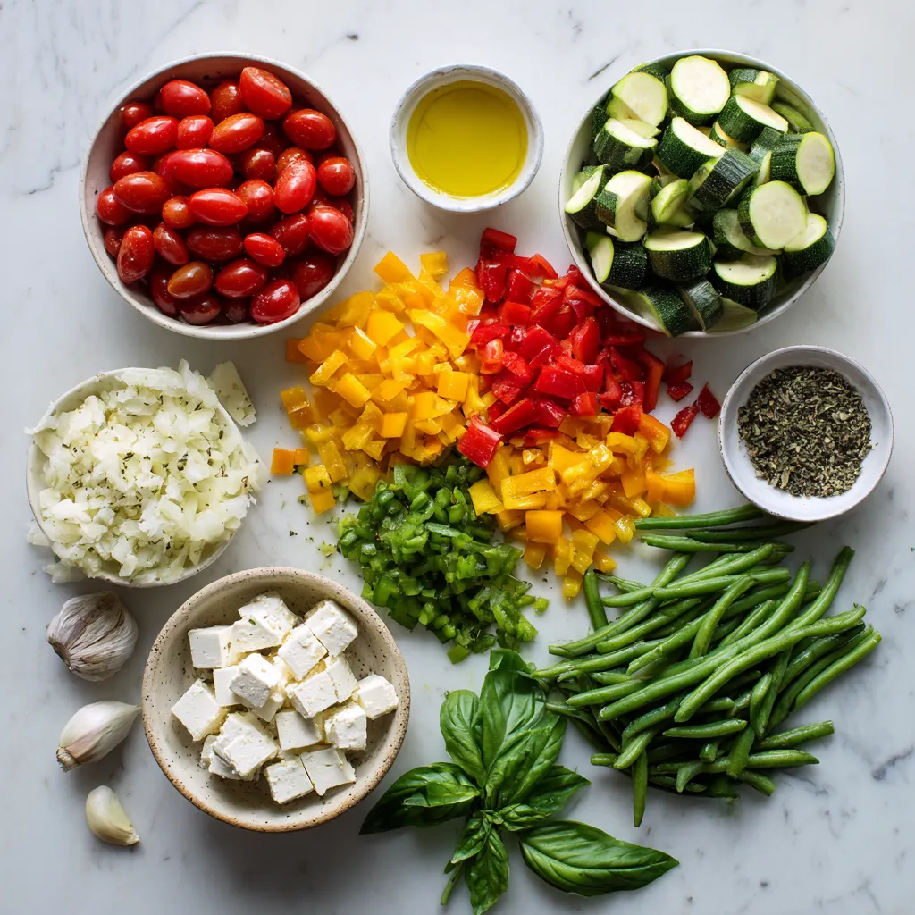 In a large baking dish, combine the halved cherry tomatoes, sliced zucchini, diced bell pepper, and trimmed green beans.