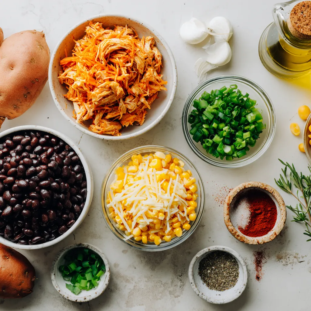 Gathering fresh ingredients is key to tasty BBQ chicken stuffed sweet potatoes. Start with sweet potatoes; they should feel firm and heavy. The chicken must be cooked and shredded for easy mixing. I love using rotisserie chicken for its flavor and ease. Choose your favorite barbecue sauce; it adds the main flavor punch.