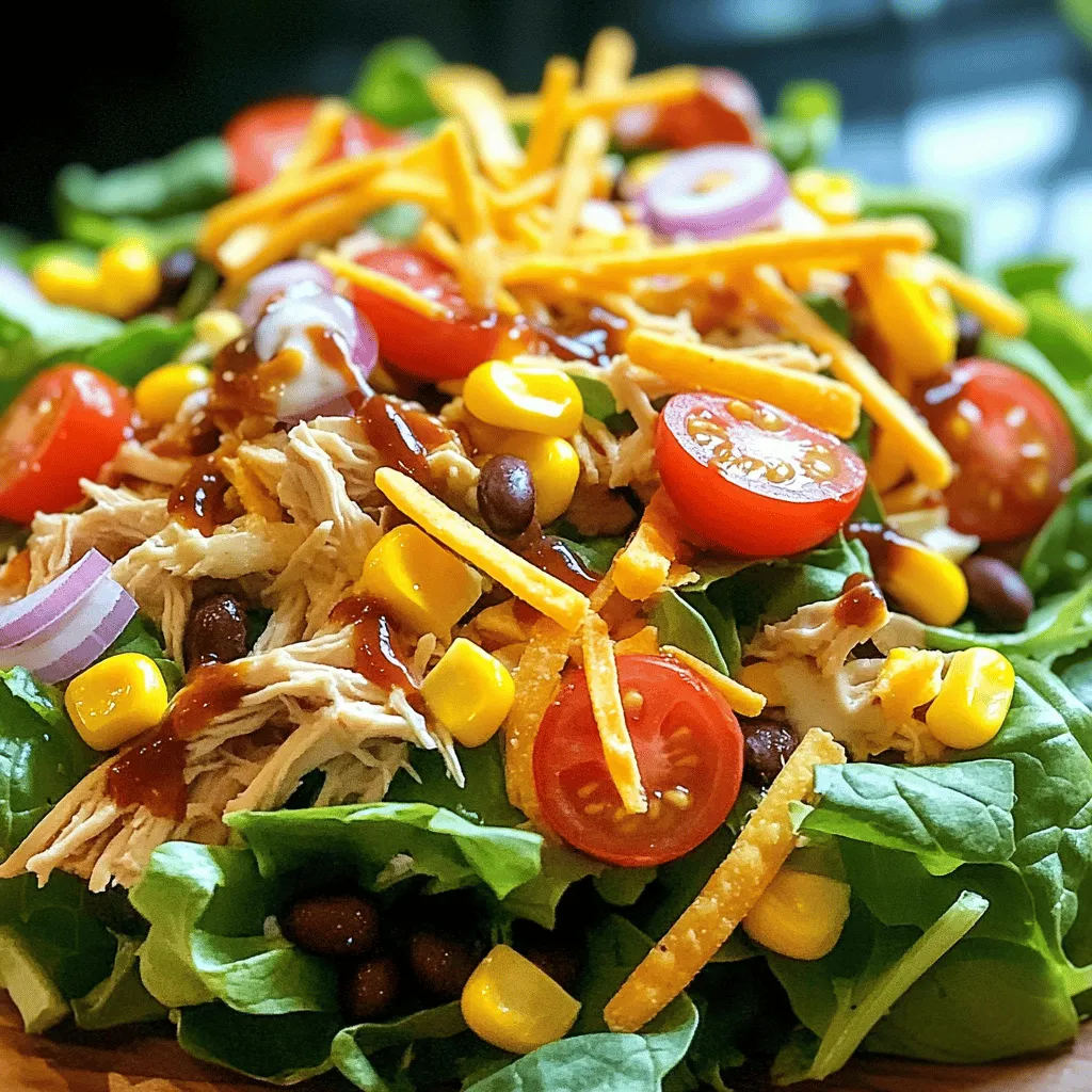 Now, take a big salad bowl. Layer 4 cups of mixed greens at the bottom. Next, arrange 1 cup of halved cherry tomatoes, 1/2 cup of thinly sliced red onion, 1 cup of corn, 1/2 cup of black beans, and 1/2 cup of shredded cheese on top. Then, spread the BBQ chicken mixture over these colorful ingredients. Finally, drizzle the ranch and BBQ dressing over the salad. Gently toss everything together, but be careful not to break the greens.