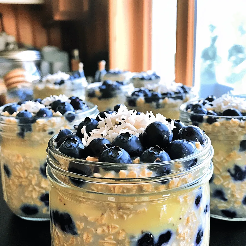 - 1 cup rolled oats - 1 cup coconut milk (choose between canned or carton) - 1/2 cup Greek yogurt (optional, for extra creaminess) - 1/2 cup fresh blueberries - 2 tablespoons unsweetened shredded coconut - 1 tablespoon honey or maple syrup (adjust based on your preferred sweetness) - 1/2 teaspoon pure vanilla extract - A pinch of salt This recipe packs a punch of flavor and nutrition. The rolled oats form the base of your meal. They provide a lot of fiber and help you feel full. Coconut milk adds creaminess and a lovely coconut taste. You can choose canned milk for a richer flavor or the carton for a lighter touch. If you want a creamier mix, Greek yogurt is a great option. It adds protein and makes the oats smooth. Fresh blueberries bring sweetness and antioxidants. They give your overnight oats a burst of flavor. Unsweetened shredded coconut adds texture and enhances the coconut taste. You can sweeten your dish with honey or maple syrup. Adjust the amount based on how sweet you want it. The vanilla extract adds depth, while a pinch of salt balances all the flavors. Gather these ingredients, and you are ready to create a tasty, nutritious meal that will make your mornings brighter! 1. Start by taking a medium bowl. Add 1 cup rolled oats and 1 cup coconut milk. Stir them together well. 2. If you want more creaminess, add 1/2 cup Greek yogurt. Next, pour in 1 tablespoon honey or maple syrup for sweetness. 3. Add 1/2 teaspoon pure vanilla extract and a pinch of salt. Mix everything until the oats soak up the liquid. 1. Gently fold in 1/2 cup fresh blueberries. Make sure to save a few for topping later. 2. Now, add 2 tablespoons unsweetened shredded coconut to the mixture. Stir it well until fully combined. 1. Divide the mixture evenly into two jars or airtight containers. Leave a little space at the top. 2. Seal the containers tightly. Place them in the fridge overnight, or for at least 4 hours. Eight hours is best for great flavor. When you wake up, your delicious, creamy Blueberry Coconut Overnight Oats will be ready to enjoy! Soaking time is key for great overnight oats. Aim for at least 4 hours in the fridge. Eight hours gives the best flavor and texture. The oats need this time to absorb the liquid fully. If you prefer a looser mix, you can adjust the consistency with coconut milk. Just add a splash before eating to reach your desired creaminess. You can make these oats even better with extra toppings and mix-ins. Try adding nuts, seeds, or even a scoop of nut butter. For sweetness, adjust the amount of honey or maple syrup. Start with one tablespoon, then taste and add more if needed. Fresh fruit can also boost flavor and texture. Making a larger batch saves time on busy mornings. Simply double the recipe and store the extra jars in the fridge. Use airtight containers to keep them fresh. You can prepare these oats ahead of time and enjoy them throughout the week. Just grab and go! {{image_4}} You can change the berries in your overnight oats. Try using strawberries or raspberries instead of blueberries. These fruits add different flavors and colors. If you want a tropical twist, add diced mango or pineapple. These fruits make your oats even more exciting. If you want to switch up the milk, many options exist. Almond milk gives a nutty flavor. Soy milk is a great choice for a creamy texture. Oat milk is another tasty option. Each milk adds a unique taste to your oats, so feel free to experiment! You can easily make these oats fit your diet. For a vegan option, skip the Greek yogurt. You can replace it with more coconut milk or a dairy-free yogurt. For those who need gluten-free meals, use certified gluten-free oats. These simple swaps keep your dish both tasty and healthy. You can store the mixture in the fridge for up to five days. I suggest using airtight containers or jars. This keeps the oats fresh and tasty. Yes, you can freeze overnight oats! Just divide them into containers before freezing. To thaw, place them in the fridge overnight. You can also microwave them for a quick thaw. The best time to enjoy these oats is in the morning. If you like your oats warm, heat them in the microwave for about one minute. This brings back the cozy feel of a warm breakfast. Blueberry Coconut Overnight Oats stay fresh for up to five days in the fridge. To keep them tasty, store them in airtight containers. This helps lock in moisture and flavor. If you notice any change in smell or texture, it’s best to toss them. Yes, you can easily make these oats vegan! Simply skip the Greek yogurt. Instead, use an extra half cup of coconut milk to keep it creamy. You can also use maple syrup as your sweetener. Both options are plant-based and delicious. If you don’t have Greek yogurt, try using silken tofu. It adds a nice creamy texture. You can also use almond yogurt or coconut yogurt for a dairy-free option. Each of these substitutes keeps the flavor rich and smooth, just like Greek yogurt. Blueberry Coconut Overnight Oats are simple and tasty. We covered key ingredients, step-by-step instructions, and helpful tips. You can tweak flavors and store them easily for busy mornings. Making these oats vegan or using different fruits is simple too. Now, you know how to make a delicious breakfast that fits your needs. Enjoy these oats chilled or warm, and make them your own!