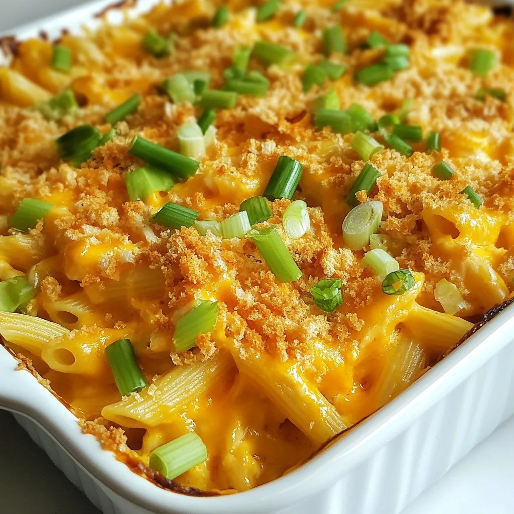 To make Buffalo Ranch Chicken Casserole, you need the following main ingredients: - 2 cups cooked chicken, shredded - 1 cup Buffalo sauce - 1 cup ranch dressing - 2 cups cooked pasta (penne or rotini for best texture) - 1 cup shredded sharp cheddar cheese - 1 cup shredded mozzarella cheese - 1/2 cup green onions, chopped - 1/2 cup celery, diced - 1 teaspoon garlic powder - Salt and pepper to taste - 1 tablespoon olive oil - 1/2 cup breadcrumbs These ingredients work together to create a flavorful and creamy dish. You can customize your casserole by adding optional ingredients: - Diced bell peppers for extra crunch - Cooked bacon for a smoky flavor - Jalapeños for added heat - Fresh herbs like parsley or cilantro for garnish These options let you make the dish your own. If you don't have some ingredients, here are some swaps: - Use Greek yogurt instead of ranch dressing for a lighter version. - Swap chicken for turkey or cooked tofu for a different protein. - Use any pasta shape you have on hand, like rotini or fusilli. - Replace sharp cheddar with Monterey Jack or pepper jack cheese for a twist. These substitutions maintain the spirit of the dish while catering to your pantry. {{ingredient_image_2}} Start by preheating your oven to 350°F (175°C). This step is key for a well-cooked casserole. While the oven warms up, gather all your ingredients. You need cooked chicken, Buffalo sauce, ranch dressing, and cooked pasta. Don't forget the cheese, green onions, and celery. Having everything ready makes the process smooth and fun. In a large bowl, combine your shredded chicken, Buffalo sauce, ranch dressing, and cooked pasta. I like to sprinkle in garlic powder for extra flavor. Next, fold in the chopped green onions, diced celery, and half of the shredded cheddar and mozzarella cheeses. Mix it all well to coat every piece in the tasty sauces. In another bowl, mix the breadcrumbs with the remaining cheddar and mozzarella. Drizzle olive oil over this mix. Toss it lightly so the breadcrumbs get a nice coating of oil. This will help make the topping crispy and golden when baked. Now, grease a 9x13-inch casserole dish. Spoon the chicken and pasta mixture into the dish, spreading it evenly. This helps the casserole cook well. Then, sprinkle the breadcrumb and cheese mix on top. Make sure every part of the casserole is covered. Bake it in the oven for 25-30 minutes until the top is golden brown and the casserole is hot throughout. After baking, let the casserole cool for about 5 minutes. This cooling time helps it set. When serving, get creative! You can garnish with more chopped green onions and drizzle ranch dressing on top for extra flavor. Enjoy this warm dish right from the casserole dish for a cozy meal! Cook pasta until al dente. This means it should have a slight bite. Overcooking makes it mushy in the casserole. Use penne or rotini for the best texture. They hold sauce well. Make sure to salt the water before boiling. This adds flavor to the pasta itself. To get a crispy top, mix breadcrumbs with cheese. Use sharp cheddar and mozzarella for great flavor. Drizzle olive oil over the mixture to help it brown. Toss it lightly to coat all the crumbs. Spread this mixture evenly over the casserole before baking. This creates a nice, golden crust. Garnish your casserole with extra green onions. This adds color and freshness. Drizzle ranch dressing over the top for extra taste. For a rustic look, serve it right from the dish. This makes it feel homey and inviting. Enjoy your meal with family and friends! Pro Tips Use Rotini or Penne Pasta: These shapes hold onto the sauce better, ensuring each bite is full of flavor. Mix in Extra Veggies: Add bell peppers or spinach for added nutrition and color in your casserole. Let it Rest: Allow the casserole to cool for a few minutes after baking so it sets up nicely for easier serving. Customize Your Heat: Adjust the Buffalo sauce to your preferred spice level, or mix in some honey for a sweet and spicy twist. {{image_4}} To make this dish spicier, you can add jalapeños or crushed red pepper flakes. For a smoky kick, try chipotle powder. You could also mix in a bit of extra Buffalo sauce. Adjust the amount to fit your taste. Remember, a little heat can go a long way! If you want a vegetarian version, swap the chicken for cooked lentils or chickpeas. Use veggie broth in place of the chicken. You can add extra veggies like bell peppers or zucchini. This way, you keep the flavor but make it plant-based. Cheese adds creaminess and flavor to this casserole. You can use pepper jack for a spicy twist. Gouda or Monterey Jack can also work well to change it up. If you're feeling adventurous, try a mix of your favorites for a cheesy delight! To store leftovers, first let the casserole cool. Once cooled, cover it tightly with plastic wrap or aluminum foil. You can also use an airtight container. This keeps the casserole fresh and tasty. Store it in the fridge for up to four days. When you are ready to eat the leftovers, preheat your oven to 350°F (175°C). Place the casserole in an oven-safe dish. Cover it with foil to keep it from drying out. Heat for about 20 minutes or until it’s warm all the way through. You can also use a microwave. Just heat in short bursts, stirring in between to make sure it warms evenly. If you want to freeze the casserole, it’s best to do this before baking. Prepare the casserole as normal, but don’t bake it. Instead, cover it tightly with foil or plastic wrap. Place it in a freezer-safe container. It can last in the freezer for up to three months. When you’re ready to bake it, thaw it in the fridge overnight and then bake as directed. This keeps all the flavors intact. No, you should not use raw chicken. This recipe calls for cooked chicken. Using raw chicken can make the dish unsafe. If you want to use raw chicken, you must cook it first. You can add more Buffalo sauce to the mixture. For extra heat, try adding diced jalapeños or