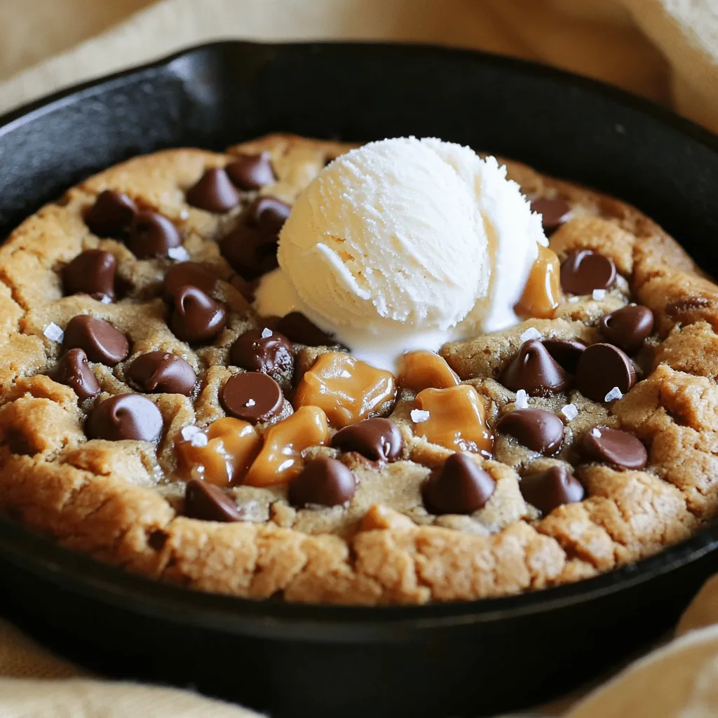 A skillet cookie is a large, thick cookie baked in a skillet. It has a soft center and crispy edges. This cookie is often served warm and can be enjoyed straight from the skillet. The texture is chewy and gooey, thanks to the melting chocolate and caramel bits.