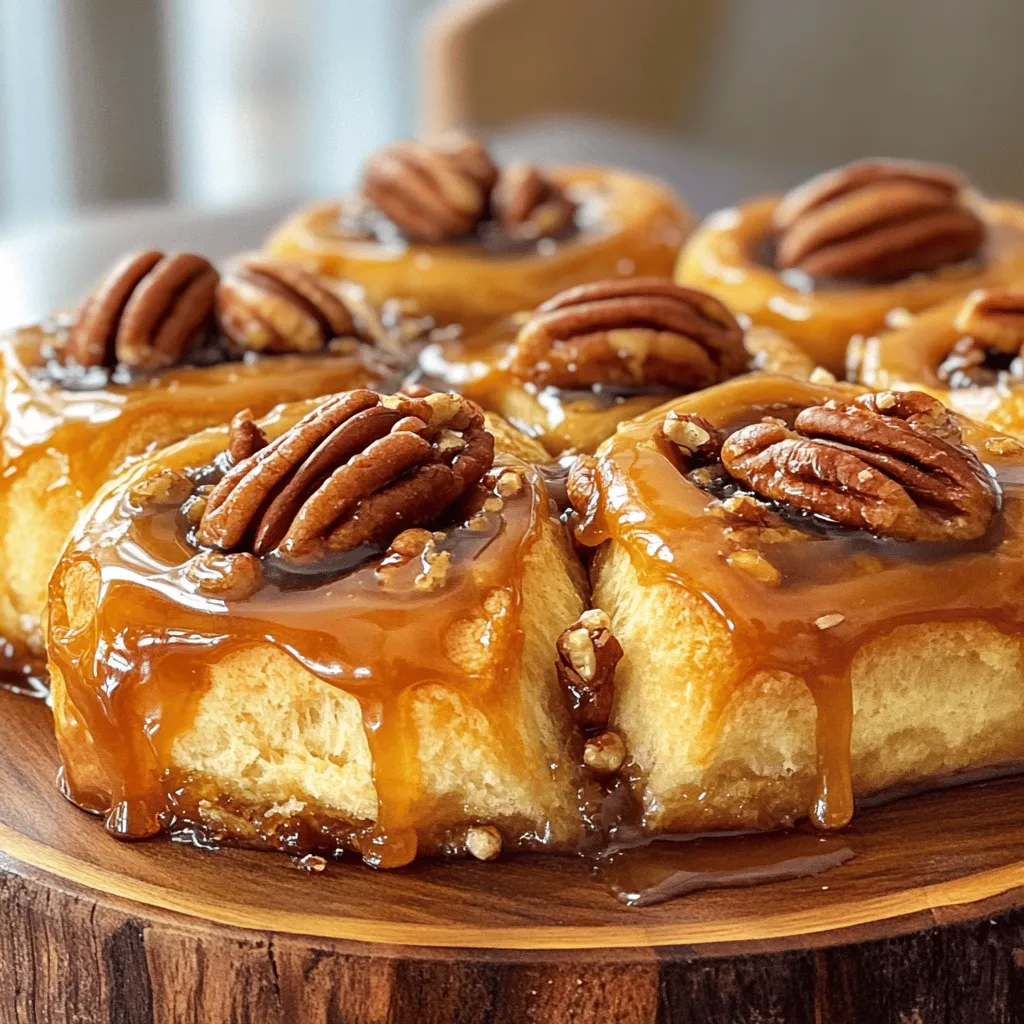 To make these sticky buns, you need some key ingredients: - 2 cups all-purpose flour, plus extra for dusting - 1/2 cup granulated sugar - 1/2 teaspoon salt - 1 packet (2 1/4 teaspoons) active dry yeast - 1/2 cup warm milk (about 110°F) - 1/4 cup unsalted butter, melted - 1 large egg - 1 teaspoon pure vanilla extract - 1 cup pecans, coarsely chopped - 1 cup dark brown sugar - 1/2 cup unsalted butter, softened to room temperature - 1/4 cup pure maple syrup - 1 teaspoon ground cinnamon - 1/4 teaspoon ground nutmeg - A pinch of salt These ingredients create the soft, fluffy dough and the sweet, gooey filling. To enhance the flavor, consider adding: - 1 teaspoon ground cinnamon - 1/4 teaspoon ground nutmeg - 1 teaspoon pure vanilla extract - 1 cup pecans, coarsely chopped These flavorings bring warmth and richness to the sticky buns. The cinnamon and nutmeg add a cozy touch. The pecans offer a nice crunch that pairs well with the soft dough. To start, you need to activate the yeast. In a small bowl, mix warm milk, sugar, and yeast. The milk should be about 110°F. Stir gently, then let it sit for 5 to 10 minutes. You will see bubbles form. This shows the yeast is ready to use. Next, make the dough. In a large bowl, whisk together 2 cups of flour, salt, melted butter, egg, and the frothy yeast mix. Stir until everything comes together. Now it’s time to knead. Sprinkle some flour on a clean surface. Place the dough on it and knead for 5 to 7 minutes. The dough should feel smooth and elastic. When ready, form the dough into a ball. Put it in a greased bowl and cover with plastic wrap. Let it rise in a warm spot for about 1 hour. It should double in size. While you wait, prepare the filling. In a medium bowl, mix dark brown sugar, softened butter, maple syrup, cinnamon, nutmeg, and a pinch of salt. Stir until you get a smooth paste. Once the dough has risen, gently punch it down. Turn it out onto a floured surface and roll it into a rectangle. Aim for about 12x18 inches. Spread the filling evenly over the dough. Then, scatter the chopped pecans on top. Starting from one edge, tightly roll the dough into a log. Use a sharp knife to cut the log into 12 equal pieces. Arrange the rolls in a greased 9x13 inch baking pan, cut sides up. Cover the pan with a kitchen towel. Let the rolls rise for another 30 to 45 minutes. They should puff up nicely. Preheat your oven to 350°F (175°C) while the rolls rise. Once they have risen, place the pan in the oven. Bake for 25 to 30 minutes. The rolls should be golden brown and cooked through. After baking, let the sticky buns cool in the pan for about 5 minutes. Carefully invert the pan onto a serving platter. Drizzle any caramel sauce left in the pan over the buns for extra sweetness. To get the right dough, you need a soft and smooth texture. Start with 2 cups of flour, but keep extra handy. If the dough feels sticky, add more flour a little at a time. The dough should feel slightly tacky but not stick to your hands. To ensure your yeast is active, mix warm milk, sugar, and yeast in a bowl. Let it sit for 5 to 10 minutes. If it bubbles and foams, your yeast is good to go. If it doesn’t, try again with new yeast. When spreading the filling, use a spatula for even coverage. Start from the center and move outward. Make sure every inch of dough has filling. This way, each bite will be sweet and flavorful. Avoid overfilling the dough. Too much filling can cause it to leak while baking. A thin layer is best, about 1/4 inch thick. This keeps your sticky buns from becoming a gooey mess. Bake your sticky buns at 350°F for about 25 to 30 minutes. You want them golden brown and puffed up. Check for doneness by tapping the top; it should sound hollow. For serving, let the buns cool for about 5 minutes. Then, flip the pan onto a platter. Drizzle leftover caramel sauce over the buns for extra sweetness. Garnish with whole pecans for a beautiful touch. Enjoy your delicious creation! {{image_4}} You can mix things up with your caramel pecan sticky buns. Adding chocolate or caramel chunks gives them an extra sweet kick. The melted chocolate blends well with the gooey caramel. You get a rich flavor that many will love. If you want, try different nuts too. Walnuts add a nice crunch and flavor. Almonds can also work well. They provide a different taste but still pair nicely with the caramel. If you need gluten-free options, you can use gluten-free flour. Make sure it has xanthan gum for the best results. This way, you still get a great texture. For a vegan version, skip the eggs and dairy. Use almond or soy milk instead of regular milk. You can also use vegan butter. This way, everyone can enjoy these sticky buns. Store your sticky buns at room temperature for the best flavor. Place them in an airtight container. If you have a lot left, you can refrigerate them. However, they may dry out a bit. To keep them soft, wrap them tightly in plastic wrap before placing them in the fridge. To freeze your sticky buns, let them cool completely. Wrap each bun in plastic wrap, then place them in a freezer bag. Make sure to remove as much air as possible. When you want to enjoy them, take out the desired amount. Let them thaw in the fridge overnight. Reheat them in the oven at 350°F for about 10-15 minutes. This helps restore their gooey texture. Sticky buns taste best within two days of baking. After that, they are still good for about a week. To keep them fresh, store them properly as mentioned. If you freeze them, they can last for about three months. Always check for any signs of spoilage before eating. Enjoy your sweet treat while it’s at its best! Yes, you can make the dough ahead of time. To do this, follow these steps: - Prepare the dough as usual, and let it rise until it doubles in size. - Cover the bowl tightly with plastic wrap and place it in the fridge. This will slow down the yeast. - Use it within 24 hours for the best taste. - When ready to bake, take it out and let it 
