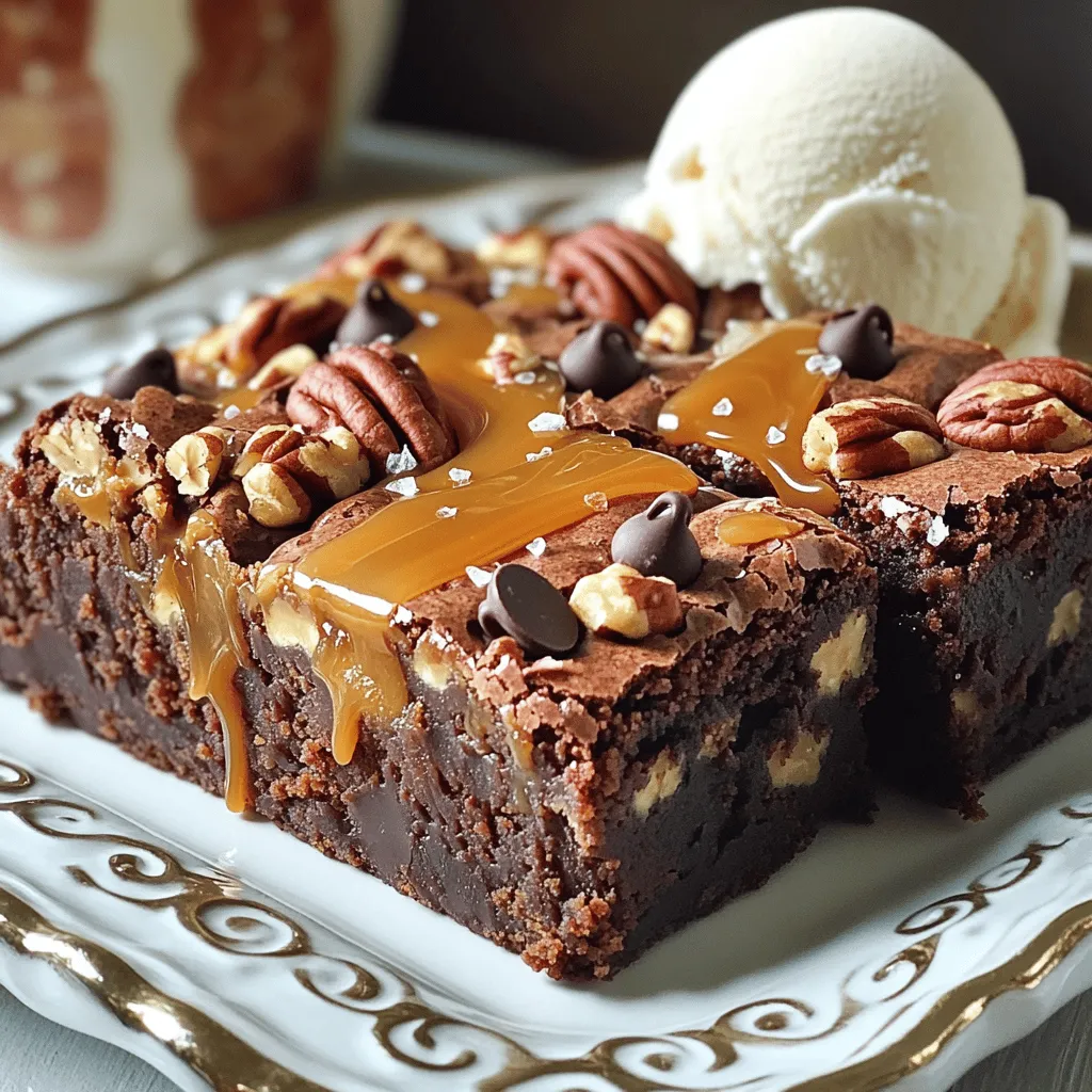 - 1 cup unsalted butter (equivalent to 2 sticks) - 2 cups granulated sugar - 4 large eggs - 1 teaspoon pure vanilla extract - 1 cup all-purpose flour - 1 cup unsweetened cocoa powder - ½ teaspoon kosher salt - 1 cup pecans, chopped - 1 cup chocolate chips (semi-sweet or dark) - 1 cup caramel sauce (can be store-bought or homemade) - Flaky sea salt, for a finishing sprinkle To make Caramel Pecan Turtle Brownies, you need rich, simple ingredients. Each one plays a key role in flavor and texture. First, unsalted butter creates a rich base. Granulated sugar adds sweetness and helps the brownies rise. Eggs bind the mix and give it a nice lift. Pure vanilla extract brings warmth and depth to the taste. Next, all-purpose flour provides structure. Unsweetened cocoa powder gives that deep chocolate flavor we crave. Kosher salt enhances the sweetness and balances the flavors. Chopped pecans add crunch and a nutty taste. Chocolate chips melt into the brownies, giving pockets of gooey goodness. Caramel sauce adds sweetness and a sticky, decadent layer. Finally, flaky sea salt on top gives a perfect finish, making each bite special. These ingredients blend to create a dessert that is both rich and comforting. Each element contributes to the overall taste. So, gather these items, and get ready to bake! - Preheat the oven to 350°F (175°C). - Prepare a 9x13 inch baking pan. You can grease it with butter or line it with parchment paper. This helps with easy removal of the brownies later. - Start by melting the unsalted butter in a medium saucepan over medium heat. Once it melts, take it off the heat. - Stir in the granulated sugar until it mixes well and is smooth. - Now, add the eggs one by one. Mix each egg in well before adding the next. - Next, stir in the pure vanilla extract. This adds a nice flavor to the batter. - In another bowl, sift together the all-purpose flour, unsweetened cocoa powder, and kosher salt. - Gently fold this dry mix into the wet mixture. Be careful not to overmix. This keeps the brownies fudgy. - Finally, fold in the chopped pecans and chocolate chips. Make sure they spread evenly in the batter. - Pour half of the brownie batter into the prepared baking pan. Spread it evenly across the bottom. - Drizzle half of the caramel sauce over the brownie layer. You can spread it slightly with a spatula if needed. - Carefully pour the rest of the brownie batter over this caramel layer. Spread it gently to avoid mixing with the caramel. - Now, drizzle the remaining caramel sauce over the top. - Use a toothpick or a knife to swirl the caramel into the brownie batter. Make sure to leave some caramel visible on the surface. - Put the pan in your preheated oven. Bake for 25-30 minutes. - To check if they are done, insert a toothpick into the center. It should come out with a few moist crumbs, not wet batter. - After baking, take the pan out of the oven. Let the brownies cool in the pan for at least 15 minutes. - Before cutting, sprinkle a pinch of flaky sea salt on top. This enhances the sweet flavors. - Once cooled, cut the brownies into squares. You can serve them warm or let them cool to room temperature. Enjoy! To get that fudgy texture, mix the batter gently. When you add the dry ingredients, stir until just combined. Overmixing can make your brownies cakey instead of fudgy. Checking doneness is vital. Insert a toothpick in the center; it should come out with a few moist crumbs. If it’s clean, you may have baked them too long. Use high-quality chocolate chips for deeper flavor. Semi-sweet or dark chocolate chips work best. They bring richness that enhances the overall taste of the brownies. You can add extra toppings to boost flavor. Try sprinkling extra chopped pecans or chocolate chips on top before baking. A pinch of flaky sea salt can also make a big difference. Serve the brownies on a nice platter. Drizzle additional caramel sauce on top for a beautiful look. Garnish with more chopped pecans for that extra touch. Pair each brownie with a scoop of creamy vanilla ice cream. The cold ice cream complements the warm brownies perfectly. Whipped cream is another great option for a delightful finish. {{image_4}} You can make these brownies gluten-free. Use a gluten-free flour blend instead of all-purpose flour. This swap keeps the brownies rich and tasty. For vegan substitutes, replace eggs with flax eggs. Mix one tablespoon of ground flaxseed with three tablespoons of water and let it sit until thick. Use a plant-based butter for a dairy-free option. It works well and keeps the brownies moist. If you want to change the nuts, try walnuts or almonds. They add a new texture and flavor. You can also skip the nuts for a nut-free version. For different sauce variations, try chocolate sauce or peanut butter. These can add fun flavors to your brownies. You can mix sauces together for a unique twist. Adding fruits can elevate your brownies. Chopped cherries or raspberries can bring a fresh taste. You can also add spices like cinnamon for warmth. Seasonal variations can make your brownies special. For fall, add pumpkin spice. For winter, consider peppermint extract. These twists can create a festive treat for any holiday. Store your leftover brownies in a cool, dry place. Use an airtight container to keep them fresh. This helps prevent them from drying out. Layer parchment paper between the brownies to avoid sticking. * Recommended containers: - Airtight glass containers - Plastic food storage containers - Aluminum foil wraps If you want to save some brownies for later, freezing works well. First, cut the brownies into squares. Wrap each square in plastic wrap. Then, place the wrapped brownies in a freezer-safe bag. * Proper freezing techniques: - Ensure brownies are fully cooled before wrapping - Remove as much air as possible to prevent freezer burn To enjoy your frozen treats, thaw them in the fridge overnight. You can also warm them in the microwave for a few seconds. This brings back thei