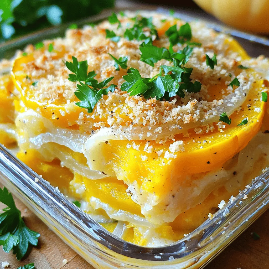 - 4 cups yellow squash - 1 cup onion - 2 cloves garlic - 1 cup sharp cheddar cheese - ½ cup heavy cream The main ingredients for Cheddar Squash Casserole are simple yet full of flavor. The yellow squash brings a mild sweetness and soft texture. I like to slice it into 1/4-inch rounds for even cooking. Onion and garlic add depth and aroma. Sharp cheddar cheese gives the dish a rich, tangy flavor. Heavy cream adds creaminess to blend all the ingredients well. Each bite is a delicious mix of tastes and textures. - Breadcrumbs (gluten-free options) - Different types of cheese - Seasoning alternatives You can easily change the casserole to fit your taste. If you need gluten-free options, use gluten-free breadcrumbs. You can also swap in different cheeses, like mozzarella or gouda, for a new twist. If you want to add more flavor, think about using herbs like rosemary or basil. This flexibility makes the dish fun and unique for everyone. - Fresh parsley Garnishing with fresh parsley adds a pop of color and freshness. I love to sprinkle it on top just before serving. It makes the dish look appealing and brightens the flavors. You can also try other herbs like thyme or chives for a different touch. This small step makes a big difference in the final presentation. For a complete guide, check out the Full Recipe. First, preheat your oven to 350°F (175°C). This helps your casserole cook evenly. Next, take a 9x13-inch baking dish and lightly grease it with olive oil. Use about one tablespoon to coat the bottom and sides. This step is key to keep your casserole from sticking. Now, let's cook the veggies. In a large skillet, heat the remaining tablespoon of olive oil over medium heat. When the oil shimmers, add the diced onion and minced garlic. Sauté them for about five minutes. You want the onions to become soft and fragrant. Keep stirring to avoid burning. After that, add the sliced yellow squash to the skillet. Toss everything well. Cook for another 10 to 12 minutes, stirring occasionally. You want the squash to be tender and just starting to turn golden. This adds a nice depth of flavor. In a large mixing bowl, combine the cooked squash mixture with the following ingredients: - 1 cup sharp cheddar cheese, shredded - 1 cup breadcrumbs - ½ cup heavy cream - 2 large eggs, beaten - 1 teaspoon salt - ½ teaspoon freshly ground black pepper - 1 teaspoon dried thyme Mix everything well. This ensures every bite is packed with flavor. Once mixed, pour the mixture into the prepared baking dish. Spread it evenly with a spatula. Finally, sprinkle ½ cup grated Parmesan cheese on top. This creates a crispy layer when baked. Your casserole is now ready for the oven. Bake for 25 to 30 minutes. Look for a golden brown top and bubbly edges. Enjoy your flavorful family favorite! For the full recipe, refer to the earlier section. To ensure that your squash is tender, cut it into 1/4-inch rounds. This size allows for even cooking. Sauté the squash until it is slightly golden. This adds a nice depth of flavor. Use medium heat for perfect cooking. Stir often to avoid burning. Mixing evenly is crucial. When you combine your ingredients, make sure everything gets coated well. This helps all the flavors blend. If you don’t mix enough, some bites may taste bland. Take your time to fold in the cheese, cream, and eggs. A good mix makes a big difference. For a lovely presentation, serve the casserole in the baking dish. It gives a warm, homey feel. If you prefer, spoon portions onto plates. Garnish with fresh parsley for a pop of color. This small touch makes your dish look gourmet. As for side dishes, consider a simple green salad. It adds freshness and crunch. You can also serve crusty bread for dipping. This combo pairs well with the creamy casserole. One common mistake is overcooking the squash. If it gets too soft, it loses texture. Keep an eye on it while sautéing. You want it tender but not mushy. Another mistake is not mixing your ingredients thoroughly. If you skip this step, some parts of the casserole may be dry. Make sure to blend everything well. A good mix ensures a tasty and cohesive dish. For the full recipe and steps, click [Full Recipe]. {{image_4}} You can swap out the cheddar for many other cheeses. Try mozzarella for a mild taste. Feta adds a salty kick. Goat cheese gives a tangy twist. Each cheese shifts the flavor. It keeps your casserole new and exciting. Want to make it heartier? Add protein. Ground turkey or chicken works well. You can also use cooked sausage for a savory punch. If you prefer plant-based, black beans or chickpeas are great options. They add texture and nutrients. Using seasonal veggies makes this dish shine. In summer, add fresh zucchini or bell peppers. Fall brings sweet potatoes and kale. Winter calls for hearty root vegetables. Each season, the casserole can taste different and delightful. For more tips and a complete recipe, check the Full Recipe above. After baking, let the casserole cool for about 5 to 10 minutes. This helps it set and makes serving easier. Once cooled, cover it with plastic wrap or aluminum foil. Keep it in the fridge if you plan to eat it within a few days. Proper cooling avoids sogginess and keeps flavors fresh. To reheat the casserole, use the oven for the best results. Preheat to 350°F (175°C). Place the casserole in an oven-safe dish and cover it with foil. Heat for about 20 to 25 minutes. This method helps keep the texture creamy and the top crispy. You can also use the microwave, but the oven gives better results. If you want to save some for later, freezing is a great option. First, let the casserole cool completely. Then, cut it into portions for easy heating later. Wrap each piece tightly with plastic wrap and then aluminum foil. Store them in the freezer. When you're ready to eat, thaw in the fridge overnight and reheat in the oven. This way, you can enjoy a tasty meal anytime! For the full recipe, check out the earlier section. Cheddar S