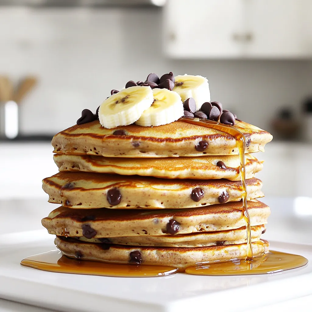 For a beautiful presentation, layer the pancakes and drizzle with syrup. Top with banana slices and a final sprinkle of chocolate chips. This not only looks great but tastes wonderful too!
