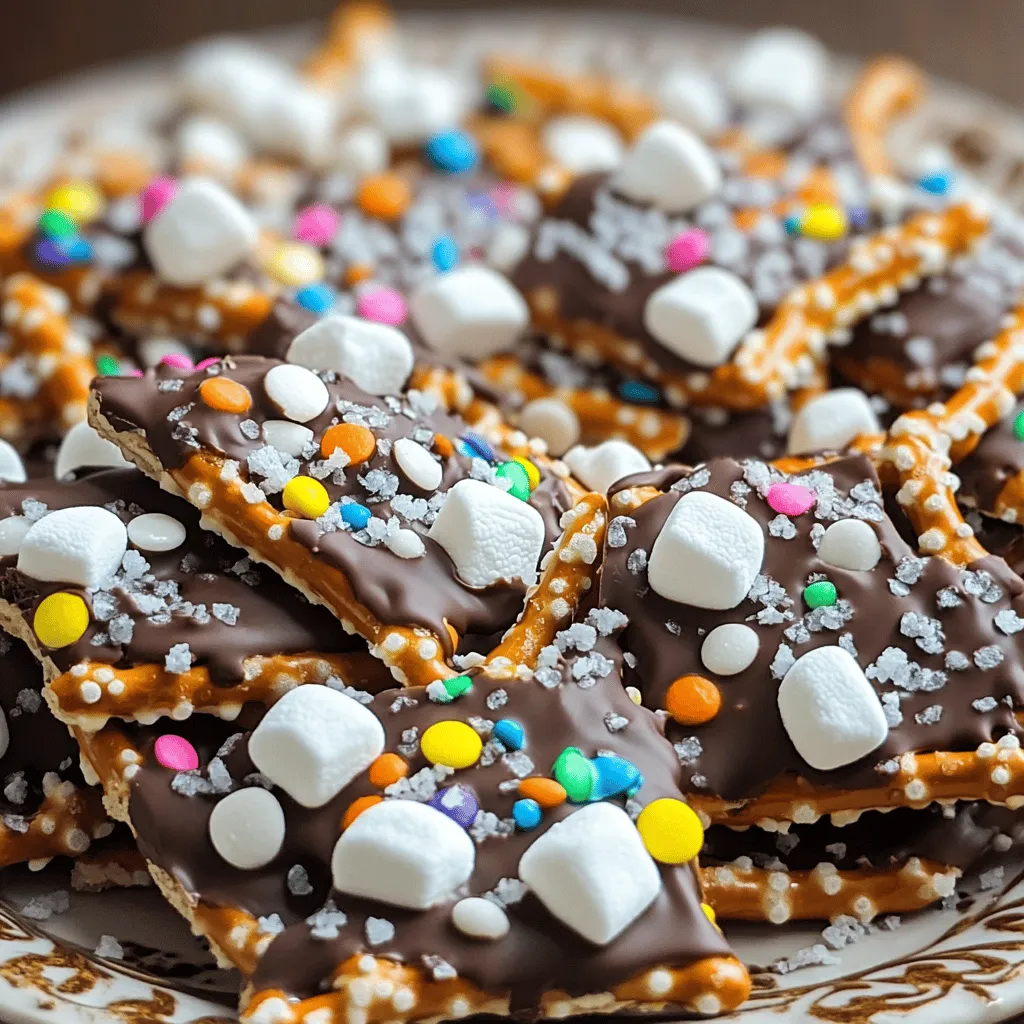 - 1 cup pretzel rods, broken into smaller pieces - 1 cup milk chocolate chips - 1 cup white chocolate chips - 1/2 cup mini marshmallows - 1/4 cup crushed graham crackers - 1/4 cup rainbow sprinkles - Sea salt, for a light sprinkle When measuring ingredients, use measuring cups for dry items. For chips, scoop and level off. Make sure to break pretzel rods into smaller pieces. This helps them mix well with the chocolate. For chocolate chips, I recommend using a kitchen scale if you have one. One cup of chips is usually about 6 ounces. This can help you get it just right. You can make this bark your own! Try using dark chocolate instead of milk chocolate. It adds a rich taste. You can also add nuts like almonds or pecans for a crunch. Dried fruits, like cranberries, can add a sweet and tangy touch. Feeling festive? Use colored sprinkles that match a holiday! First, preheat your oven to 350°F (175°C). Line your baking sheet with parchment paper. This helps the bark come off easily later. In a large bowl, add 1 cup of broken pretzel rods. Toss in half of the rainbow sprinkles. Mix gently until combined. Spread this mixture evenly on the baking sheet to make a nice layer. Next, grab a microwave-safe bowl to melt the chocolate. Start with the milk chocolate chips. Heat them in the microwave for 30 seconds. Stir the chocolate and heat again in 30-second bursts until it is smooth. Pour the melted milk chocolate over the pretzel layer. Make sure to cover it well. Now, melt the white chocolate chips using the same method. Drizzle the white chocolate over the milk chocolate. Use a knife to swirl the two chocolates for a fun design. Now it’s time to add toppings! Scatter mini marshmallows, crushed graham crackers, and the rest of the rainbow sprinkles over the chocolate layers. This adds great texture and looks nice too. For a tasty twist, sprinkle sea salt on top. It brings out the chocolate's flavor. Place the baking sheet in the fridge for at least 1 hour. Once the chocolate is hard, break the bark into pieces. Enjoy your sweet treat! When melting chocolate, consistency is key. Here are some tips to help you: - Use a microwave-safe bowl. - Chop the chocolate into small pieces. - Heat in 30-second intervals. - Stir after each interval to check the progress. - Stop when the chocolate is mostly melted. - Stir until smooth and shiny. This method prevents overheating. Overheated chocolate can seize and become grainy. To create a stunning swirl, follow these steps: 1. Melt both milk and white chocolate separately. 2. Pour the milk chocolate over the pretzel layer first. 3. Drizzle the white chocolate on top. 4. Use a knife or skewer to swirl gently. Be careful not to mix them completely. You want distinct swirls for visual appeal. Presentation matters when serving your bark. Here are some fun ideas: - Use a decorative plate for an elegant look. - Drizzle more melted chocolate over the top. - Cut the bark into fun shapes with cookie cutters. - Package pieces in clear bags with ribbons for gifts. These tips add charm and make your treat stand out. Enjoy sharing your delicious creation! {{image_4}} You can change the flavor of your chocolate covered pretzel bark in fun ways. Try using dark chocolate for a richer taste. It pairs well with the salty pretzels. You can also use white chocolate only for a sweeter treat. If you love peanut butter, mix in some peanut butter chips. This adds a nutty flavor that makes each bite special. Get creative with your toppings! Instead of marshmallows, use nuts like almonds or pecans. This adds a nice crunch. Dried fruits like cranberries or apricots also work well. They give a chewy texture that contrasts with the crunch of pretzels. You can even sprinkle on some coconut flakes for a tropical twist. Make your bark match the seasons! For holidays, use festive colors. Add red and green sprinkles for Christmas or orange and black for Halloween. For Easter, pastel-colored candies can brighten up your bark. You can even shape the bark into hearts for Valentine's Day. This makes your treat extra special for any occasion. To keep your chocolate covered pretzel bark fresh, store it in an airtight container. This helps to keep moisture out. Line the container with wax paper to prevent sticking. If you cut the bark into pieces, place parchment paper between layers to avoid clumping. Chocolate covered pretzel bark lasts about two weeks at room temperature. Keep it cool and dry for best results. If you want to store it longer, you can freeze it. Wrap each piece in plastic wrap, then place them in a freezer bag. It can last up to three months in the freezer. When you’re ready to eat it, let it thaw in the fridge overnight. For a sweet gift, use clear gift bags. Place a few pieces of bark inside and tie them with a colorful ribbon. You can also use small boxes. Add a layer of tissue paper for a nice touch. This way, your friends will love the look and taste of your homemade treat! Yes, you can use different types of chocolate. You might try dark chocolate or even flavored chocolates. Each type brings a new taste to your treat. Dark chocolate gives a rich flavor, while white chocolate adds sweetness. Feel free to mix and match to find your favorite blend. To keep chocolate from seizing, avoid moisture. Make sure all bowls and utensils are dry. When melting, use short bursts in the microwave. Stir between each burst to help it melt evenly. If chocolate does seize, you can try adding a small amount of vegetable oil. This can help bring it back to a smooth state. If your bark is too thick, you can break it into smaller pieces. This makes it easier to eat. Next time, you can spread the chocolate layer thinner on the pretzels. Also, try using a larger baking sheet. This way, the chocolate spreads out more, and the bark will be thinner. You now have all the know-how to make chocolate covered pretzel bark. Remember the key ingredients and tips. Melting chocolate is easy if you follow the 