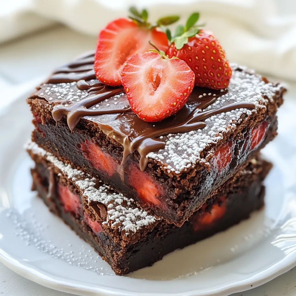 - 1 cup unsalted butter, melted - 1 cup granulated sugar - 1 cup packed brown sugar - 4 large eggs - 1 teaspoon vanilla extract - 1 cup all-purpose flour - 1/2 cup unsweetened cocoa powder - 1/2 teaspoon salt - 1 1/2 cups fresh strawberries, hulled and halved - 1 cup semisweet chocolate chips - 1/2 cup heavy cream - 1 tablespoon powdered sugar (optional for dusting) These ingredients make the brownies rich and creamy. The butter adds moisture, while the sugars bring sweetness. The strawberries give a fresh burst of flavor. - Nuts (like walnuts or pecans) for added crunch - Sea salt for a savory finish - Vanilla bean for a deeper vanilla flavor - Different types of chocolate chips for variety Using optional ingredients lets you make this recipe your own. You can mix and match based on your taste. - 9x13-inch baking pan - Parchment paper - Mixing bowls - Whisk - Spatula - Saucepan for ganache - Toothpick for testing doneness These tools help you prepare and bake the brownies easily. The parchment paper makes it simple to lift the brownies out of the pan. {{ingredient_image_2}} Start by preheating your oven to 350°F (175°C). Grab a 9x13-inch baking pan. Grease the pan and line it with parchment paper. Make sure the paper hangs over the edges. This helps you lift out the brownies easily later. In a large bowl, mix melted butter with granulated and brown sugars. Use a whisk to blend them until smooth. This step is key for a rich brownie base. Add the eggs one at a time. Whisk after each egg until fully combined. Then, stir in the vanilla extract. This adds flavor and richness to the brownies. In another bowl, whisk together flour, cocoa powder, and salt. Gradually fold this dry mix into the wet ingredients. Be gentle and mix until just combined. Overmixing can make brownies tough. Pour half of the brownie batter into the prepared pan. Use a spatula to spread it evenly. Next, place halved strawberries on top, cut-side up. Spread the remaining brownie batter over the strawberries, covering them completely. Place the pan in the oven and bake for 25-30 minutes. To check if they’re done, insert a toothpick into the center. It should come out with a few moist crumbs, not wet batter. While the brownies bake, make the chocolate ganache. Heat heavy cream in a small saucepan over medium heat until it simmers. Remove from heat and add semisweet chocolate chips. Stir until smooth and glossy. After baking, let the brownies cool in the pan for about 10 minutes. Use the parchment to lift them out and transfer to a wire rack. Allow them to cool completely. Once cool, pour the chocolate ganache over the top and spread it evenly. For a fancy finish, dust the top with powdered sugar. This adds a nice touch when you slice the brownies. Serve them on a decorative platter, and enjoy your delicious treat! To create perfect brownies, keep a few tips in mind: - Use room temperature eggs. This helps them blend well with other ingredients. - Don't overmix the batter. Mix just until combined for a fudgy texture. - Use high-quality cocoa powder. This enhances the chocolate flavor. - Check your oven temperature. An oven thermometer ensures accurate baking. - Let them cool completely. This helps the brownies set and makes cutting easier. Avoid these common mistakes for the best results: - Skipping the parchment paper. This can make it hard to lift the brownies out. - Not measuring ingredients accurately. This can affect the texture and taste. - Opening the oven door too early. This can cause the brownies to sink in the middle. - Using old baking powder or baking soda. Fresh ingredients are key for rise and texture. - Cutting brownies while warm. Let them cool for clean cuts and nice squares. Creating a smooth ganache is simple with these practices: - Heat cream gently. Bring it to a light simmer, not a boil. - Use good chocolate. Quality chocolate chips make a big difference. - Stir thoroughly. Mix until the ganache is shiny and smooth. - Let it cool slightly before pouring. This helps it set on the brownies. - Use a spatula for even coverage. This ensures a nice finish on your brownies. Pro Tips Use Room Temperature Ingredients: Make sure your eggs and butter are at room temperature for better incorporation and a smoother brownie batter. Don't Overmix the Batter: Stir the dry ingredients into the wet ingredients just until combined to ensure the brownies remain fudgy and tender. Choose Ripe Strawberries: Select strawberries that are ripe and sweet for the best flavor and texture contrast against the rich brownie base. Let Ganache Set Properly: Allow your chocolate ganache to set at room temperature for an ideal consistency that glazes beautifully without being too runny. {{image_4}} You can swap strawberries for many other fruits. Ripe raspberries, blueberries, or sliced bananas work great. Each fruit adds its own taste and charm. For a fun twist, try using tart cherries or even slices of peaches. Just remember to adjust the amount based on the fruit's moisture. This keeps your brownies from getting too soggy. While semisweet chocolate chips are classic, you can mix it up. Dark chocolate chips give a richer taste. Milk chocolate chips can add sweetness. For a unique flair, use white chocolate or even a mix of chocolates. You can also melt chocolate bars instead of using chips. This adds a smooth texture to your ganache. To make these brownies gluten-free, use a 1:1 gluten-free flour blend. This keeps the texture similar to the classic version. For a vegan option, swap the eggs with flax eggs or applesauce. Use coconut cream instead of heavy cream for the ganache. Choose dairy-free chocolate chips for a fully vegan treat. These changes keep the flavor while catering to different diets. To keep your brownies fresh, let them cool completely. Then, place them in an airtight container. This will keep them moist and tasty. You can leave them at room temperature for up to three days. If you want to keep them longer, consider