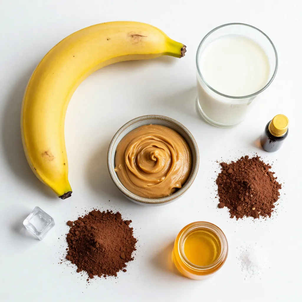 Each ingredient plays a key role. The ripe banana is sweet and creamy. Natural peanut butter adds a rich flavor. Unsweetened almond milk keeps it light. Chocolate protein powder gives it a protein boost. Unsweetened cocoa powder enhances the chocolate taste. Sweeten with honey or maple syrup if you like. Vanilla extract adds depth. Sea salt balances all the flavors. Ice cubes chill the drink for hot days.