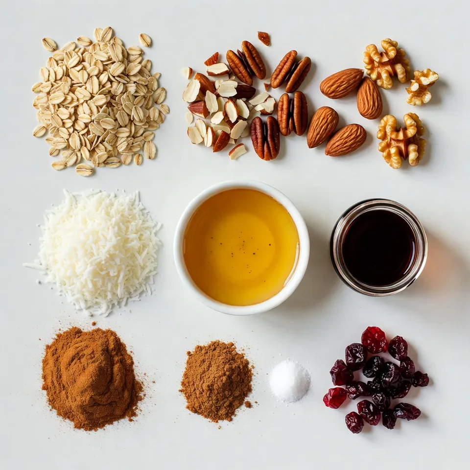 Gather these simple ingredients for your Cinnamon Maple Granola Clusters. The rolled oats form the base. The mixed nuts add crunch and protein. Shredded coconut gives a nice chew. Honey or maple syrup binds everything together and adds sweetness. Almond butter adds richness. Vanilla extract boosts flavor, while cinnamon brings warmth. Sea salt balances the taste. If you like, toss in dried cranberries or raisins for extra sweetness and texture.