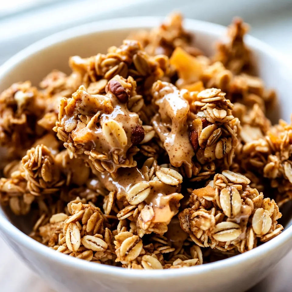 A delicious and healthy granola recipe featuring clusters of oats, nuts, and a hint of cinnamon, perfect for snacking or as a breakfast topping.