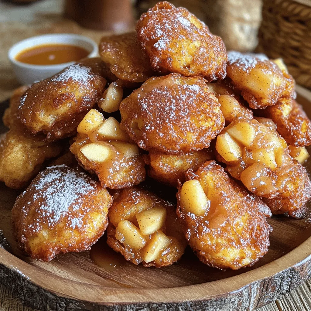 - 2 medium apples (Granny Smith or Honeycrisp) - 1 cup all-purpose flour - 1/4 cup granulated sugar - 1 teaspoon baking powder - 1/2 teaspoon ground cinnamon (plus extra for sprinkling) - 1/4 teaspoon salt - 1/2 cup milk - 1 large egg - 1 teaspoon vanilla extract - Vegetable oil for frying - 1/2 cup powdered sugar for coating - Mixing bowls - Whisk - Slotted spoon - Deep frying pan - Cooking thermometer When I make cinnamon sugar apple fritters, I focus on fresh ingredients. First, I choose two medium apples. Granny Smith or Honeycrisp work best for a sweet and tart flavor. Next, I gather my dry ingredients. I need one cup of all-purpose flour, a quarter cup of granulated sugar, one teaspoon of baking powder, half a teaspoon of ground cinnamon, and a quarter teaspoon of salt. In another bowl, I measure half a cup of milk, one large egg, and one teaspoon of vanilla extract. These wet ingredients help bind everything together. I also prepare vegetable oil for frying. It needs to be deep enough to hold about two inches. Lastly, I have half a cup of powdered sugar ready for coating. This will make my fritters sweet and delicious. For equipment, I need mixing bowls to combine ingredients. A whisk helps mix the wet ingredients smoothly. A slotted spoon is great for removing the fritters from hot oil. A deep frying pan is essential for cooking, and a cooking thermometer ensures the oil is at the right temperature. With all these ingredients and tools, I'm ready to create a tasty treat. - In a medium bowl, combine: - 1 cup all-purpose flour - 1/4 cup granulated sugar - 1 teaspoon baking powder - 1/2 teaspoon ground cinnamon - 1/4 teaspoon salt Whisk these dry ingredients until they are free of lumps. - In another bowl, mix: - 1/2 cup milk - 1 large egg - 1 teaspoon vanilla extract Whisk them together until smooth. - Slowly pour the wet mixture into the dry mix. Stir gently until just combined. It’s okay if some lumps remain. - Carefully fold in: - 2 medium apples, peeled and finely diced. Ensure the apples are evenly mixed into the batter. - In a deep frying pan, heat about 2 inches of vegetable oil. Use a thermometer to check the temperature. Heat the oil to 350°F (175°C). - Once the oil is hot, drop spoonfuls of the batter into the oil. Be sure not to overcrowd the pan. - Fry each fritter for about 3-4 minutes until golden brown. Then, flip them and fry for another 3-4 minutes on the other side. - Using a slotted spoon, remove the fritters from the oil. Let them drain on paper towels to absorb excess oil. - While still warm, roll each fritter in a mix of: - 1/2 cup powdered sugar - A sprinkle of cinnamon This adds a sweet and spicy touch to each fritter. - Let the fritters cool slightly on a wire rack before serving. Enjoy them warm for a delightful treat! - Maintaining the right oil temperature: Heat the oil to 350°F (175°C). Use a thermometer to check. This keeps the fritters crispy and golden. If the oil is too cool, the fritters will soak up oil. If it's too hot, they will burn quickly. - Avoiding overcrowding in the frying pan: Fry just a few fritters at a time. This helps them cook evenly. Overcrowding lowers the oil temperature and makes them soggy. Give each fritter space to rise and float. - Choosing the best type of apple: Use Granny Smith or Honeycrisp apples. These apples have great flavor and hold their shape well when cooked. They add a nice tartness that balances the sweetness of the fritters. - Tips for perfecting the batter consistency: Mix the wet and dry ingredients until just combined. Lumps are okay! A thick batter helps the fritters hold their shape. If it’s too runny, add a little more flour. - Arranging fritters on a serving plate: Stack the fritters in a nice pile. Dust with powdered sugar for a sweet finish. Use a beautiful plate to make them look special. - Pairing with dips like maple syrup or caramel: Serve with small bowls of maple syrup or warm caramel sauce. These dips add a fun twist and enhance the flavors of the fritters. {{image_4}} You can make your fritters even better by adding nuts or raisins. Chopped walnuts or pecans add a nice crunch. Raisins bring sweetness and chewiness to each bite. Mix in about 1/2 cup of either option when you fold in the apples. You might also want to try adding spices like nutmeg or cloves. A pinch of nutmeg can enhance the warm flavors. Cloves add a bold taste that pairs well with apples. Just a touch goes a long way, so start with 1/4 teaspoon and adjust to your liking. If you need gluten-free fritters, swap the all-purpose flour for a gluten-free blend. There are many great mixes available. Make sure they work well for frying, as some can be too dense. For a vegan version, replace the egg with a flax egg. Mix 1 tablespoon of ground flaxseed with 2.5 tablespoons of water. Let it sit for 5 minutes until it thickens. Use plant-based milk instead of dairy milk. Almond or oat milk works great in this recipe. To keep your fritters fresh, store them in an airtight container. This helps seal in moisture, keeping them soft and tasty. You can use a plastic container or a resealable bag. Make sure the fritters are completely cool before storing. Placing warm fritters in a container can create steam, making them soggy. - Best ways to store fritters for freshness: - Use an airtight container. - Let fritters cool fully before sealing. - Recommended storage containers: - Plastic food storage containers. - Resealable plastic bags. To enjoy your fritters again, reheating is key. You want them warm and fluffy, not dry. The oven works best, but you can use a microwave in a pinch. - How to reheat fritters without losing moisture: - Preheat your oven to 350°F (175°C). - Place fritters on a baking sheet. - Heat for about 5-10 minutes. - Alternative heating methods (oven vs. microwave): - Oven: Best for keeping fritters crisp. - Microwave: Quick option, but can make them soft. Use a paper towel to cover fritters. To make cinnamon sugar a