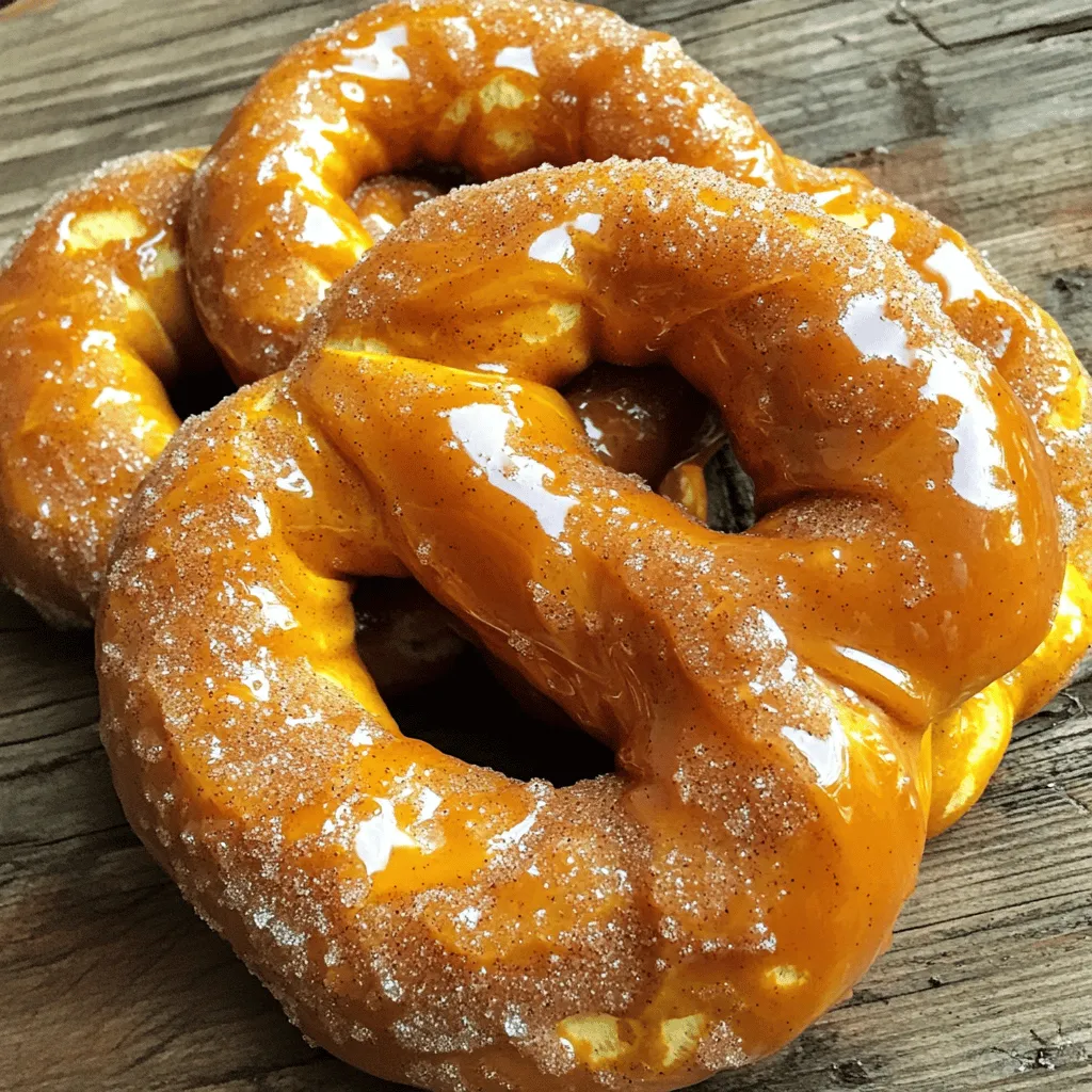 - 1 cup canned pumpkin puree - 1/4 cup packed brown sugar - 1/4 cup granulated sugar - 1 teaspoon pure vanilla extract - 1/2 teaspoon ground cinnamon - 2 1/4 teaspoons active dry yeast (1 packet) - 1/4 cup warm water (approximately 110°F) - 3 cups all-purpose flour - 1 teaspoon salt - 1/4 teaspoon ground nutmeg - 1/2 cup baking soda (for boiling) - 1 egg, beaten (for egg wash) - Additional granulated sugar and cinnamon for coating (about 1/4 cup each) These ingredients create a tasty treat that’s perfect for fall. The pumpkin puree gives the pretzels a soft texture and a rich flavor. Using both brown sugar and granulated sugar adds depth to the sweetness. Vanilla extract and spices like cinnamon and nutmeg enhance the warm flavors. The yeast is key for making the dough rise. Warm water helps activate the yeast. All-purpose flour provides the structure for the pretzels. Salt balances the sweetness and brings out all the flavors. Baking soda is crucial for boiling the pretzels. It gives them that classic pretzel taste and texture. The egg wash makes the tops golden and shiny. Finally, a sprinkle of cinnamon-sugar adds the finishing touch, making these pretzels irresistible. Gather these ingredients, and you are ready to create a delightful batch of cinnamon sugar pumpkin pretzels! 1. Start by mixing 1/4 cup warm water with 2 1/4 teaspoons active dry yeast in a small bowl. 2. Let it sit for 5-10 minutes. Watch for bubbles. This shows the yeast is active. 3. In a large bowl, combine 1 cup pumpkin puree, 1/4 cup brown sugar, 1/4 cup granulated sugar, 1 teaspoon vanilla extract, 1/2 teaspoon ground cinnamon, and 1/4 teaspoon ground nutmeg. 4. Stir until the mixture is smooth and well blended. 5. Once your yeast is frothy, add it to the pumpkin mixture and stir thoroughly. 1. Gradually mix in 3 cups all-purpose flour and 1 teaspoon salt. Stir until a soft dough forms. 2. Transfer the dough to a lightly floured surface. 3. Knead the dough for 5-7 minutes. It should be smooth and elastic. 1. Place the kneaded dough in a greased bowl. Cover it with a clean towel. 2. Let it rise in a warm spot for about 1 hour, until it doubles in size. 3. After rising, punch down the dough gently. 4. Divide the dough into 8 equal pieces. 5. Roll each piece into a long rope. Shape each rope into a pretzel. 1. Preheat your oven to 425°F (220°C). Line a baking sheet with parchment paper. 2. In a large pot, bring 8 cups of water to a boil. Add 1/2 cup baking soda. 3. Drop each pretzel into the boiling water. Boil for 30 seconds, flipping halfway. 4. Remove them with a slotted spoon and place them on the baking sheet. 5. Brush each pretzel with a beaten egg. 6. Generously sprinkle with cinnamon and sugar. 7. Bake for 12-15 minutes until golden brown. 8. Let the pretzels cool on the baking sheet before serving. Enjoy these warm, tasty treats with your favorite dip! - Ensuring the right dough texture: The dough should feel soft and slightly sticky. If it’s too dry, add a bit more water. If it’s too wet, sprinkle in more flour. You want a dough that holds its shape but is still easy to work with. - How to check if the yeast is active: Mix warm water with yeast and let it sit for about 5-10 minutes. Tiny bubbles will form on top if the yeast is good. If you see no foam, the yeast may be old or the water too hot. - Alternatives for pumpkin puree: You can use butternut squash puree or sweet potato puree if you don’t have pumpkin. Both give a similar taste and texture. - Sugar options and spice variations: Try using coconut sugar or honey instead of brown sugar. You can also mix in a pinch of ginger or cloves for a different spice kick. {{image_4}} You can easily change up the flavor of your cinnamon sugar pumpkin pretzels. Here are a few ideas: - Adding chocolate chips or nuts: Stir in semi-sweet chocolate chips or chopped nuts. Both options add a great crunch and flavor. Try walnuts or pecans for a nutty twist. - Incorporating different spices: Along with cinnamon, you can add ginger or cloves. This will give your pretzels a warm, autumn spice flavor. Just a pinch is enough to change things up. Dipping sauces can take your pretzels to the next level. Here are some tasty options: - Cream cheese dip recipes: Mix cream cheese with a bit of sugar and vanilla. This dip is smooth and pairs well with the sweetness of the pretzels. - Pumpkin spice dip recommendations: Blend cream cheese with pumpkin puree, sugar, and pumpkin spice. This dip echoes the flavors in the pretzels, making it a perfect match. Feel free to mix and match these ideas to find your favorite flavor combinations! To store your leftover pretzels, let them cool completely first. Place them in an airtight container. You can also wrap them in plastic wrap. This keeps them fresh for about 2-3 days at room temperature. If you want to keep them longer, store them in the fridge. Just remember to reheat them before serving. For reheating, preheat your oven to 350°F (175°C). Place the pretzels on a baking sheet. Heat them for about 5-10 minutes. This warms them up and makes them taste fresh again. You can also use a microwave, but the oven gives better results. Freezing pretzels is easy and a great way to save some for later. Once they are cool, wrap each pretzel in plastic wrap. Then, place them in a freezer bag. Squeeze out as much air as you can before sealing. This helps prevent freezer burn. To thaw, take a pretzel out of the freezer and unwrap it. Let it sit at room temperature for about 1 hour. You can also heat it straight from the freezer. Preheat your oven to 350°F (175°C) and bake for about 10-15 minutes. This way, you get a warm, tasty treat whenever you want! Yes, you can make these pretzels vegan. Simply replace the egg wash with a plant-based milk like almond or soy. This will still give them a nice shine. For the cream cheese dip, choose a vegan cream cheese. These pretzels stay fresh for about 2-3 days at room temperature. Store them in an 