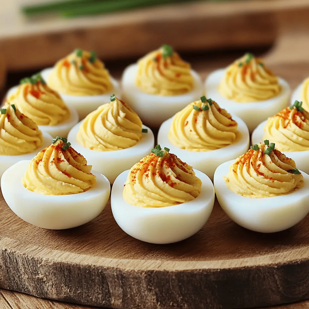 - 6 large eggs - 3 tablespoons mayonnaise - 1 teaspoon Dijon mustard - 1 teaspoon apple cider vinegar - 1/2 teaspoon smoked paprika I love the simplicity of deviled eggs. You only need a few key ingredients. First, you need 6 large eggs. They are the star of the dish. Next, you’ll add 3 tablespoons of mayonnaise. This gives the filling a creamy texture. Then, mix in 1 teaspoon of Dijon mustard for a little kick. A teaspoon of apple cider vinegar adds tang. Lastly, sprinkle in 1/2 teaspoon of smoked paprika for flavor and color. - Salt and black pepper to taste - 1 tablespoon finely chopped chives - 1 teaspoon hot sauce (optional for extra heat) - Extra chives and smoked paprika for garnish Seasoning makes a big difference. You’ll want to add salt and black pepper to taste. I also recommend 1 tablespoon of finely chopped chives. They bring a fresh taste. If you like heat, stir in 1 teaspoon of hot sauce. For the final touch, garnish with extra chives and a sprinkle of smoked paprika. This will make your deviled eggs look and taste amazing. For the full recipe, check out the instructions! - Prepare the Eggs: Begin by placing the 6 large eggs in a medium saucepan. Cover them with cold water, about an inch above the eggs. - Boil and Steam: Place the pot on the stove over medium-high heat. Bring the water to a rolling boil. Once boiling, cover the pot and remove it from the heat. Let the eggs sit in the hot water for 12 minutes. - Ice Bath: After 12 minutes, carefully transfer the eggs to a large bowl filled with ice water. Let them cool for at least 5 minutes. This makes peeling much easier. - Peeling Made Easy: After cooling, gently tap each egg on a hard surface to crack the shell. Peel the eggs under cool running water. This helps remove any stubborn shell pieces. - Egg Assembly: Slice each egg in half lengthwise. Scoop the yolks into a mixing bowl. Place the egg white halves on a serving platter, cut side up. - Mix the Filling: To the yolks, add 3 tablespoons of mayonnaise, 1 teaspoon of Dijon mustard, 1 teaspoon of apple cider vinegar, and 1/2 teaspoon of smoked paprika. Season with salt and black pepper to taste. Mix with a fork until smooth. - Add a Kick: If you like some heat, stir in 1 teaspoon of hot sauce. Taste the mixture and adjust the seasoning if needed. - Fill the Eggs: Spoon or use a piping bag to fill each egg white half with the yolk mixture. - Garnishing Touch: For a colorful finish, sprinkle extra smoked paprika and finely chopped chives on top. Now you have a tasty snack ready to impress! For the full recipe, check the recipe section. - Tips for Cooking Eggs: Use older eggs for easier peeling. Fresh eggs stick to their shells, making them hard to peel. Older eggs have a larger air cell, which helps separate the membrane from the shell. This saves time and frustration during prep. - Achieving Creamy Filling: Try different ratios of mayonnaise for texture. If you want a thicker filling, reduce the mayo slightly. For a creamier texture, add a touch more. Test different amounts to find the perfect mix that suits your taste. - Pairing Ideas: Deviled eggs go well with many dishes. Serve them with a fresh salad, crispy toast, or crunchy vegetables. For drinks, try pairing with a light white wine or sparkling water to balance the flavors. - Presentation Tips: Get creative when serving deviled eggs. Use a pretty platter or individual cups. You can even garnish with colorful herbs or edible flowers. A fun display makes your dish more inviting for guests. For the complete cooking process, check out the Full Recipe. {{image_4}} You can spice up your classic deviled eggs in fun ways. - Different Seasonings: Try adding curry powder for warmth, wasabi for a kick, or garlic for depth. Each brings a unique twist. - Tasty Add-ins: Think about adding bacon bits for crunch, olives for brininess, or pickles for tang. These extras can make your eggs stand out. Not everyone can enjoy classic deviled eggs as is. But you can adapt them easily. - Vegan Deviled Eggs: Swap egg yolks for creamy avocado or blended tofu. This keeps the texture smooth and adds healthy fats. - Low-Calorie Adjustments: You can use Greek yogurt or low-fat mayonnaise instead of regular mayo. This helps cut calories but still keeps that creamy flavor. For the full recipe, visit [Full Recipe]. Enjoy exploring these variations! To keep your deviled eggs fresh, always refrigerate them. Place the eggs in a clean, airtight container. Cover the container tightly to avoid any odors from the fridge. This method helps maintain the taste and texture of your deviled eggs. Deviled eggs can safely stay in the fridge for about 3 to 4 days. After that, they may lose their freshness and flavor. If you notice any off smells or changes in texture, it's best to toss them out for safety. You might wonder if you can freeze deviled eggs. However, it’s not recommended. Freezing alters the texture of both the egg whites and the filling. They may become watery and mushy once thawed. If you still want to freeze them, separate the yolk mixture from the whites. Freeze the yolk mixture in an airtight container. For thawing, move it to the fridge overnight. When ready, mix it with fresh egg whites for better texture. What’s the best way to prevent green yolks? Green yolks appear when eggs cook too long. To avoid this, use a timer. Cook eggs for exactly 12 minutes when boiling. After that, place them in ice water to stop cooking. This will keep your yolks bright yellow. Can I make deviled eggs ahead of time? Yes, you can make deviled eggs ahead. Prepare them a day in advance and store in the fridge. Keep the filling and egg whites separate until serving. This will keep them fresh and tasty. What’s the origin of deviled eggs? Deviled eggs date back to ancient Rome. They became popular in the U.S. in the 19th century. The term "deviled" refers to the spicy seasonings added to the filling. This dish is a classic for parties and gatherings. Why a