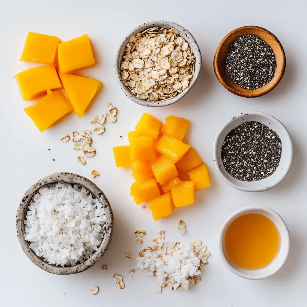 Each ingredient adds a unique taste and texture. The oats provide a hearty base. Dried mango gives a sweet, fruity flavor. Shredded coconut adds a nice chew. Honey or maple syrup binds everything together. Almond or peanut butter brings creaminess. Vanilla extract offers a warm aroma, while sea salt enhances all the flavors.
