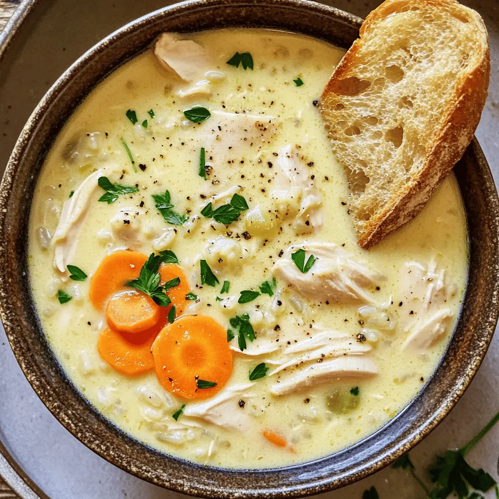For a tasty Creamy Chicken and Rice Soup, you need simple ingredients. Here’s what to gather: - 1 lb boneless, skinless chicken breasts, cut into small cubes - 1 cup long-grain white rice, thoroughly rinsed until the water runs clear - 1 medium onion, finely chopped - 2 cloves garlic, minced - 3 medium carrots, peeled and sliced into thin rounds - 2 celery stalks, diced into small pieces - 6 cups rich chicken broth (homemade or low sodium) - 1 cup heavy cream - 2 tablespoons extra virgin olive oil - 1 teaspoon dried thyme - 1 teaspoon dried oregano - Sea salt and freshly cracked black pepper, to taste These ingredients combine to create a warm, flavorful soup. The chicken adds protein, while the rice provides heartiness. The broth brings depth, and the cream makes it rich. To make your soup special, think about these garnishes: - Fresh parsley, finely chopped - Bread for dipping - Croutons for crunch These add a nice touch and enhance the overall meal. The parsley gives a pop of color, while bread or croutons add texture. Enjoy experimenting with your favorites! You can find the full recipe [here](Full Recipe). First, you need to chop the vegetables and cube the chicken. Take 1 medium onion and finely chop it. Next, peel and slice 3 medium carrots into thin rounds. Then, dice 2 celery stalks into small pieces. Finally, cut 1 pound of boneless, skinless chicken breasts into small cubes. These fresh ingredients will make your soup tasty and bright. Start by heating 2 tablespoons of extra virgin olive oil in a large pot over medium heat. Wait until the oil shimmers before moving on. Add the chopped onion and sauté for about 5 minutes, until soft and clear. Then, add 2 cloves of minced garlic, sliced carrots, and diced celery. Cook for another 3 to 4 minutes, stirring often, until the veggies soften and smell great. Next, toss in the diced chicken. Season the mix with sea salt, black pepper, 1 teaspoon of dried thyme, and 1 teaspoon of dried oregano. Cook for 6-8 minutes, stirring occasionally, until the chicken is no longer pink. After that, gradually pour in 6 cups of chicken broth while stirring. Bring your pot to a rapid boil. Once boiling, stir in 1 cup of rinsed long-grain white rice. Cover the pot with a lid, reduce the heat to low, and let it simmer for 20-25 minutes. Stir it now and then to keep the rice from sticking. When the rice is tender, remove the pot from the heat. Carefully stir in 1 cup of heavy cream to make the soup rich and creamy. Taste the soup and adjust the seasoning if needed. You can add more salt and black pepper to your liking. Finally, ladle the soup into bowls and garnish with fresh parsley for a lovely look. Enjoy your creamy chicken and rice soup, a true comfort meal! For a complete guide, refer to the Full Recipe. Simmering time is key for perfect rice. When you add the rice, reduce the heat and cover the pot. A gentle simmer helps the rice cook evenly. If the heat is too high, the rice may stick to the bottom. Aim for a simmer of about 20-25 minutes. This ensures the rice absorbs the broth well, making your soup creamy and rich. To boost the flavor, consider adding fresh herbs. Fresh thyme or rosemary can elevate the taste. You can also throw in bay leaves for an earthy hint. For a touch of heat, a pinch of red pepper flakes works wonders. Don't forget to taste as you go and adjust seasonings to your liking. One common mistake is overcooking the chicken. Cook it just until it’s no longer pink. This keeps the chicken juicy and tender. Another mistake is not rinsing the rice. Rinsing removes excess starch, preventing sticky rice. Always rinse until the water runs clear before adding to the pot. {{image_4}} You can easily switch up ingredients in this creamy chicken and rice soup. If you want a lighter option, try turkey instead of chicken. Tofu is a great choice for a vegetarian twist. For the rice, consider using brown rice or quinoa. Both options add unique flavors and textures. Just remember that different rice types may change the cooking time. Always check to ensure they are tender. To give your soup a new flair, add spices like cayenne or paprika. A pinch of cayenne adds warmth, while paprika can enhance the color and flavor. You can also toss in vegetables like peas or corn for extra taste and nutrition. These small tweaks can make a big difference and keep your soup exciting. If you need gluten-free or dairy-free options, it’s easy to adapt. Use gluten-free broth and rice to keep it gluten-free. For dairy-free, swap heavy cream with coconut milk or a plant-based cream. These changes help everyone enjoy this comforting soup without worry. Always check labels to ensure your choices fit your dietary needs. After making your creamy chicken and rice soup, you want to store leftovers properly. Cool the soup to room temperature. Then, transfer it to an airtight container. Make sure the lid fits tightly to keep out air. You can store it in the fridge for up to three days. This keeps the flavors intact while keeping the soup safe to eat later. If you want to save the soup for later, freezing is a great option. First, let the soup cool completely before freezing. Pour it into a freezer-safe container. Leave some space at the top, as the soup will expand when it freezes. You can also use freezer bags for easy storage. To reheat, thaw the soup in the fridge overnight. Heat it on the stove over low heat, stirring often. If it seems thick, add a splash of broth or water to bring it back to a nice, creamy texture. Creamy chicken and rice soup can last a while if stored right. In the fridge, it stays fresh for three days. If you freeze it, the soup keeps well for up to three months. Always check for signs of spoilage before eating. Look for any changes in color or smell. Enjoy your creamy chicken and rice soup whenever you crave comfort! For the complete recipe, check out the Full Recipe section. Yes, you can use cooked chicken. Just chop it into small pieces