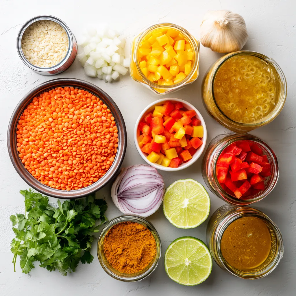 These ingredients form the base of your dish. The red lentils cook quickly and absorb flavors well. Coconut milk adds creaminess and a hint of sweetness. Fresh vegetables, like onion and bell pepper, add texture and taste. Canned tomatoes add acidity to balance the richness.