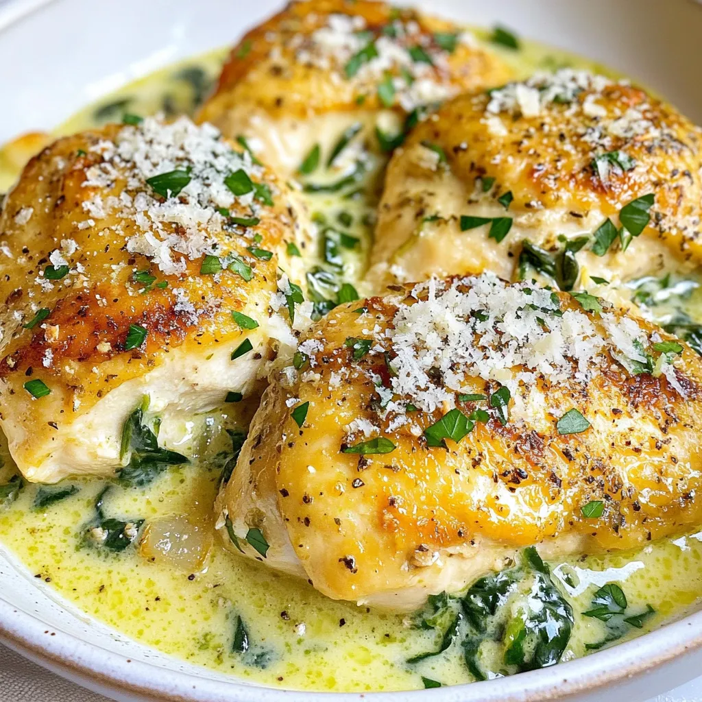 Serve the chicken on warm plates. Spoon the creamy sauce generously over each breast. Garnish with fresh parsley for a pop of color. This makes the dish look inviting and delicious.
