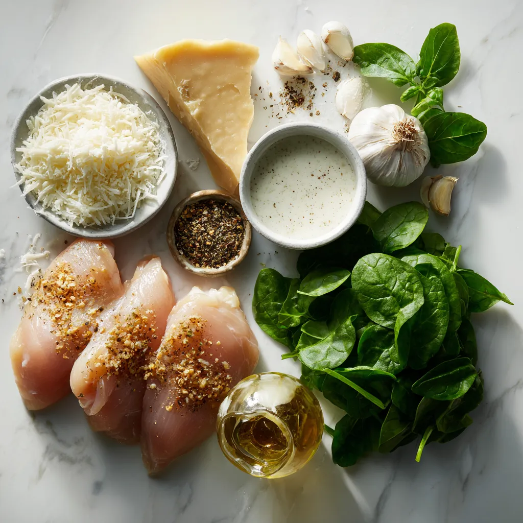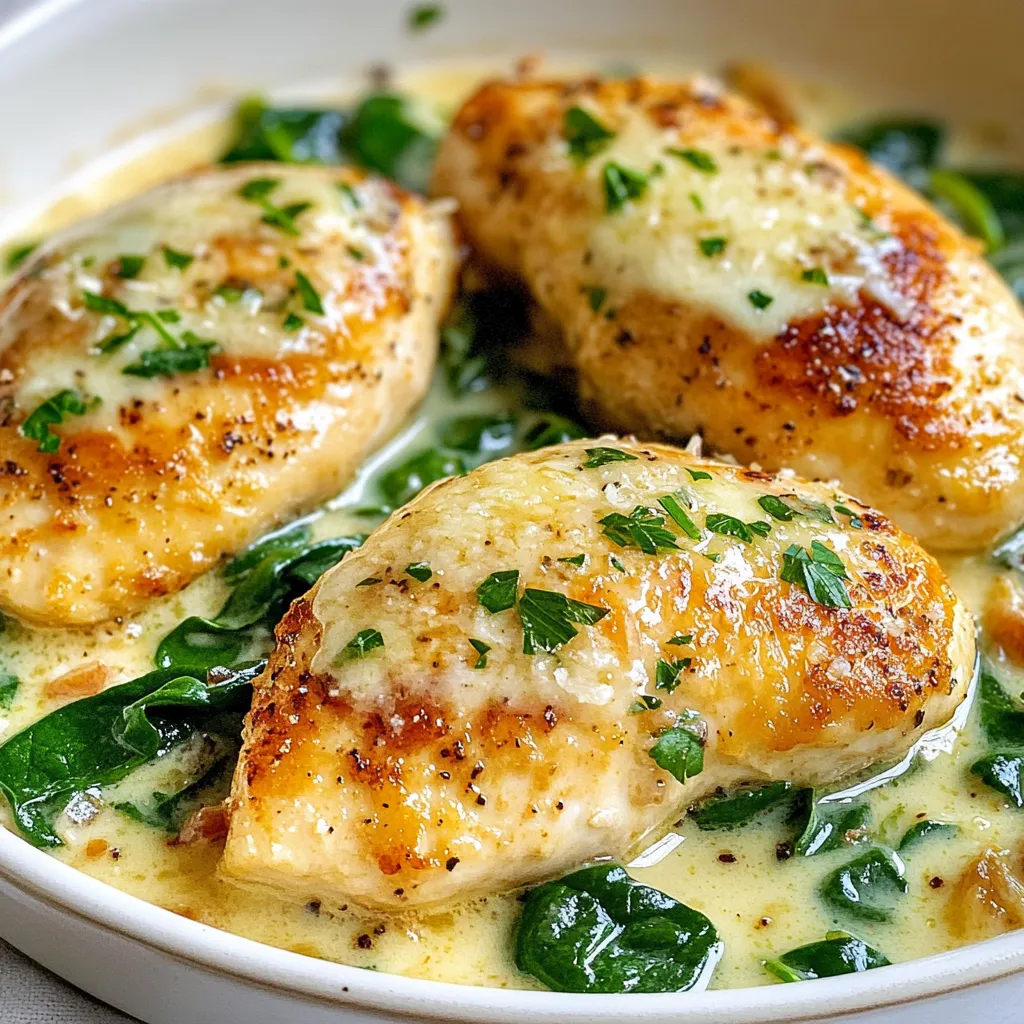 - 4 boneless, skinless chicken breasts - 1 cup heavy cream - 1 cup freshly grated Parmesan cheese - 2 tablespoons extra virgin olive oil - 4 cloves garlic, finely minced - 1 teaspoon dried basil - 1 teaspoon Italian seasoning blend - 1/2 teaspoon sea salt - 1/4 teaspoon freshly cracked black pepper - 1 cup fresh baby spinach - Fresh chopped parsley, for garnish The main ingredients in this dish make it rich and tasty. The chicken breasts provide lean protein that cooks well in a skillet. The heavy cream gives the sauce its smooth texture. Freshly grated Parmesan cheese adds a salty, nutty flavor that makes the dish shine. For seasonings, I use extra virgin olive oil to cook the chicken. Minced garlic adds a savory punch. Dried basil and Italian seasoning blend bring warmth and depth to the sauce. Sea salt and black pepper enhance all the flavors, making each bite satisfying. The garnishments include fresh baby spinach. It adds a pop of color and nutrients. Chopped parsley on top makes the dish look fresh and inviting. This combination of ingredients is simple yet makes a stunning meal. You will love how each element works together to create a creamy and delicious experience. {{ingredient_image_2}} 1. Heat 2 tablespoons of olive oil in a large non-stick skillet over medium heat. 2. While the oil heats, season both sides of 4 boneless, skinless chicken breasts with 1/2 teaspoon of sea salt and 1/4 teaspoon of black pepper. 3. Once the oil is hot, add the chicken breasts to the skillet. 4. Cook the chicken for about 6-7 minutes on each side. Look for a golden brown color and an internal temperature of 165°F. 5. When cooked, remove the chicken from the skillet and place it on a plate to rest. 1. In the same skillet, reduce the heat to medium-low. 2. Add 4 minced garlic cloves and sauté for 1-2 minutes. Stir constantly, so the garlic does not burn. 3. Gradually pour in 1 cup of heavy cream. Stir to mix it with the garlic. 4. Increase the heat slightly and bring the mixture to a gentle simmer. 5. Slowly whisk in 1 cup of freshly grated Parmesan cheese. Keep stirring until it melts, creating a creamy sauce. 6. Add 1 teaspoon of dried basil and 1 teaspoon of Italian seasoning blend. Stir well to combine the flavors. 1. Return the cooked chicken breasts to the skillet. 2. Reduce the heat to low and let the chicken simmer in the creamy sauce for about 5 minutes. This helps the chicken soak up the flavors. 3. Add 1 cup of fresh baby spinach to the skillet. Cook just until wilted, stirring gently to mix it into the sauce. 4. Taste the sauce and adjust with more salt or pepper if needed. Once the spinach is tender, remove the skillet from the heat. To make sure your chicken cooks just right, check the internal temperature. Chicken should reach 165°F. A meat thermometer works best for this. It ensures your chicken is safe to eat and not dry. For a golden crust, season your chicken well. Use sea salt and black pepper freely. Heat the olive oil until it shimmers before adding the chicken. This helps create that nice brown color. To make this dish even better, try adding different seasonings. A pinch of red pepper flakes can add some heat. You can also use fresh herbs like thyme or rosemary for a fresh twist. Balancing creaminess is key. If the sauce feels too rich, squeeze some fresh lemon juice into it. This adds brightness and cuts through the heaviness. For serving, choose wide, shallow bowls. It allows the sauce to spread out nicely. Drizzle any extra sauce over the chicken for a beautiful look. Garnish with fresh chopped parsley for a pop of color. It also adds a fresh taste. This dish pairs well with crusty bread or pasta, making it a complete meal. Pro Tips Perfectly Cooked Chicken: Use a meat thermometer to check that the chicken reaches an internal temperature of 165°F. This ensures it is safe to eat while remaining juicy and tender. Garlic Flavor Boost: For a deeper garlic flavor, consider roasting the garlic before adding it to the skillet. Roasted garlic adds a sweet and nutty taste that complements the creamy sauce beautifully. Cheese Variations: Feel free to experiment with different cheeses! A mix of Parmesan and Pecorino Romano can elevate the flavor profile of the sauce. Spinach Tips: To prevent the spinach from becoming too soggy, add it towards the end of cooking. This ensures it stays vibrant and retains its nutritional benefits. {{image_4}} To make this dish lighter, you can choose low-fat cream options. Try using half-and-half or Greek yogurt instead of heavy cream. These swaps reduce calories while keeping the dish creamy. For cheese alternatives, consider using low-fat Parmesan or a dairy-free cheese. These options offer flavor without the extra fat. Just remember, the taste will change a bit. Want to add more veggies? Bell peppers and mushrooms are great choices. They cook well and add color. Chop them into small pieces for even cooking. Cooking times vary. Bell peppers take about 5-7 minutes to soften. Mushrooms need around 4-6 minutes. Add them after cooking the chicken and before the sauce for the best results. You can change the flavor profile by using different herbs or spices. Try adding thyme or rosemary for a twist. These herbs bring out new tastes in the dish. You can also combine different cheese types. Mixing in mozzarella or goat cheese can give a unique taste. Just adjust the amount to keep the sauce creamy. To store your creamy garlic Parmesan chicken, place it in an airtight container. Make sure it cools down first. This helps keep it fresh. In the fridge, it will last about 3 to 4 days. Label the container with the date. This way, you remember when you made it. When you want to enjoy leftovers, the best method is using the stove. Heat a pan over low to medium heat. Add a splash of cream or broth for moisture. This helps keep the sauce smooth. Stir often to make sure it heats evenly. Avoid using high heat, as it may cause the sauce to separate. Yes, you can fr