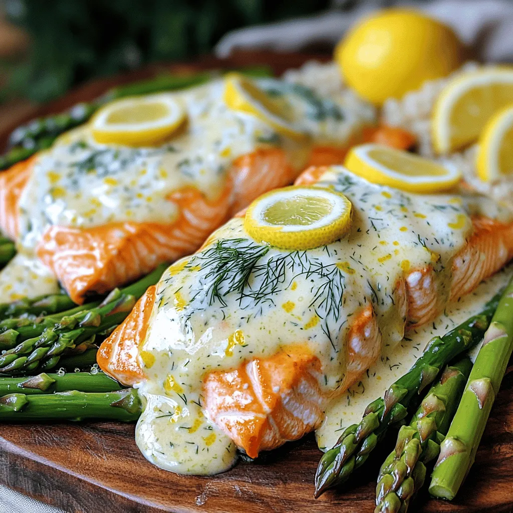 - 4 salmon fillets (6 oz each) - 1 cup heavy cream - 2 tablespoons fresh dill (or 1 tbsp dried) - Zest and juice of 1 large lemon - 2 tablespoons extra virgin olive oil - Sea salt and freshly ground black pepper - 2 cloves garlic (minced) - ½ teaspoon onion powder - ½ teaspoon smoked paprika - Fresh dill for garnish - Lemon slices for presentation When I cook creamy lemon dill salmon, I love how easy it is to gather the ingredients. You get fresh salmon fillets, heavy cream, and bright lemon. The dill adds a nice touch of flavor. These ingredients come together to create a dish that feels fancy but is simple to make. For seasoning, olive oil, salt, and pepper are key. I like to add minced garlic for that extra depth. Onion powder and smoked paprika give it a warm taste. All the flavors play well together, making the dish truly memorable. When serving, I always add fresh dill on top for a pop of color. Lemon slices not only look beautiful but also add a zesty touch. This dish is perfect for impressing guests or enjoying a cozy night at home. Check out the Full Recipe to create this delightful meal! - Preheat oven to 400°F (200°C) - Line baking sheet with parchment paper Start by preheating your oven to 400°F. This heat will help cook the salmon evenly. Lining your baking sheet with parchment paper makes cleanup easy and keeps the salmon from sticking. - Pat salmon fillets dry - Drizzle with olive oil and season with salt and pepper Next, take your salmon fillets and use paper towels to pat them dry. This helps the seasoning stick better. Drizzle some olive oil over both sides. Then, sprinkle salt and pepper to taste. Place the fillets skin-side down on the baking sheet. - Combine cream, garlic, lemon zest and juice, dill, onion powder, and smoked paprika in a saucepan - Heat mixture over medium until simmering In a medium saucepan, mix the heavy cream, minced garlic, lemon zest, lemon juice, chopped dill, onion powder, and smoked paprika. Heat this mixture over medium heat. Stir it occasionally until it starts to simmer. This will take about 5-7 minutes. The sauce should smell great and have a thicker texture. - Pour sauce over the fillets - Bake for 12-15 minutes until fully cooked Once your sauce is ready, pour it over the salmon fillets. Make sure each piece is well coated. Place the baking sheet in the oven. Bake for 12 to 15 minutes. The salmon should be fully cooked and flake easily with a fork. You’ll see the sauce bubbling around the edges, which is a good sign. For the full recipe, check out Creamy Lemon Dill Salmon Delight. To check if your salmon is done, use a fork. Gently press down on the fish. If it flakes easily, it is ready to eat. The internal temperature should reach 145°F (63°C). A meat thermometer can help you check this. Using fresh ingredients makes a big difference in taste. Fresh dill and lemon zest brighten the dish. Always let the salmon rest for a few minutes after cooking. This step allows the flavors to blend nicely. Serve your creamy lemon dill salmon with steamed asparagus and fluffy quinoa. These sides add color and nutrition. For a lovely touch, garnish with fresh lemon slices and extra dill. This makes the dish look beautiful and inviting. For the full recipe, check out the delicious details above! {{image_4}} You can switch up the herbs in this dish. Try using parsley or tarragon instead of dill. Both add a fresh taste. You can also change the citrus. Instead of lemon, use lime or orange for a new twist. The flavors will still be bright and zesty. You don’t have to bake the salmon. You can grill or pan-sear it instead. Both methods will give you a nice, crispy skin. If you want a crunchy topping, add a crust of panko breadcrumbs. This adds a fun texture and makes the dish more exciting. Feel free to play with the sauce. Adding a touch of white wine can enhance the flavor. It adds a subtle depth that you will love. You can also include capers for a briny twist. This small change can make a big difference in taste. For the full recipe, check out the Creamy Lemon Dill Salmon Delight. Enjoy the cooking! Store any leftover creamy lemon dill salmon in an airtight container. This keeps it fresh. You should eat it within 2-3 days. The flavors stay best when you eat it soon. You can freeze cooked salmon if you want to save it for later. Wrap it tightly in plastic wrap and then place it in a freezer bag. This helps prevent freezer burn. The ideal storage time is up to 3 months. When you’re ready to eat it, thaw it in the fridge overnight before reheating. To reheat, use your oven or microwave. For the oven, set it to 350°F (175°C) and cover the salmon with foil to keep it moist. In the microwave, add a splash of water or broth to keep it from drying out. Heat it in short bursts, checking until it’s warm. Enjoy the creamy sauce and flavors just like when it was fresh! Yes, but ensure it's fully thawed before cooking. Thaw it overnight in the fridge. This keeps the salmon safe to eat and helps it cook evenly. I love serving this dish with steamed vegetables like asparagus or broccoli. Brown rice or quinoa also works great. A fresh salad with lemon vinaigrette adds a nice touch. You can use coconut cream or any dairy-free substitute. Almond milk or cashew cream are good options. This keeps the creaminess without the dairy. Check for flaky texture and use a thermometer for accuracy. The inside should reach 145°F (63°C). If it flakes easily with a fork, it’s done. Yes, you can prepare the sauce ahead of time. Just store it in the fridge. Cook the salmon just before serving for the best taste. This recipe for creamy lemon dill salmon offers simple steps and tasty results. You learned how to prepare the salmon, create a rich sauce, and bake it perfectly. Tips on flavor enhancements and presentation can elevate your dish. Remember, you can customize with different herbs or cooking methods. With proper storage, your leftovers will remain delicious. En