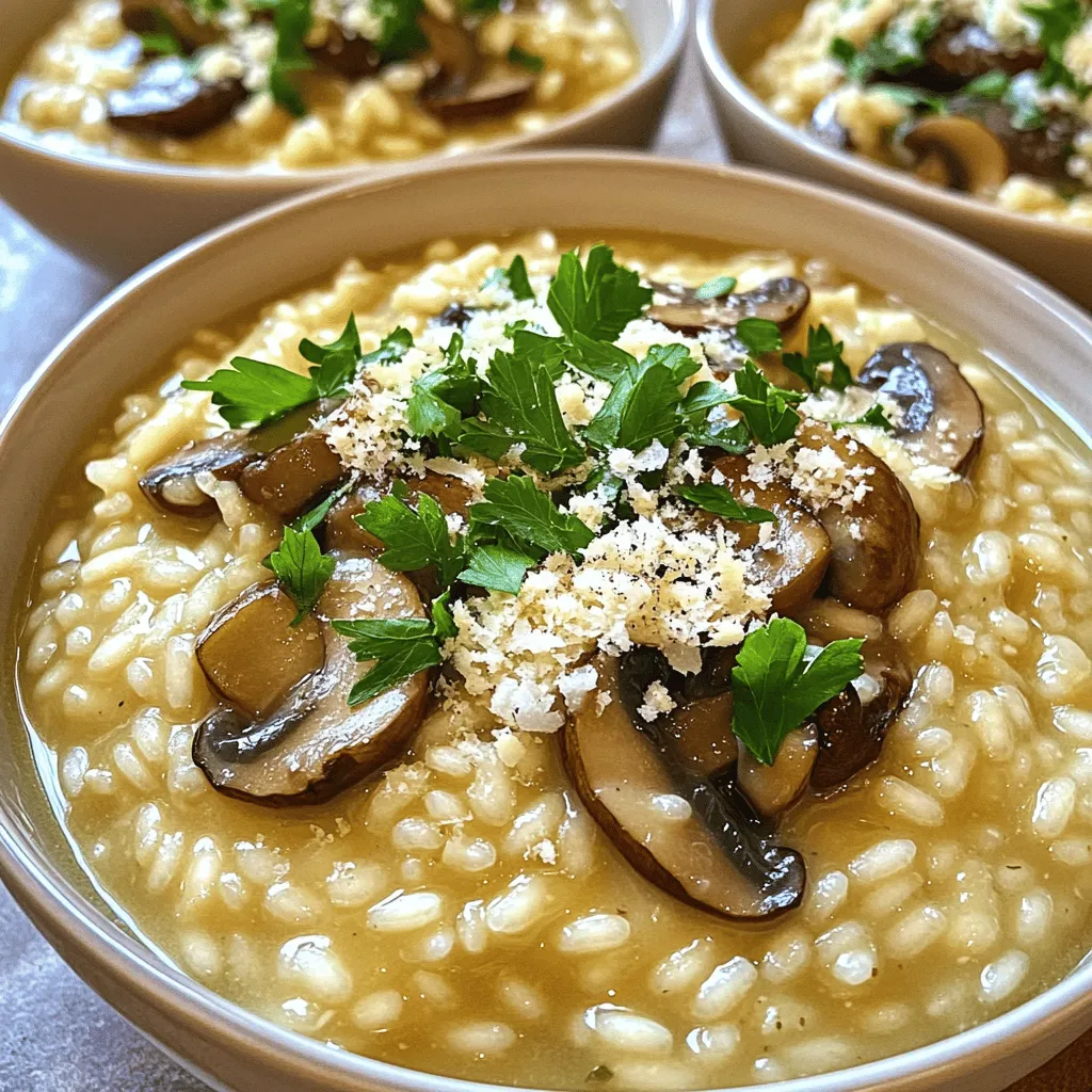 To make creamy mushroom risotto, you need the following ingredients: - 1 cup Arborio rice - 4 cups vegetable broth - 2 tablespoons extra virgin olive oil - 1 small onion, finely chopped - 2 cloves garlic, minced - 8 oz mixed mushrooms (like cremini and shiitake), sliced - 1/2 cup freshly grated Parmesan cheese - 1/4 cup heavy cream - 2 tablespoons freshly chopped parsley - Salt and freshly ground black pepper to taste The key ingredients for this recipe include Arborio rice, vegetable broth, and mushrooms. - Arborio rice is perfect for risotto. It absorbs liquid well and gives a creamy texture. - Vegetable broth adds depth to the flavor. You can use homemade or store-bought. - Mushrooms are the star of this dish. They bring umami and richness. You can customize your risotto with these optional ingredients: - Different cheeses: Swap Parmesan for Pecorino or a vegan cheese for plant-based diets. - Herbs: Add thyme or rosemary for an extra flavor boost. - Vegetables: Toss in peas or spinach for added color and nutrition. Feel free to mix and match based on what you have at home. Enjoy your cooking! 1. Gather all your ingredients. You will need: - 1 cup Arborio rice - 4 cups vegetable broth - 2 tablespoons extra virgin olive oil - 1 small onion, finely chopped - 2 cloves garlic, minced - 8 oz mixed mushrooms, sliced - 1/2 cup freshly grated Parmesan cheese - 1/4 cup heavy cream - 2 tablespoons freshly chopped parsley - Salt and freshly ground black pepper 2. Heat the vegetable broth in a medium saucepan over low heat. Keep it warm but do not let it boil. 1. In a large skillet, pour in the extra virgin olive oil. Heat it over medium heat until hot. 2. Add the chopped onion to the skillet. Sauté it for about 3-4 minutes. You want it to be translucent and fragrant. 3. Next, add the minced garlic and sliced mushrooms. Cook this mixture for 5-7 minutes. Stir often until the mushrooms soften and release their moisture. 4. Now, it's time to add the Arborio rice. Stir well and toast the rice for 1-2 minutes. This step helps the rice soak up the flavors. 5. Begin adding the warm vegetable broth to the rice. Use one ladle at a time. Stir continuously. Wait until most of the liquid is absorbed before adding more. Keep this up for about 20-25 minutes. The rice should be creamy and al dente. 1. When the rice is cooked, lower the heat. Mix in the freshly grated Parmesan cheese and heavy cream. Stir until the risotto is rich and creamy. 2. Season with salt and freshly ground black pepper to taste. Adjust the seasoning as you like. 3. Finally, fold in the freshly chopped parsley. This adds a burst of flavor and a pop of color. 4. For a nice presentation, dish the risotto into shallow bowls. Garnish each bowl with extra parsley and a dusting of Parmesan cheese. Serve it hot for the best texture and flavor. To get the creamiest risotto, use Arborio rice. This rice has a high starch content. The starch helps make the dish smooth and rich. Stirring often also helps release more starch. When you add broth, do it slowly. This lets the rice absorb the liquid fully. Keep stirring until the rice is creamy and tender. Mixing in heavy cream and Parmesan cheese at the end gives it a delightful finish. For better flavor, sauté the onions and mushrooms well. Cook them until they are soft and fragrant. You can add herbs like thyme or rosemary for a fresh taste. Tasting as you cook is key. Adjust salt and pepper to your liking. A squeeze of lemon juice at the end brightens the dish. You can also top the risotto with more cheese or fresh herbs for extra flavor. One common mistake is adding too much broth at once. This can make the rice gummy. Always add it gradually and stir. Another mistake is not stirring enough. This can prevent the rice from becoming creamy. Finally, avoid cooking the rice too long. It should be al dente, with a slight bite. If you remember these tips, your risotto will be perfect every time! {{image_4}} You can easily make this risotto vegetarian or vegan. Start by skipping the Parmesan cheese and heavy cream. Instead, use nutritional yeast for a cheesy flavor. You can also add coconut cream for extra creaminess. The vegetable broth already makes this dish a great choice. Just check the broth to ensure it is vegan. If you want to add protein, consider cooked chicken, shrimp, or even tofu. These add a nice texture and flavor. For a heartier meal, mix in peas, spinach, or bell peppers. These veggies complement the mushrooms well. Just add them during the last few minutes of cooking to keep them fresh. Herbs and spices can elevate your risotto. Fresh thyme or rosemary adds a lovely aroma. You can also try a pinch of chili flakes for a kick. If you love garlic, add more minced garlic while sautéing the onions. Don’t be afraid to experiment with flavors that you enjoy! To keep your leftover risotto fresh, place it in an airtight container. Make sure to cool the risotto to room temperature before sealing it. This step helps prevent moisture build-up, which can lead to spoilage. Store the container in the fridge for up to three days. If you notice any off smells or changes in texture, it's best to toss it out. When you're ready to enjoy your leftover risotto, reheating it properly is key. Start by adding a splash of broth or water to a saucepan. This addition helps restore creaminess. Heat the risotto over low heat, stirring often. This method keeps it from sticking and ensures even warmth. If you prefer, you can use a microwave. Just add a bit of liquid, cover it, and heat in short bursts, stirring in between. If you want to keep risotto longer, freezing works well. First, make sure the risotto is completely cool. Then, portion it into freezer-safe bags or containers. Remove as much air as possible before sealing. Label the bags with the date. You can freeze risotto for up to three months. When you're ready to eat it, thaw it in the fridge overnight before reheating. Keep in mind, the texture may change