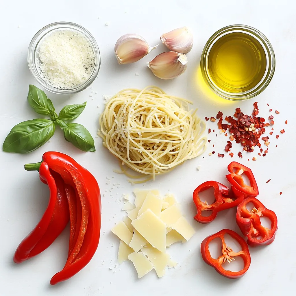 Gather these ingredients to make your creamy roasted red pepper pasta. Choose any pasta you love, like fettuccine, penne, or spaghetti. The red bell peppers bring a sweet and smoky taste. Heavy cream adds richness to the dish. Olive oil is great for sautéing the onion and garlic.
