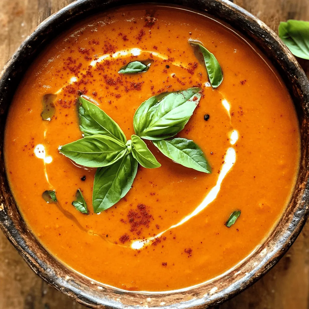 - 4 large red bell peppers - 1 medium onion - 2 cloves garlic - 3 cups vegetable broth - 1 cup coconut milk - 1 tablespoon extra virgin olive oil - 1 teaspoon smoked paprika - Sea salt and freshly ground black pepper - Fresh basil leaves (optional) When making creamy roasted red pepper soup, the right ingredients make a big difference. Start with four large red bell peppers. Look for ones that are firm and shiny. These will give the soup a sweet and rich flavor. Next, you will need one medium onion. Dice it finely. The onion adds depth to the soup. Two cloves of garlic are also essential. Mince them well to release their strong flavor. For the base, you will use three cups of vegetable broth. This adds moisture and a savory taste. A cup of coconut milk gives the soup its creaminess. You could use heavy cream if you prefer. Now, let's talk about seasoning. You will need one tablespoon of extra virgin olive oil. This adds a nice richness. One teaspoon of smoked paprika brings a warm, smoky flavor. Lastly, don't forget sea salt and freshly ground black pepper to taste. They enhance all the other flavors. If you want to make your soup even more special, add fresh basil leaves as a garnish. They add a pop of color and fresh taste to each bowl. Choosing fresh, high-quality ingredients is key. They make your creamy roasted red pepper soup truly delightful and simple. - Preheat your oven to 400°F (200°C). - Line a baking sheet with parchment paper. - Place the halved red bell peppers, cut side down, on the sheet. - Roast them for 25-30 minutes. The skins should blister and char. - Remove the baking sheet and let the peppers cool for 10 minutes. - Once cool, peel off the charred skins and set the roasted flesh aside. - In a large pot, heat one tablespoon of olive oil over medium heat. - Add one medium diced onion. Sauté for 5-7 minutes until soft. - Next, add two cloves of minced garlic and one teaspoon of smoked paprika. - Cook for one minute until fragrant. - Add the roasted peppers to the pot. Pour in three cups of vegetable broth. - Stir well and bring the mixture to a gentle boil. - Reduce heat and let it simmer for 10 minutes to meld the flavors. - Use an immersion blender to puree the soup until smooth. - Stir in one cup of coconut milk or heavy cream. - Warm the soup on low for five minutes. Season with salt and pepper to taste. - Serve hot, garnished with fresh basil if desired. To make the best creamy roasted red pepper soup, start with ripe red bell peppers. Look for bright, shiny skin with no blemishes. Ripe peppers taste sweeter and have more flavor. Roasting enhances this flavor. The heat brings out the natural sugars and adds a smoky depth. For blending, you can use an immersion blender or a countertop blender. An immersion blender lets you blend right in the pot. It saves time and cuts down on cleanup. If you use a countertop blender, let the soup cool a bit first. Always blend in batches to avoid spills. For a creamy texture, blend until smooth and silky. Serve the soup hot for the best taste. A warm bowl makes it comforting and inviting. For garnish, sprinkle fresh basil leaves on top. This adds color and a burst of flavor. You might also serve it with crusty bread or a side salad for a complete meal. {{image_4}} You can make this soup dairy-free with coconut milk. Coconut milk gives a creamy texture and a hint of sweetness. Other good options are almond milk or oat milk. Both will work well, but they might change the taste a bit. Want more heat? Add chili flakes or fresh peppers. A dash of red pepper flakes can wake up your soup. You can also chop fresh jalapeños for a spicy kick. Just be careful! Start with a little, then add more if you like. You can add other veggies for more flavor. Try diced carrots or potatoes. They will give your soup extra texture and taste. Just chop them small and add them when you sauté the onion. You can also mix in spinach or kale at the end for a healthy boost. To store leftover creamy roasted red pepper soup, let it cool first. Transfer it to an airtight container. This helps keep the soup fresh. It will last for about 3 to 4 days in the fridge. When ready to eat, check for any off smells or colors. You can freeze this creamy soup for later use. First, let it cool completely. Use freezer-safe containers or bags. Make sure to leave some space for expansion. The soup can stay fresh in the freezer for up to 3 months. Label the containers with the date for easy tracking. To reheat without losing creaminess, use a pot on low heat. Stir often to prevent sticking. You can also add a splash of water or broth if it’s too thick. Avoid using a microwave as it can change the texture. Enjoy your soup warm! Creamy Roasted Red Pepper Soup lasts about 3 to 5 days in the fridge. Store it in an airtight container. This keeps the soup fresh and tasty. Always check for any signs of spoilage before eating. If it smells off or looks strange, it's best to toss it. Yes, you can use jarred roasted red peppers. They are a great time-saver. Just drain them well before using. The flavor might be slightly different, but it still works well. If you want a smoky flavor, you can add a bit more smoked paprika. This keeps the soup's essence intact while saving time. Creamy Roasted Red Pepper Soup is relatively low in calories. Red peppers are full of vitamins and low in calories. A serving has about 150 calories, depending on your ingredients. Coconut milk adds creaminess without too many calories. Plus, it is rich in nutrients. This soup is a healthy option for lunch or dinner. This creamy roasted red pepper soup is easy to make and packs great flavor. We covered key ingredients, from vibrant red peppers to smooth coconut milk. The step-by-step guide makes preparation simple, ensuring a delicious meal every time. Remember to personalize your soup with spices or veggies. Store it correctly to enjoy later. With these tips, you can create a delightful dish that impresses. Di