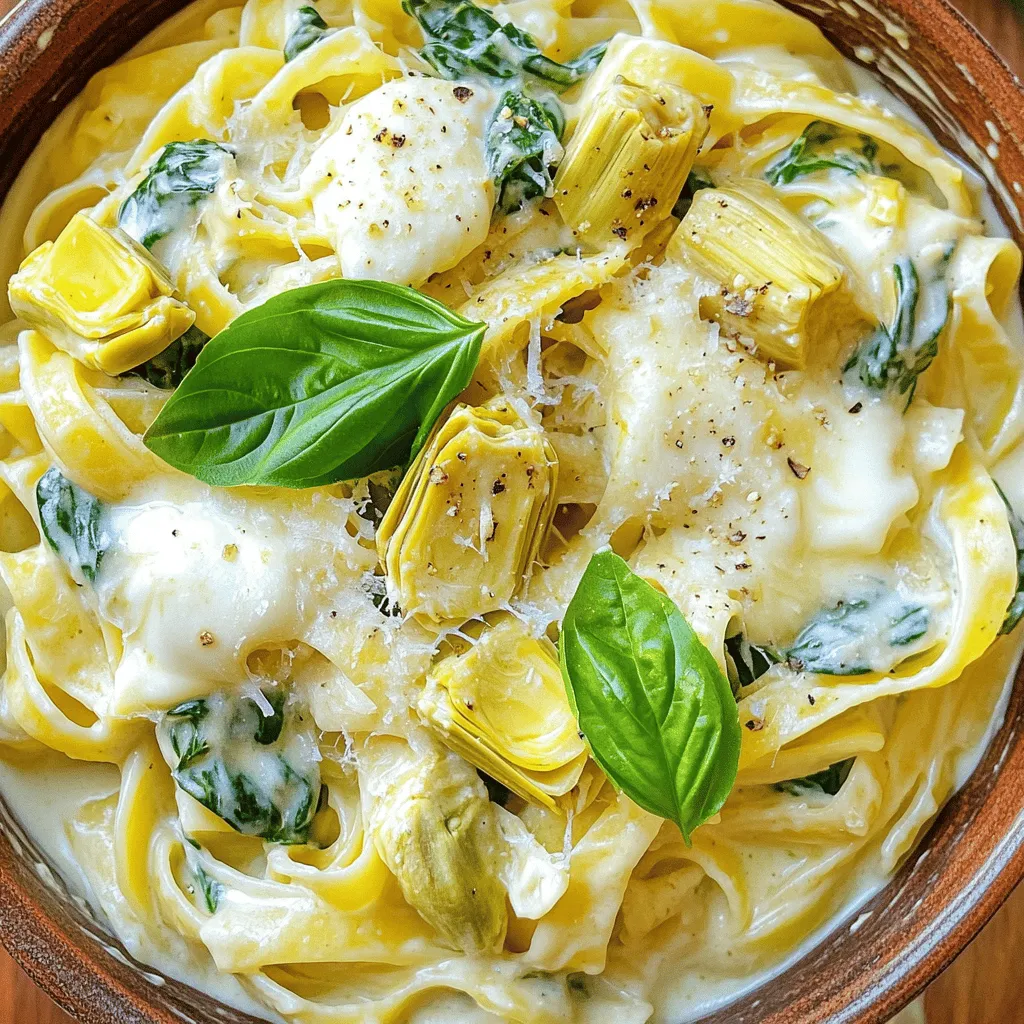 You can swap fettuccine for penne or spaghetti. If you don’t have fresh spinach, use frozen. Canned artichokes work great, too. For a lighter dish, try half-and-half instead of heavy cream. Vegan cheese can replace the mozzarella and Parmesan. Use your favorite herbs if you lack Italian seasoning.