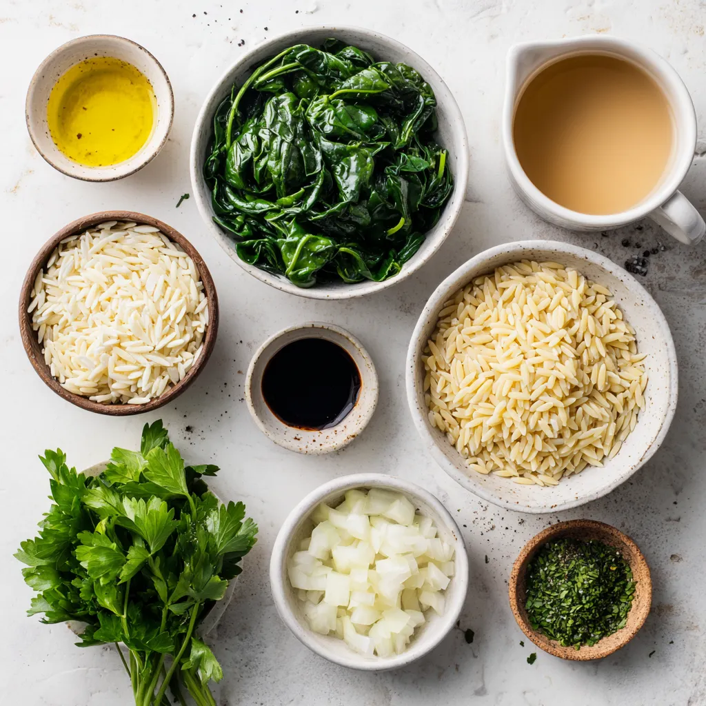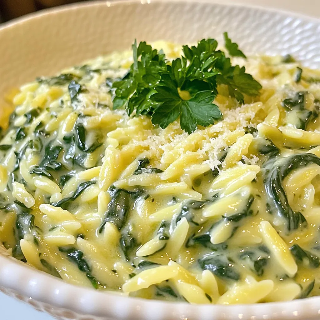 A delicious and creamy dish featuring orzo pasta and fresh spinach, perfect for a comforting meal.