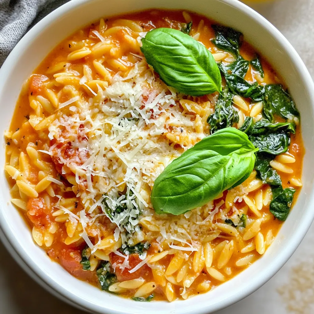 A comforting dish featuring orzo pasta, fresh spinach, and a creamy tomato sauce.