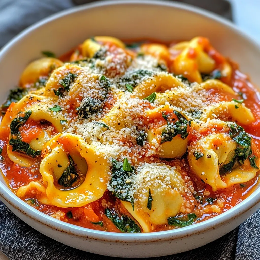 A delicious and creamy pasta dish featuring tortellini, fresh spinach, and a rich tomato sauce.