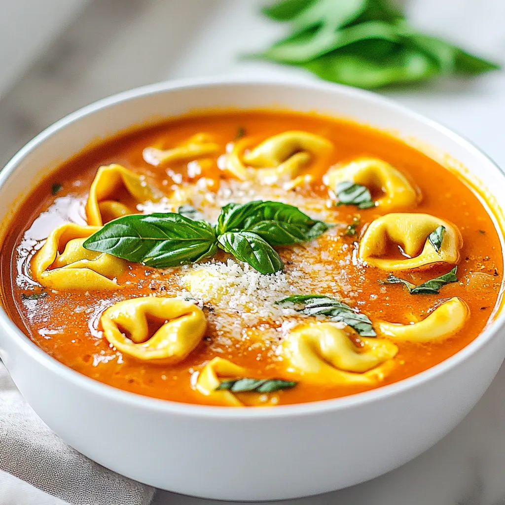 To make a creamy tomato tortellini soup, you need a few simple ingredients. Here’s a complete list: - 1 tablespoon extra virgin olive oil - 1 medium onion, finely diced - 3 cloves garlic, minced - 1 can (28 oz) crushed tomatoes in tomato puree - 4 cups vegetable broth (low-sodium preferred) - 1 teaspoon dried basil leaves - 1 teaspoon dried oregano - 1 teaspoon granulated sugar - Fresh sea salt and freshly cracked black pepper, to taste - 1 package (9 oz) fresh or frozen cheese tortellini - 1 cup heavy cream (or coconut cream for a dairy-free option) - Fresh basil leaves, small sprigs for garnish - Grated Parmesan cheese or nutritional yeast, for serving (optional) Gathering these ingredients will set you up for success. The olive oil adds a rich base. The onion and garlic bring in essential flavors. Crushed tomatoes create the heart of the soup. Vegetable broth adds depth. The cheese tortellini makes this dish cozy and filling. Heavy cream adds a luscious texture. Don’t forget the seasonings! They elevate the soup’s taste. Fresh basil makes for a beautiful garnish, and Parmesan gives that extra touch of flavor. This list keeps it simple, yet every ingredient plays a key role. Enjoy the process of cooking and savor the results! {{ingredient_image_2}} 1. Heat 1 tablespoon of extra virgin olive oil in a large pot over medium heat. 2. Add 1 medium onion, finely diced. Sauté for about 5 minutes. 3. When the onion is soft and clear, add 3 cloves of minced garlic. Cook for 1-2 minutes. 4. Pour in 1 can of crushed tomatoes and 4 cups of vegetable broth. Mix well. 5. Add 1 teaspoon of dried basil, 1 teaspoon of dried oregano, and 1 teaspoon of granulated sugar. 6. Season with fresh sea salt and cracked black pepper. Stir to combine. 7. Bring the soup to a gentle simmer. Cover the pot and cook for 10 minutes, stirring occasionally. 1. Add 1 package of cheese tortellini to the pot. Follow the package instructions. 2. Cook for about 3-5 minutes. Watch for the tortellini to float. 3. When they float, they are cooked through and ready to eat. 1. Stir in 1 cup of heavy cream or coconut cream for a dairy-free option. 2. Allow the soup to warm for 2-3 minutes over low heat. 3. Taste the soup and adjust seasoning with salt and pepper if needed. 4. Serve hot, garnished with fresh basil sprigs. Add grated Parmesan cheese if you like. To get that creamy texture in your soup, start with heavy cream. This cream adds richness and smoothness. If you want a dairy-free option, use coconut cream. It gives a great flavor too. When choosing tortellini, you can use fresh or frozen. Fresh tortellini cooks faster, usually in just 3-5 minutes. Frozen tortellini may need a bit more time. Both options work well, so pick what you like best. Pair this soup with crusty bread for a perfect match. The bread soaks up that rich tomato flavor. You can also serve it with a simple salad for a light touch. For presentation, sprinkle fresh basil on top. A drizzle of olive oil adds a nice shine. If you like cheese, add grated Parmesan. It gives a lovely finish to each bowl. Serve hot and enjoy! Pro Tips Use Fresh Herbs: Fresh basil added just before serving enhances the flavor and adds a vibrant touch to your dish. Adjust the Creaminess: For a lighter soup, consider using half and half instead of heavy cream, or for a vegan option, coconut cream works beautifully. Perfect Tortellini: Avoid overcooking the tortellini; they should be al dente for the best texture and flavor in the soup. Add Depth: A splash of balsamic vinegar or a teaspoon of red wine can add a wonderful depth of flavor to the soup. {{image_4}} To make this soup dairy-free, use coconut cream instead of heavy cream. Coconut cream adds a rich, creamy texture. It also brings a slight sweetness that pairs well with the tomatoes. You can find coconut cream in cans at most grocery stores. If you're looking for more plant-based options, try almond milk or cashew cream. Both options work well in this recipe. They keep the soup creamy without any dairy. Just ensure you choose unsweetened versions. Enhancing the flavor of your soup is easy. Consider adding fresh spinach or kale. These leafy greens add nutrients and vibrant color. Simply stir them in during the last few minutes of cooking. They will wilt quickly and add a fresh taste. You can also play with herbs and spices. Try adding thyme or parsley for a different twist. A pinch of red pepper flakes can give a nice kick. Experiment with flavors until you find your favorite mix! To keep your creamy tomato tortellini soup fresh, follow these tips: - Refrigeration: Store the soup in an airtight container. It lasts for about 3 to 4 days in the fridge. Make sure it cools down before sealing it. - Freezing: If you want to save some for later, freeze the soup. Use a freezer-safe container and leave some space at the top. The soup can stay frozen for up to 3 months. When it's time to enjoy your soup again, use these methods: - Best methods for reheating: Heat the soup gently on the stove over low heat. Stir often to prevent sticking. You can also use a microwave. Heat in a bowl, stopping to stir every minute. - Avoiding overcooking tortellini: If the soup is frozen, thaw it in the fridge overnight. When reheating, watch the tortellini closely. They only need a few minutes to warm up. Overcooking will make them mushy. Can I make this soup in advance? Yes, you can make this soup ahead of time. Just store it in the fridge. It tastes even better after a day. How do I adjust the recipe for more servings? To make more servings, simply increase each ingredient. For example, double the tomatoes and broth. Adjust seasonings to taste as well. What can I substitute for tortellini? You can use any pasta you like. Consider using small shells or even gnocchi. Each option will give a different taste and texture. Overview of calories and key nutrients This creamy soup has about 400 calories per serving. It offers protein from the tortellini an