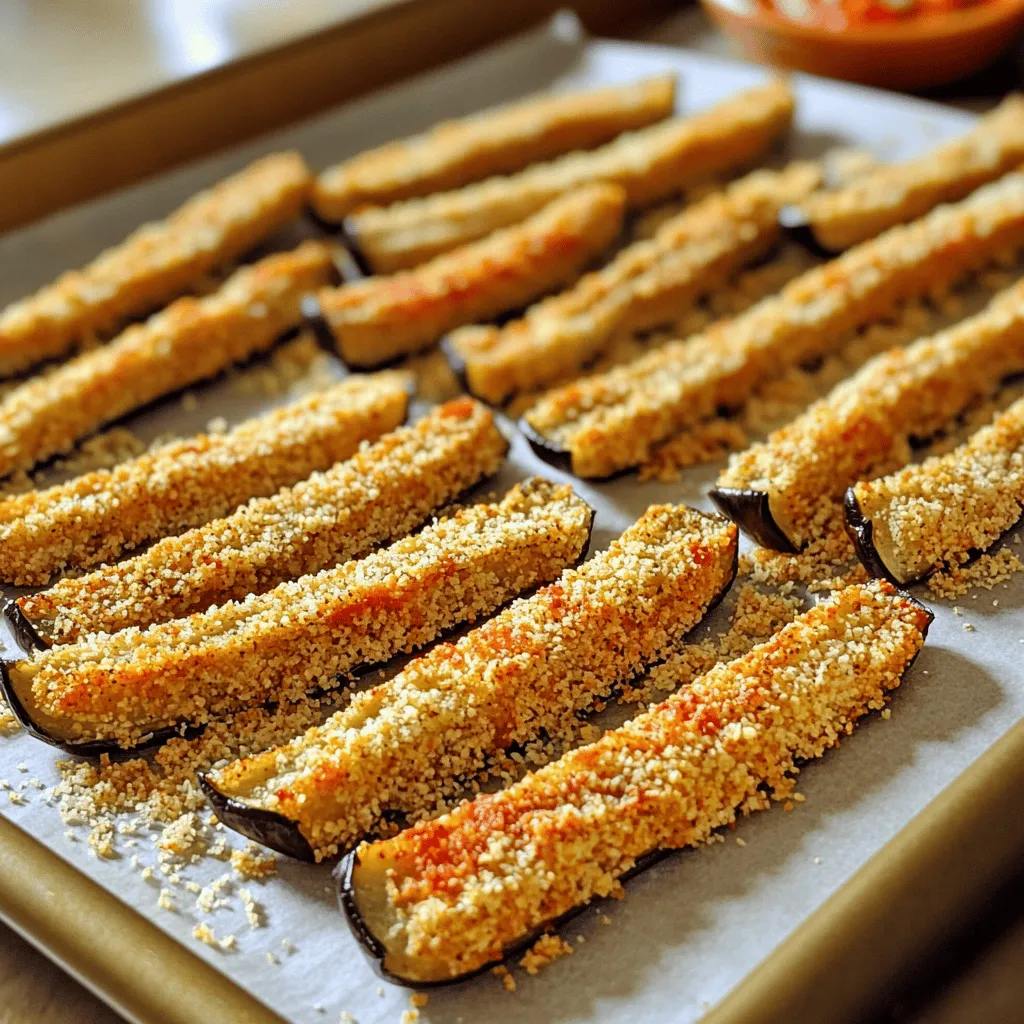 The ingredients for crispy baked eggplant fries are simple yet delightful. Here is what you will need: - 1 large eggplant - 1 cup breadcrumbs (preferably panko for that irresistible crunch) - ½ cup grated Parmesan cheese (optional, for an extra layer of flavor) - 2 large eggs - 1 teaspoon garlic powder - 1 teaspoon onion powder - 1 teaspoon smoked paprika - Salt and pepper, to taste - Cooking spray or a drizzle of olive oil Each ingredient adds its own charm to the dish. The eggplant serves as the base, giving the fries their unique texture. Panko breadcrumbs ensure each fry gets that crispiness we all crave. The Parmesan cheese, if you choose to include it, adds a rich depth of flavor that pairs wonderfully with the spices. The spices are key for flavor. Garlic powder gives a savory note, while onion powder adds sweetness. Smoked paprika brings a hint of smokiness, making these fries truly special. Finally, a sprinkle of salt and pepper enhances all these flavors, ensuring a well-balanced snack. You can find the full recipe in the next section, but remember: the key to great eggplant fries lies in the quality of your ingredients and how you prepare them. Enjoy the process, and your fries will surely impress! First, set your oven to 425°F (220°C). This high heat helps make the fries crispy. Next, line a baking sheet with parchment paper. This keeps the fries from sticking and helps them cook evenly. Now, take your large eggplant and cut it into long strips. Aim for about 1/4 inch thick. Uniform strips cook better and help avoid soggy fries. In a small bowl, whisk two large eggs. Make sure they are well beaten. In another bowl, mix one cup of breadcrumbs with garlic powder, onion powder, smoked paprika, salt, and pepper. This will be your tasty coating. Take each eggplant strip and dip it into the eggs. Let any extra egg drip back into the bowl. Next, roll the strip in the breadcrumb mixture. Press gently to ensure it sticks well. Place the coated eggplant fries on the baking sheet. Make sure the strips do not overlap. This is key to getting them crispy. Now, pop the baking sheet into your preheated oven. Bake for 20-25 minutes. Flip the fries halfway through to get an even, golden brown color. You'll know they are done when they look crispy and delicious. For the complete experience, don’t forget to check out the Full Recipe! To get the best crispiness, cut your eggplant into uniform strips. This helps them bake evenly. If the pieces are not the same size, some will cook too fast, while others stay soggy. Use cooking spray or a drizzle of olive oil to boost that crunch. This little bit of fat helps the breading brown and crisp up nicely. Pair your crispy eggplant fries with tasty dips. Marinara is a classic choice. It gives a sweet and tangy contrast. Tzatziki adds a cool, refreshing touch. For a kick, try spicy aioli. These sauces not only complement the fries but also add fun flavors to each bite. If you have an air fryer, use it! It cooks the fries quickly while keeping them crispy. Set it to 400°F for about 15 minutes, flipping halfway. If you prefer frying, heat oil in a pan. Fry the coated strips for 2-3 minutes on each side until golden. Just watch them closely to avoid burning. For the full recipe, check the earlier section. {{image_4}} You can change the flavor of your eggplant fries with different spices. Try using Italian herbs like oregano and basil for a classic taste. You might also enjoy a spicy kick by adding cayenne pepper or chili powder. For a smoky flavor, increase the smoked paprika. Experiment with your favorite spices to find what you love best. If you want a non-dairy option, try nutritional yeast. It adds a cheesy flavor without dairy. You can also use vegan cheese shreds that melt well. If you like cheese, consider using mozzarella or provolone for a gooey texture. Cheddar can give a sharp taste that pairs well with the eggplant. These crispy fries make great appetizers. Serve them with a variety of dipping sauces like marinara or ranch. You can also toss them into salads for a crunchy texture. Pair them with roasted vegetables for a hearty meal. You could even layer them in a sandwich for a fun twist on a classic. For the full recipe, check out the Crispy Baked Eggplant Fries section. To store your leftover eggplant fries, place them in an airtight container. Make sure they cool down before sealing. This helps keep them fresh. You can store them in the fridge for up to three days. After that, they may lose their crispiness and flavor. If you want to save your fries for later, freezing is a great option. First, let the fries cool completely. Then, lay them out in a single layer on a baking sheet. Freeze them for about one hour. Once frozen, transfer them to a freezer bag, removing as much air as possible. They can last for up to three months in the freezer. When you’re ready to eat, you can reheat them directly from the freezer. For the best results, use an oven to reheat your eggplant fries. Preheat the oven to 400°F (200°C). Place the fries on a baking sheet and bake for about 10-15 minutes. This method keeps them crispy. You can also use a microwave, but this may make them soft. If you choose the microwave, reheat them for about 1-2 minutes. If you want to keep them crispy, the oven is the way to go. Try these storage tips to keep your crispy baked eggplant fries tasty and crunchy! For the full recipe, check out the [Full Recipe]. To make eggplant fries crispy, focus on the breading technique. First, cut your eggplant into uniform strips. This helps them cook evenly. Next, set up your dipping stations: one for beaten eggs and another for your breadcrumb mix. When you dip the eggplant, let excess egg drip off. Then, coat it well with breadcrumbs. Press down gently for better adhesion. Arrange the fries on a baking sheet without overlapping. This helps them crisp up. A light spray of cooking oil also adds to the crunch. Bake them at 425°F for 20-25 m