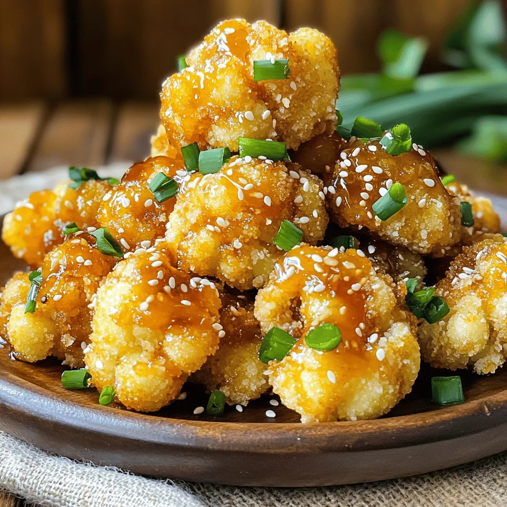 ![To make crispy honey garlic cauliflower, you need these simple ingredients: - 1 large head of cauliflower, cut into bite-sized florets - 1 cup all-purpose flour - 1 teaspoon garlic powder - 1 teaspoon onion powder - ½ teaspoon paprika - ½ teaspoon salt - ½ teaspoon black pepper - 1 cup cold sparkling water - 1 cup breadcrumbs (preferably panko) - 3 tablespoons honey - 3 tablespoons soy sauce - 2 tablespoons apple cider vinegar - 2 cloves garlic, minced - 1 tablespoon fresh ginger, grated - 1 tablespoon sesame oil - Green onions, finely sliced (for garnish) - Sesame seeds (for garnish) These ingredients come together to create a dish that is both tasty and easy to prepare. The cauliflower gives a great crunch, while the honey garlic sauce adds a sweet and savory flavor. When you combine crispy cauliflower with the rich sauce, it becomes a treat to savor. For the full recipe, check out the details above. Start by preheating your oven to 425°F (220°C). This step is key for crispiness. Line a baking sheet with parchment paper to help with cleanup. In a big bowl, whisk together the flour, garlic powder, onion powder, paprika, salt, and black pepper. Pour in the cold sparkling water slowly. Keep whisking until the batter is smooth. It should look like pancake batter. If it’s too thick, add more water. If it’s thin, mix in a bit more flour. Take each cauliflower floret and dip it into the batter. Let any extra batter drip off. Then, coat the floret in breadcrumbs. Make sure they are fully covered. Place the florets in a single layer on the baking sheet. Give them space so they can crisp up. Put the baking sheet in the oven. Bake for 25 to 30 minutes. The cauliflower should turn golden brown and crispy. Remember to flip them halfway through for even cooking. While the cauliflower bakes, make the sauce. In a small saucepan, mix the honey, soy sauce, apple cider vinegar, minced garlic, grated ginger, and sesame oil. Heat over medium heat. Stir often and bring it to a gentle simmer. Cook for 3 to 5 minutes until it thickens a bit. Once the cauliflower is crispy, take it out of the oven. Drizzle the honey garlic sauce over the florets. Toss gently so each piece gets coated well. Put the coated cauliflower back in the oven for 5 more minutes. This step helps the glaze stick and boosts the flavors. After baking, take the dish out. Garnish it with finely sliced green onions and a sprinkle of sesame seeds. Serve hot and enjoy this crispy honey garlic cauliflower delight! For the full recipe, see above. To get that perfect crunch, follow these steps. First, coat each cauliflower floret fully in the batter. Make sure no wet spots are showing. Next, roll them in breadcrumbs. Panko breadcrumbs work best for extra crunch. Spread the florets out on the baking sheet. Give each piece some space. This helps them cook evenly. Flip them halfway through baking to brown both sides. Crispy honey garlic cauliflower shines as a snack or side dish. Serve it hot right from the oven. Pair it with a cool dipping sauce like ranch or sriracha mayo. You can also top it with fresh herbs for added flavor. Try green onions or cilantro to brighten the dish. This recipe is great for parties, game days, or casual dinners. This dish pairs well with various meals. Try it alongside rice or noodles for a satisfying meal. You can also add it to salads for a tasty crunch. It complements grilled meats like chicken or shrimp nicely. For a vegetarian option, serve it with stir-fried veggies. The sweet and savory sauce enhances any flavor combination. Enjoy this crispy delight on its own or as part of a larger feast. For the full recipe, visit the recipe section. {{image_4}} To add some heat, mix in chili flakes to your sauce. Start with one teaspoon and adjust to your taste. This will give your dish a spicy twist. You can also drizzle hot sauce over the finished cauliflower for extra zing. The contrast of sweet and spicy will delight your taste buds. To make this dish vegan, swap honey for maple syrup or agave nectar. Both options will keep the sweetness without the use of animal products. Use a plant-based soy sauce to ensure the entire dish is vegan-friendly. This allows everyone to enjoy the crispy goodness. Don't feel limited to honey garlic sauce. Try teriyaki or sweet chili sauce for a different flavor profile. You can even mix your favorite sauces together for a unique taste. Experimenting with sauces allows you to find new favorites. Just make sure to coat the cauliflower well before the final baking step. For more details on the full recipe, check out the crispy honey garlic cauliflower recipe. Store any leftover crispy honey garlic cauliflower in an airtight container. This keeps it fresh and tasty. Place it in the fridge for up to three days. The sauce may soften the cauliflower, but it will still taste great. If you want to freeze the cauliflower, let it cool first. Spread it out on a baking sheet. Freeze it for about one hour. Then, transfer the florets to a freezer-safe bag. They can stay frozen for up to a month. When you're ready to eat, thaw them in the fridge overnight. To reheat, preheat your oven to 350°F (175°C). Place the cauliflower on a baking sheet. Bake for about 10-15 minutes until warm and crispy. You can also use an air fryer for a quicker option. Reheat at 350°F (175°C) for about 5-7 minutes. This helps regain that crunchy texture. To make cauliflower crispy, you need a good batter and breadcrumbs. Start by coating each floret in a thick batter made from flour and water. Use cold sparkling water for extra crunch. Then, roll the battered florets in breadcrumbs, preferably panko. Baking them at a high temperature helps achieve that golden, crispy texture. Flip them halfway through baking for even crispiness. Yes, you can use frozen cauliflower. Just make sure to thaw and drain it well. Pat the florets dry with a paper towel to remove excess moisture. This step is important because moisture can lead