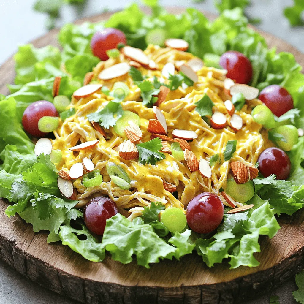 To make a great curry chicken salad, gather these key ingredients: - 2 cups cooked chicken, shredded - 1/2 cup Greek yogurt (plain) - 1 tablespoon curry powder (adjust based on spice preference) - 1 tablespoon honey (or maple syrup for a vegan option) - 1/4 cup celery, finely diced - 1/4 cup red grapes, halved - 1/4 cup slivered almonds (toasted for extra flavor) - 1/4 cup green onions, chopped - Salt and freshly cracked black pepper, to taste - Large lettuce leaves (such as romaine or butter lettuce), for serving You can switch things up with some fun alternatives. Try these: - Swap Greek yogurt for avocado or cashew cream for a creamier base. - Use dried cranberries instead of grapes for a different sweetness. - Substitute pecans or walnuts for almonds if you prefer a different nut flavor. - Replace chicken with chickpeas for a plant-based option. If you run out of something, here are some easy swaps: - Use sour cream in place of Greek yogurt for a tangy twist. - Honey can be replaced with agave syrup if you're vegan. - Use any nuts you have on hand instead of slivered almonds. - Add fresh herbs like cilantro or parsley for a fresh touch. This recipe gives you room to play with flavors while keeping it healthy. Explore the Full Recipe for more details! Start by making the dressing. Grab a large mixing bowl. Add the Greek yogurt, curry powder, honey, salt, and black pepper. Use a whisk to mix until it becomes smooth. This dressing is the heart of your curry chicken salad. The yogurt adds creaminess, while the curry brings a warm spice. Now, take your cooked chicken and shred it into bite-sized pieces. Add the shredded chicken to the bowl with the dressing. Stir gently to coat all the chicken. Make sure every piece is covered in that tasty dressing. This step ensures each bite bursts with flavor. Next, it’s time to add some crunch and sweetness. Fold in the diced celery, halved grapes, toasted almonds, and chopped green onions. Mix everything together well. This adds texture and color to your salad. Taste your mixture. Adjust the seasoning if you want it sweeter or spicier. Serve the salad in large lettuce leaves for a fun twist. For the full recipe, check out the details above. To change the spice level in your curry chicken salad, start with the curry powder. If you like heat, add more curry powder. For a milder flavor, reduce the amount. You can also mix in some yogurt to cool it down. Taste as you go. This helps you find the perfect balance for your palate. When serving your curry chicken salad, use large lettuce leaves. They create a nice wrap for the salad. Arrange the stuffed leaves on a platter. For a pop of color, add some fresh herbs around the salad. Drizzling extra yogurt on the plate also looks nice. It makes your dish more inviting and fun. One common mistake is not mixing the dressing well. Ensure the yogurt and spices blend smoothly. Another mistake is over-seasoning. Start with a little salt and pepper, then adjust. Finally, don’t skip fresh ingredients like celery and grapes. They add crunch and sweetness, which make the salad great. {{image_4}} You can make a vegan version of curry chicken salad. Swap the chicken for chickpeas. Chickpeas add protein and a nice texture. Use vegan yogurt instead of Greek yogurt. This keeps the salad creamy. You can also add diced avocado for extra richness. For a gluten-free salad, ensure the yogurt is gluten-free. Most plain yogurts are safe, but always check labels. Use gluten-free nuts, like almonds or walnuts. These nuts add crunch and flavor without gluten. Try different fruits and nuts to change up the flavor. Pineapple or apple can add sweetness. Dried cranberries or raisins can give a nice chew. For nuts, consider walnuts or pecans. They bring a new taste and texture. Experiment with what you love. This makes each salad unique and fun. Enjoy your curry chicken salad with your favorite twists! For the complete recipe, check the Full Recipe section. To keep your curry chicken salad fresh, place it in an airtight container. This helps lock in flavors and moisture. Make sure to store it in the fridge. It will stay good for about 3 to 4 days. If you notice any change in smell or color, it’s best to throw it out. You can freeze curry chicken salad, but it might change texture. To freeze, put the salad in a freezer-safe container. Leave some space at the top for expansion as it freezes. It can last up to 3 months in the freezer. Thaw it in the fridge overnight before you eat it. Reheating is not usually needed, as this salad is best served cold. If you must warm it, do so gently. Use a microwave-safe dish and heat in short bursts. Stir often to avoid hot spots. Add a bit of yogurt to regain creaminess if it seems dry. Enjoy your flavorful meal! You can serve curry chicken salad with many sides. It pairs well with crusty bread or crackers. You can also add a fresh side salad for more crunch. A bowl of fruit is a sweet choice too. Try pairing it with a light soup for a full meal. You can use the salad as a filling for wraps or sandwiches to mix things up. Yes, you can use canned chicken. It is a quick option and saves time. Just drain the chicken well before mixing it with other ingredients. Make sure to break it up into smaller pieces. This helps it blend well with the dressing and other ingredients. The flavors will still shine through, making a tasty dish. Curry chicken salad lasts about three to four days in the fridge. Keep it in an airtight container to keep it fresh. Make sure to check for any changes in smell or texture before eating. If you notice anything off, it’s best to throw it away. Enjoy it within this time for the best taste and quality. In this blog post, I covered all you need for a tasty curry chicken salad. We explored the key ingredients, how to mix them, and ways to adjust flavors. I also shared tips on serving and storing your salad. Remember, you can customize it for vegan or gluten-free diets too. Keep th