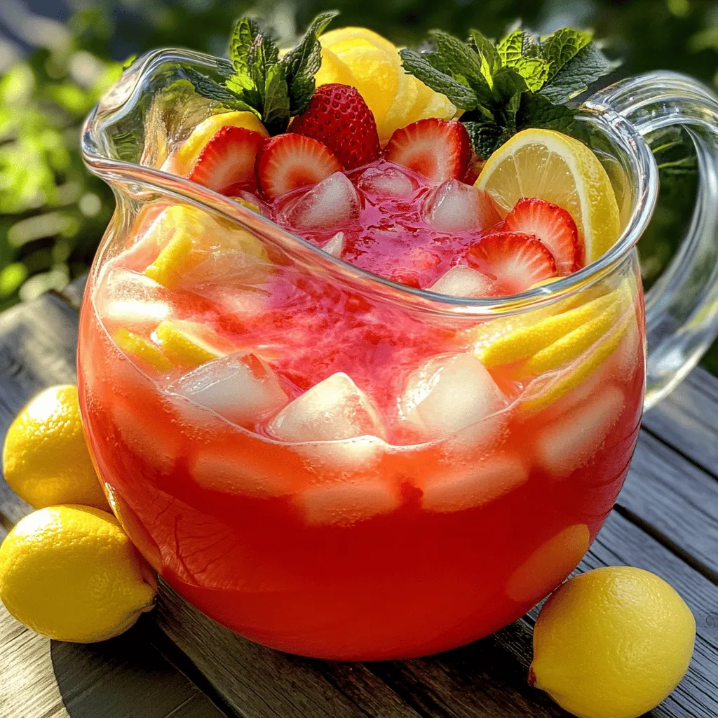 You need 1 cup of fresh strawberries for this drink. Start by hulling and slicing them. Fresh strawberries are sweet and juicy, making them perfect for lemonade. They are low in calories and packed with vitamins. Strawberries are also high in antioxidants, which help keep you healthy. You will need 1 cup of freshly squeezed lemon juice, which is about 4 to 6 medium lemons. To get the most juice, roll the lemons on the counter before cutting them. Press down while rolling to break down the membranes inside. Lemon juice is rich in vitamin C, which boosts your immune system. It also adds a bright, zesty flavor that balances the sweetness of the strawberries. For this recipe, use 3/4 cup of granulated sugar or adjust to your taste. You can also use alternatives like honey or agave. If you prefer a less sweet drink, start with less sugar and add more as needed. Just remember, the sweetness should enhance the flavors without overpowering them. First, place the sliced strawberries in a blender. Add 1/2 cup of cold water. Blend on high until it becomes smooth. This step brings out the sweet flavor of the strawberries. Next, take a fine-mesh sieve and set it over a large pitcher. Pour the strawberry puree into the sieve. Use a spoon to press down and extract juice. Discard the leftover pulp. This method helps you get a clear and flavorful juice. Now, pour the freshly squeezed lemon juice into the pitcher with strawberry juice. It adds a zesty kick to the mix. Then, add the remaining 3.5 cups of cold water to the pitcher. This helps balance the flavors. Gradually add the granulated sugar. Stir well until the sugar dissolves completely. Taste your drink to see if you want it sweeter. Adjust the sugar to your liking. For the best taste, refrigerate the lemonade for about 30 minutes. Chilling helps the flavors blend nicely. If you are in a hurry, serve it over ice right away. When you're ready to serve, pour the lemonade into glasses filled with ice. Garnish each glass with a slice of lemon and fresh mint leaves. This adds a lovely touch to your drink and makes it look inviting. Enjoy this refreshing summer drink with friends and family! To make your strawberry lemonade even better, you can try adding fresh herbs. Mint or basil works great. Just chop a few leaves and mix them in. This adds a fresh twist to your drink. Balancing sweetness and acidity is key. If your lemonade is too sweet, add more lemon juice. If it’s too tart, stir in more sugar. Taste as you go to find the perfect mix. For a fun look, serve your lemonade in clear glasses. This lets the bright color shine through. Add a slice of lemon on the rim for a pop of color. Fresh mint leaves can be a nice touch too. If you are hosting a party, consider using a large pitcher. You can fill it with lemon slices and strawberries for decoration. This also makes it easy for guests to serve themselves. If you have a busy day, you can save time. Use store-bought lemon juice instead of squeezing fresh lemons. It cuts down on prep time and is still tasty. Another tip is to blend the strawberries in advance. Keep the puree in the fridge. When you’re ready, mix it with the lemon juice and water. This makes your drink quick to prepare when you need it. For the full recipe, check out the detailed instructions above. {{image_4}} You can mix fresh strawberries with other fruits for fun flavors. Peach is sweet and juicy. Raspberry adds a tart kick. Combine all three for a vibrant drink. You can also try herbs for extra flair. Mint gives a refreshing taste, while basil adds a unique twist. Just muddle herbs before mixing them in. If you want different sweeteners, try honey or agave. These natural options can change the taste. Honey gives a floral note, while agave is mild and smooth. If you're watching calories, consider using stevia or monk fruit. Both are low-calorie and do not alter the drink's flavor too much. To make your lemonade fizzy, add sparkling water or soda. This will give a bubbly texture that feels festive. Mix in the sparkling water right before serving for the best fizz. For a fun twist, serve it in tall glasses with ice. Add extra lemon slices and mint leaves on top for a lovely presentation. Check out the Full Recipe for more ideas to enjoy this refreshing drink! Fresh strawberry lemonade lasts in the fridge for about five days. It stays tasty during this time. Look for bright colors and a sweet smell to check for freshness. If you notice any off smells or changes in color, it's time to toss it out. You can freeze strawberry lemonade for later enjoyment. Pour the lemonade into ice cube trays. Once frozen, transfer the cubes to a bag. This helps save space and keeps it fresh. To serve, take out the cubes and let them thaw in the fridge. You can also blend them back into a slushy drink! Use glass or BPA-free plastic containers for storage. These help keep the lemonade fresh. Make sure the containers are airtight to minimize oxidation. This keeps your drink vibrant and flavorful. Always fill the container to the top to reduce air space and prevent spoilage. Yes, you can make strawberry lemonade ahead of time. Here are some best practices: - Prepare the lemonade up to two days in advance. - Store it in a tight container in the fridge. - Keep it away from light and heat to maintain freshness. To maintain freshness, follow these tips: - Add ice just before serving to prevent dilution. - Garnish with lemon slices and mint leaves right before serving. Strawberry lemonade can be a healthy drink. It has several nutritional benefits: - Fresh strawberries provide vitamins and antioxidants. - Lemon juice is high in vitamin C. - The drink has lower calories when made at home. Comparing homemade vs. store-bought options: - Homemade allows you to control sugar levels. - Store-bought may have more added sugars and preservatives. Yes, you can use frozen strawberries in your lemonade. When to opt for frozen: - If fresh strawberries are out of season. - If 