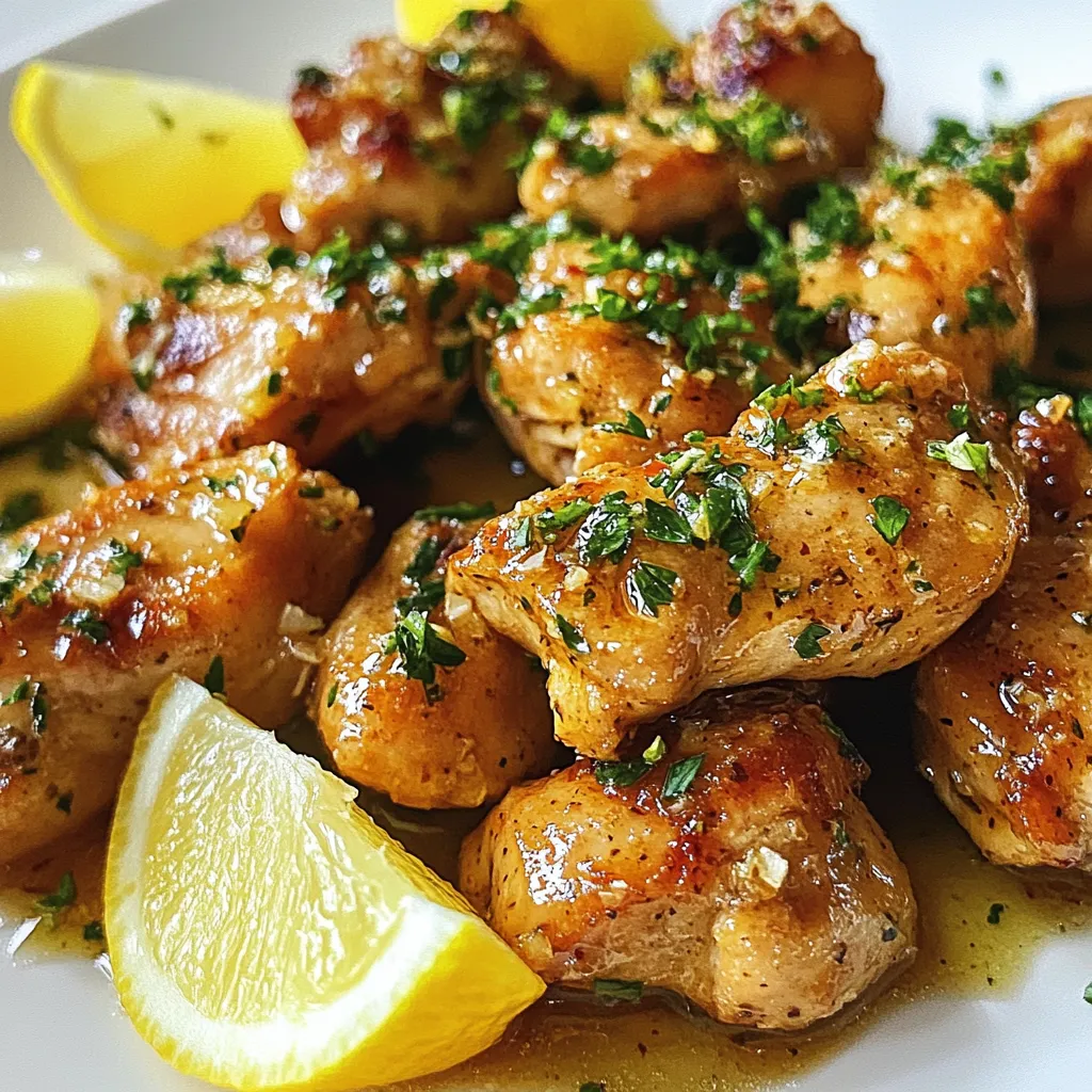 Take the skillet off the heat. Transfer the chicken bites to a serving plate, sprinkle with chopped fresh parsley for a burst of color and flavor, and place lemon wedges on the side for drizzling over the chicken just before eating.
