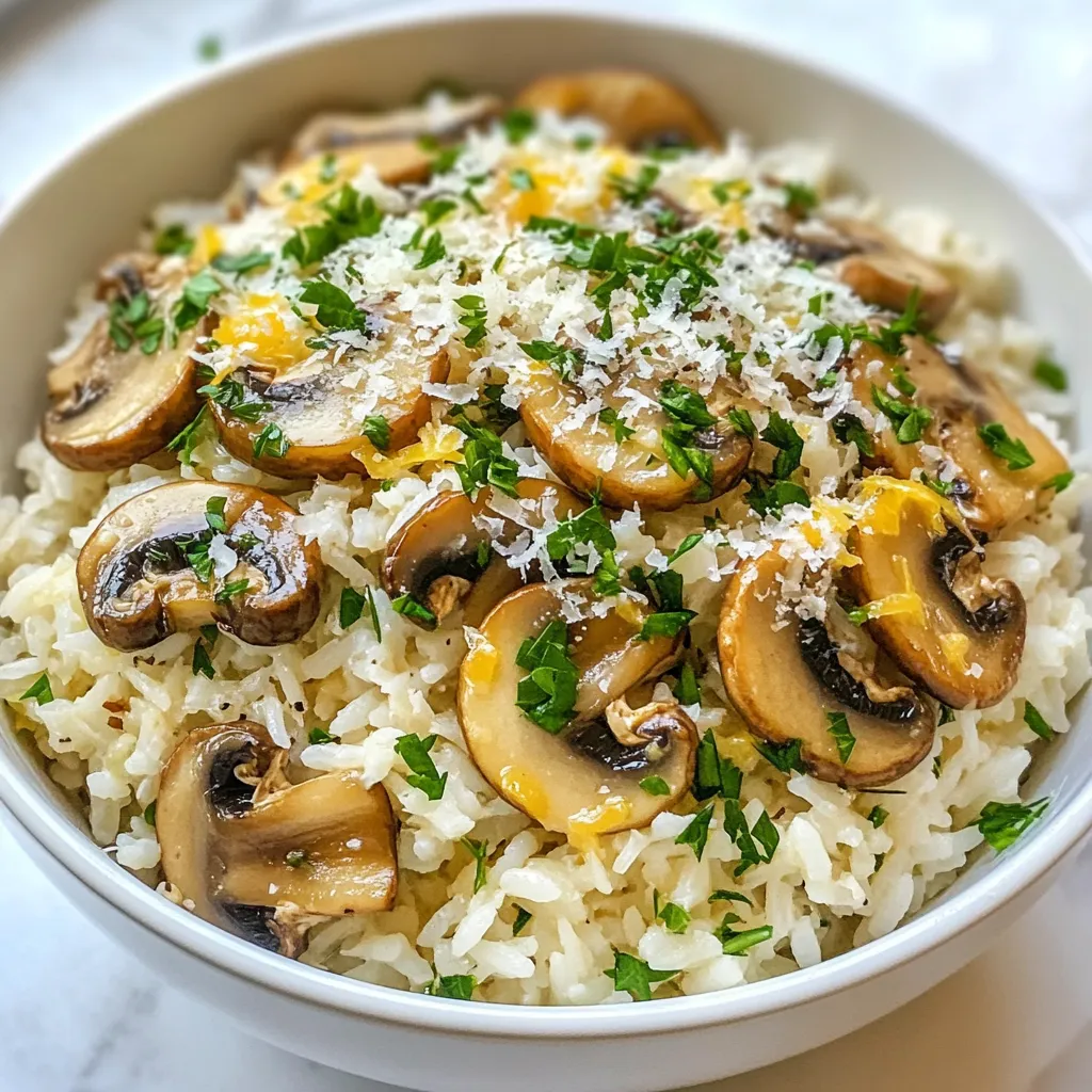 A savory and comforting rice dish featuring garlic, mushrooms, and butter, topped with Parmesan and parsley.
