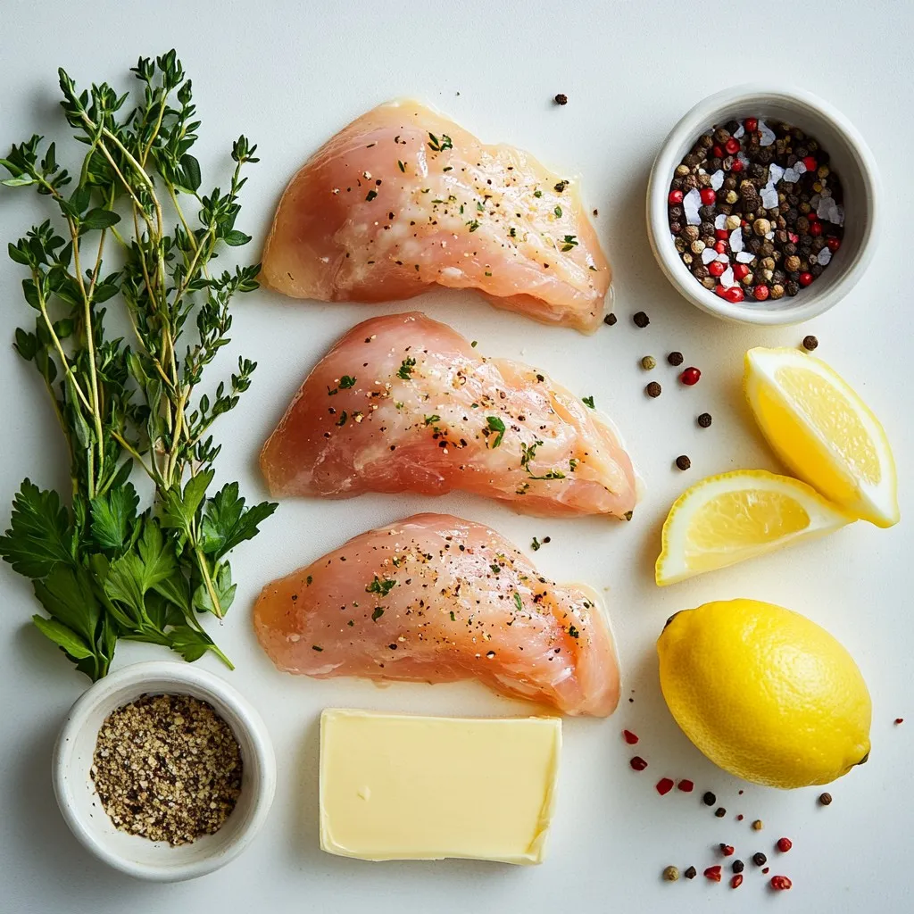 The main ingredients for this dish include chicken breasts, butter, and fresh herbs. I prefer using boneless, skinless chicken breasts. They cook quickly and stay juicy. The unsalted butter gives a rich flavor, while the garlic adds a nice kick.