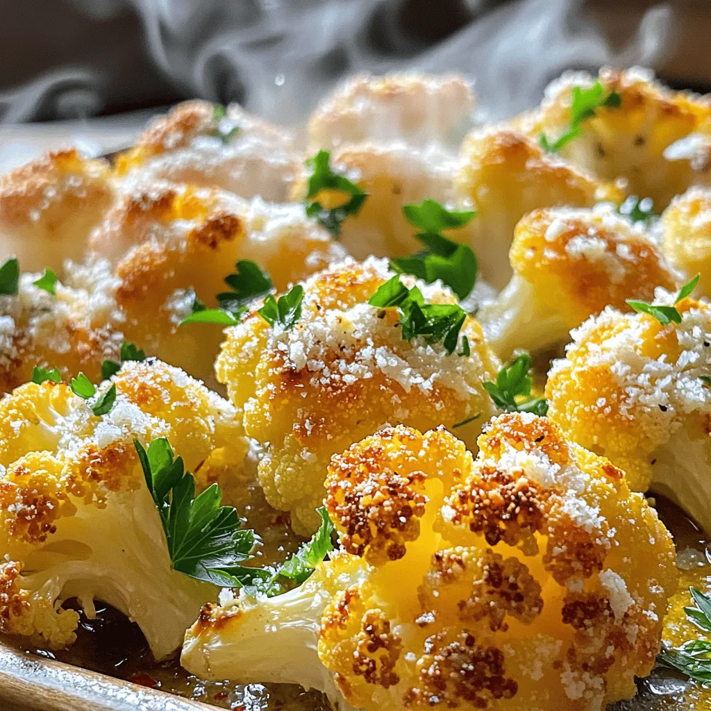 ![- 1 medium head of cauliflower, cut into bite-sized florets - 4 cloves of garlic, finely minced - 1/2 cup of freshly grated Parmesan cheese - 3 tablespoons of extra virgin olive oil - 1 teaspoon of Italian seasoning blend - 1/2 teaspoon of red pepper flakes (omit if you prefer no heat) - Sea salt and freshly ground black pepper, to taste - Fresh parsley, finely chopped (for garnish) - Red pepper flakes - Fresh parsley for garnish - Other suggested herbs or spices Garlic Parmesan Roasted Cauliflower brings bold flavors to your table. The garlic adds a warm kick, while the Parmesan cheese gives it a rich, savory taste. Cauliflower, when roasted, turns golden and sweet. This dish is simple yet satisfying. You can easily customize this recipe. Want some heat? Add red pepper flakes. If you love fresh herbs, toss in some thyme or rosemary. These add-ins make the dish even more special. Keep your friends and family guessing with each bite. Remember to check the full recipe for detailed cooking steps. Enjoy this flavorful side dish with your favorite meals! First, preheat your oven to 425°F (220°C). This heat helps the cauliflower roast well. Next, grab a large mixing bowl. Add the bite-sized cauliflower florets and minced garlic. Drizzle in the olive oil, then add the Italian seasoning and red pepper flakes. Season with sea salt and black pepper. Use your hands or a spatula to mix everything. Make sure each floret is coated with oil and spices. This step is key for flavor. Now, line a baking sheet with parchment paper. This makes cleanup easier. Spread the cauliflower mixture in a single layer on the sheet. This spacing helps them roast evenly. Place the baking sheet in the oven. Roast the cauliflower for about 20 minutes. Check halfway through and stir the florets. This helps them brown on all sides. After 20 minutes, take the baking sheet out of the oven. Sprinkle the grated Parmesan cheese evenly over the cauliflower. This cheese adds a rich flavor and a nice crunch. Return the baking sheet to the oven. Roast for another 5 minutes. You want the cheese to melt and get crispy. Once done, remove it from the oven and let it cool for a minute. Finally, garnish with chopped parsley for a pop of color. Serve it hot and enjoy this tasty side dish. For more details, check the Full Recipe. To keep your roasted cauliflower crisp, space the florets evenly on the baking sheet. If they touch, they may steam instead of roast. This leads to a soggy texture. Use a parchment-lined sheet for easy cleanup and better heat distribution. For optimal crispiness, ensure the cauliflower is dry before seasoning. Pat it with a towel after washing. Toss it well with olive oil and seasoning to coat every piece. This helps the edges caramelize nicely. You can mix up the flavors by adding different herbs. Try fresh thyme, rosemary, or even cumin for a twist. If you like heat, add more red pepper flakes. You can also combine cauliflower with other veggies. Carrots or bell peppers add color and taste. Mix and match to keep it exciting! Serve your roasted cauliflower on a colorful platter. Piling it high makes it look impressive. Drizzle with a bit of extra olive oil for shine. A squeeze of lemon adds brightness and freshness. For garnish, sprinkle fresh parsley over the top. This adds a pop of color and a fresh taste. Make your dish not just tasty, but beautiful too! {{image_4}} You can easily make a dairy-free version of this dish. Instead of Parmesan cheese, try using nutritional yeast. It adds a cheesy flavor without dairy. You can also use vegan cheese if you prefer a melty texture. For flavoring, add a bit of lemon juice or zest. This brightens the dish and gives it a fresh taste. You might also try smoked paprika or a dash of tahini for a nutty flavor. If you want to use an air fryer, prep the cauliflower as usual. Set your air fryer to 400°F (200°C). Cook for about 15-18 minutes. Shake the basket halfway through to ensure even cooking. This method gives you a crispier texture. Grilling the cauliflower is another great option. Toss the cauliflower with the garlic and oil, then place it on a grill. Cook for about 10-12 minutes, flipping halfway. This method adds a smoky flavor that pairs well with the garlic. For a spicy kick, add more red pepper flakes or a splash of hot sauce. This will give the dish a nice heat. If you love bold flavors, consider adding some curry powder or cumin. These spices will transform the dish completely. For a Mediterranean twist, try adding olives or sun-dried tomatoes. Chopped herbs like basil or oregano will also enhance the flavor. You can mix and match these ideas to create your own unique version of Garlic Parmesan Roasted Cauliflower. For the detailed instructions, refer to the Full Recipe. To keep your leftover Garlic Parmesan Roasted Cauliflower fresh, use airtight containers. Glass or plastic containers work well. Let the cauliflower cool before sealing. Store it in the fridge for up to three days. You can reheat in the oven or the microwave. The oven gives a crispier result. Preheat the oven to 350°F (175°C). Place the cauliflower on a baking sheet for 10 minutes. For the microwave, heat in short bursts, about 30 seconds each. Stir between intervals. You can freeze roasted cauliflower for later use. Allow it to cool first. Place it in a freezer-safe container or bag. Remove as much air as possible. It will last for up to three months. To thaw, move it to the fridge overnight. Reheat in the oven to restore crispiness. You can use frozen cauliflower, but it may change the texture. Frozen cauliflower tends to be softer and may release more water while cooking. This can lead to a less crispy result. If you choose frozen, adjust the cooking time. Start with about 25 minutes and check for doneness. Garlic Parmesan Roasted Cauliflower pairs well with many dishes. Here are some great options: - Grilled chicken or steak - Baked fish - Quinoa or rice bowls - Pasta with marinara or pe