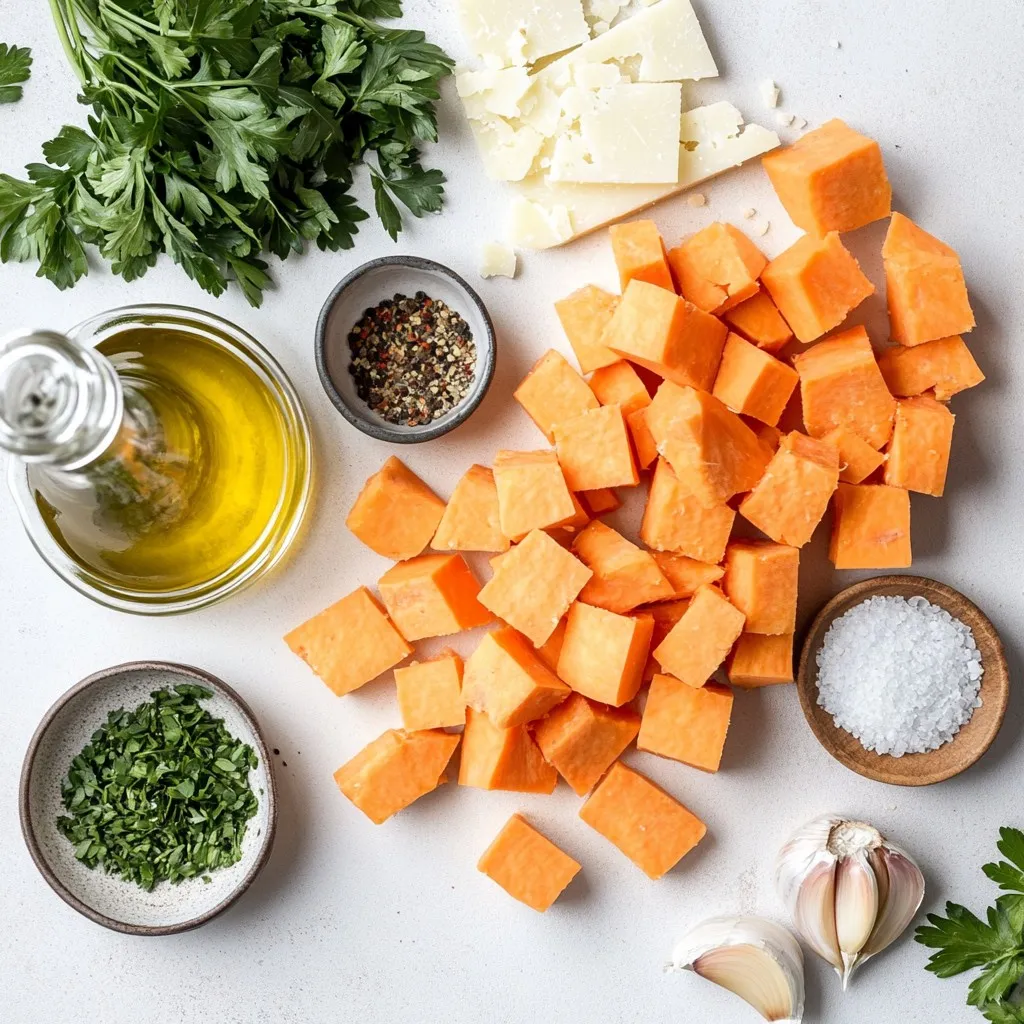 To make Garlic Parmesan Roasted Sweet Potatoes, gather these fresh ingredients. Sweet potatoes give a sweet and creamy base. Olive oil adds richness and helps crisp the edges. Minced garlic brings a bold flavor that pairs well with the sweet potatoes. Dried oregano adds an earthy tone, while smoked paprika brings warmth and depth.