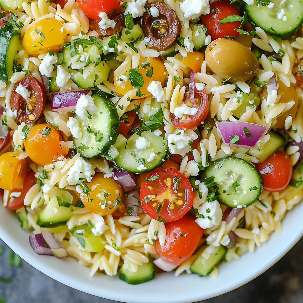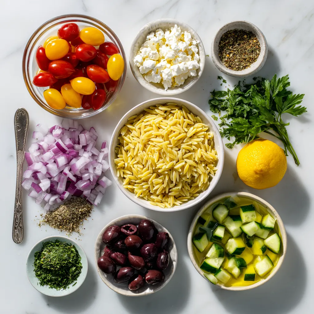 These ingredients create a vibrant and fresh salad. The orzo pasta serves as a great base. Cherry tomatoes add a burst of sweetness. Crisp cucumber gives a refreshing crunch. Red onion brings a bit of sharpness. Kalamata olives add a briny flavor. Feta cheese adds creaminess and salt. Fresh parsley and mint bring a lovely herb note.