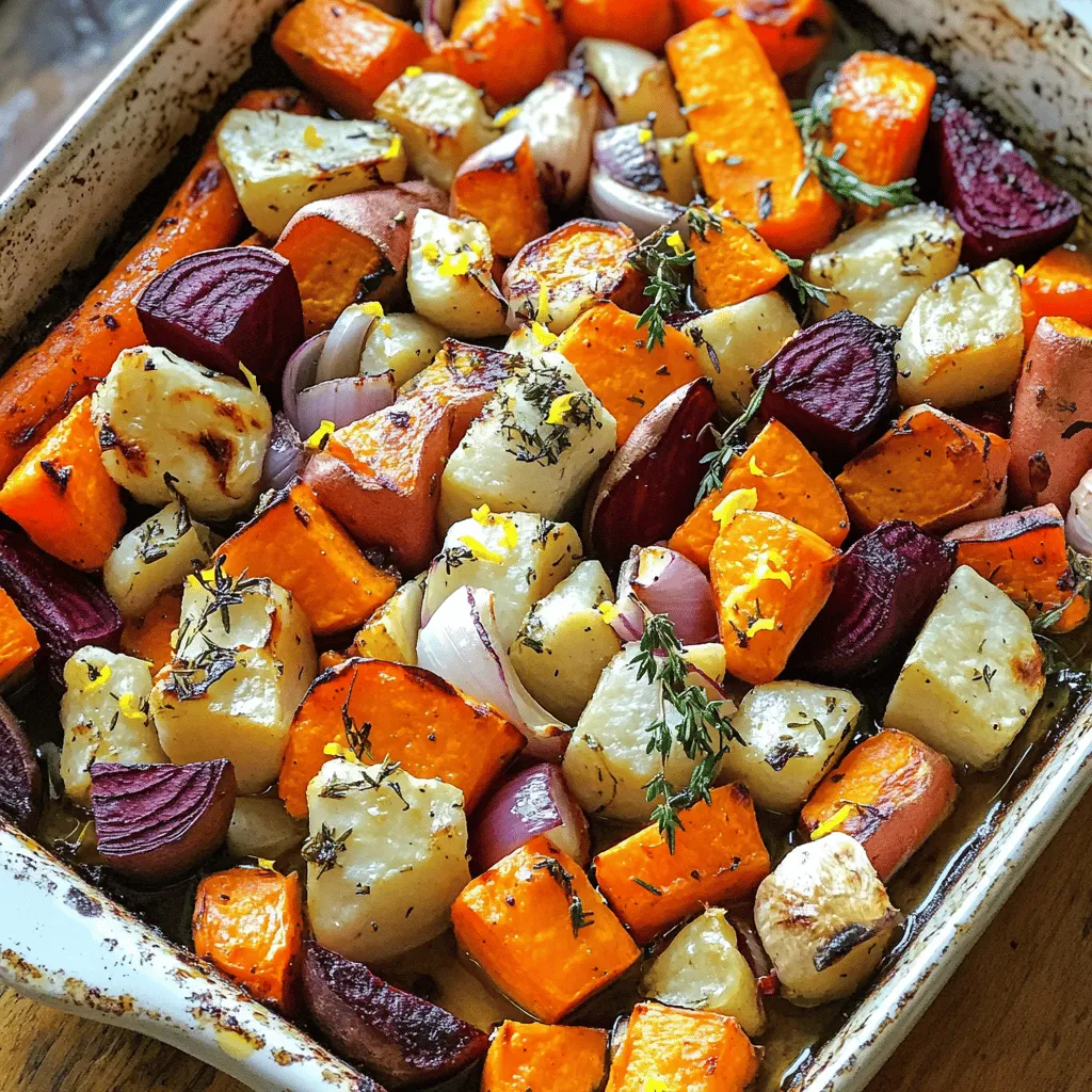 ![- 2 large carrots, peeled and cut into 1-inch chunks - 2 parsnips, peeled and cut into 1-inch chunks - 1 large sweet potato, peeled and diced into 1-inch cubes - 1 medium beetroot, peeled and cut into 1-inch cubes - 1 red onion, cut into wedges - 4 whole garlic cloves, unpeeled When choosing root vegetables, I like to pick fresh and firm ones. Each vegetable adds its own flavor. Carrots bring sweetness, while parsnips add a nutty taste. Sweet potatoes offer creaminess. Beetroot gives a deep color and earthy flavor. Red onion adds sweet notes, and garlic builds aroma. - 1 tablespoon fresh thyme leaves (or 1 teaspoon dried thyme) - 1 tablespoon fresh rosemary, finely chopped - Sea salt and freshly ground black pepper to taste - Zest of 1 lemon Herbs bring life to the dish. Fresh thyme and rosemary work well together. They add a savory touch. Sea salt enhances all the flavors, while black pepper gives a mild heat. Lemon zest adds brightness and freshness. This mix makes every bite exciting. - 3 tablespoons extra virgin olive oil Extra virgin olive oil is perfect for roasting. It helps the vegetables brown nicely. Olive oil also carries flavors from herbs well. It adds richness to the dish, making it even more delicious. You can find the complete recipe for Herb Roasted Root Vegetables [Full Recipe]. Prepping the Vegetables Start by washing and peeling the root vegetables. Cut the carrots, parsnips, sweet potato, and beetroot into 1-inch chunks. This size helps them cook evenly. Next, cut the red onion into wedges. Finally, keep the garlic cloves unpeeled for a nice flavor. Mixing Ingredients In a large mixing bowl, combine all the chopped vegetables. Drizzle the extra virgin olive oil over them. Add fresh thyme, rosemary, sea salt, and black pepper. Use your hands to toss everything together. Make sure each piece is coated well with oil and herbs. Oven Temperature and Duration Preheat your oven to 425°F (220°C). This high heat helps the vegetables caramelize and become tender. Once ready, spread the seasoned vegetables on a large baking sheet in a single layer. Tossing Instructions Roast the vegetables for 25 to 30 minutes. Halfway through, take them out and gently toss them. This step ensures all sides brown nicely. You want them golden and soft. Adding Lemon Zest When the vegetables are done, remove the baking sheet from the oven. Right away, sprinkle the lemon zest over the warm veggies. This adds a bright, fresh flavor that makes the dish pop. Serving Suggestions Serve the roasted root vegetables hot. They make a great side dish. You can also use them as a topping for salads. A colorful platter will make your meal look even more inviting. For the full recipe, refer to the earlier section. To know when the vegetables are done, look for a golden-brown color. They should feel soft when pierced with a fork. Cooking time varies but usually takes 25-30 minutes at 425°F. Check them halfway through and toss to ensure even cooking. Spacing on the Baking Sheet Place the vegetables in a single layer on the baking sheet. Give them space to breathe. If they are too close, they will steam instead of roast. This makes a big difference in texture. Tossing Techniques When you toss the vegetables, be gentle. Use a spatula or tongs to flip them. This helps them brown evenly without breaking apart. Toss them halfway through cooking for best results. For plating, use a large platter. Arrange the roasted vegetables in a colorful way. Drizzle any leftover olive oil from the baking sheet on top. This adds shine and flavor. Garnish with fresh herbs for a pretty finish. You can serve them hot or at room temperature. They look great on any table! For the full recipe, check out the details above. {{image_4}} You can switch up the root vegetables in this dish. Turnips add a nice bite. Their flavor is slightly peppery, which can give your dish a new twist. Potatoes are another great choice. They roast up soft and creamy. Just chop them into similar-sized pieces for even cooking. Herbs can really change the flavor profile. Oregano offers a warm, earthy taste. It pairs well with the sweetness of root veggies. Sage brings a cozy, woodsy flavor. You can mix and match these herbs based on what you like. Feel free to experiment! This dish is already vegan and gluten-free, but you can enhance the flavor. Adding a splash of balsamic vinegar before roasting can deepen the taste. You can also sprinkle nutritional yeast on top for a cheesy flavor without the dairy. These tips will add extra layers of flavor to your meal. For the full recipe, check out the details above. - Use airtight containers to keep your veggies fresh. - Glass or plastic containers work well. - Let the vegetables cool before sealing. - Store in the fridge for up to 4 days. - For best results, reheat in the oven. - Preheat the oven to 350°F (175°C). - Place the vegetables on a baking sheet. - Heat for about 10-15 minutes until warm. - You can use the microwave if you're short on time. - Heat in 30-second intervals until hot. - You can freeze herb roasted root vegetables. - Allow them to cool completely. - Place in freezer-safe bags or containers. - Remove as much air as possible to prevent freezer burn. - They will last up to 3 months in the freezer. - Thaw in the fridge overnight before reheating. This method keeps the flavor and nutrition intact. Enjoy your herb roasted root vegetables later! For the full recipe, check out the [Full Recipe]. Yes, you can use frozen vegetables. However, they may not roast as well as fresh ones. Frozen vegetables often contain more water. This water can make them soft and mushy when cooked. Cooking time may also change. Check them often, as they may cook faster. These vegetables pair well with many dishes. Try serving them with grilled chicken or fish. They also go great with a hearty grain, like quinoa or farro. For a full meal, add a fresh salad. This adds crunch and brightness alongside the warm veggies. To enhanc