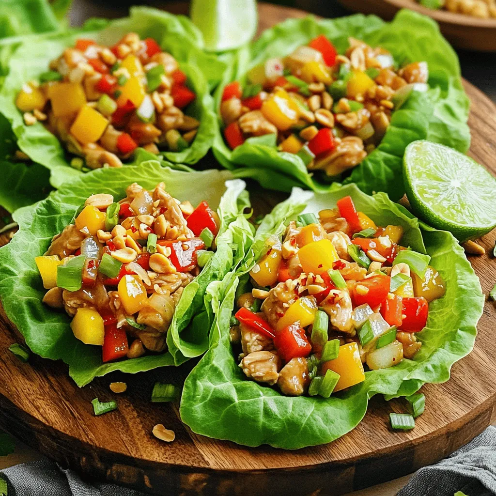- 1 lb boneless, skinless chicken thighs, diced into bite-sized pieces - 2 tablespoons peanut oil - 1 red bell pepper, diced into small cubes - 1 yellow bell pepper, diced into small cubes - 3 green onions, finely chopped, green and white parts separated - 3 cloves garlic, minced - 1 tablespoon fresh ginger, minced - 1/4 cup roasted unsalted peanuts, roughly chopped - 3 tablespoons soy sauce - 2 tablespoons hoisin sauce - 1 tablespoon rice vinegar - 1 tablespoon sesame oil - 1 teaspoon crushed red pepper flakes (adjust to taste) - Salt and pepper to taste - 1 head of butter or romaine lettuce, leaves gently separated for wrapping When I make Kung Pao Chicken Lettuce Wraps, I focus on fresh ingredients. Chicken thighs offer juicy flavor. The bell peppers add color and crunch. Green onions bring a nice bite, while garlic and ginger add depth. Peanuts give a lovely crunch and richness. The sauces harmonize the dish, making it both savory and a bit sweet. - Skillet or wok - Mixing bowls - Measuring spoons Having the right tools makes cooking easier. A skillet or wok ensures even heat. Mixing bowls help keep things organized. Measuring spoons guarantee accuracy in flavors. When you have these tools, preparing your meal becomes a breeze. For the full recipe, check out the details above. First, let's prep our ingredients. Start by chopping the chicken into small pieces. Use boneless, skinless chicken thighs for the best taste. Next, dice the red and yellow bell peppers into small cubes. Chop the green onions, keeping the green and white parts separate. Finally, mince the garlic and ginger. This mix of fresh and vibrant flavors will bring your dish to life. Now, mix the sauce ingredients. In a small bowl, combine soy sauce, hoisin sauce, rice vinegar, sesame oil, and crushed red pepper flakes. Whisk them together until smooth. This sauce packs a punch and ties all the flavors together beautifully. Heat two tablespoons of peanut oil in a large skillet or wok over medium-high heat. Wait until the oil shimmers before adding the chicken. Season the chicken with salt and pepper. Cook the chicken for about 6-8 minutes, stirring often, until it turns golden brown. Once the chicken is browned, add the minced garlic, ginger, and diced bell peppers. Stir and cook for an extra 3-4 minutes. You want the peppers to stay crisp but tender. Now it’s time to add the sauce. Pour your prepared sauce over the chicken and veggies. Stir well to coat everything. Let it cook for another 2 minutes. This step helps the flavors blend perfectly. Finally, fold in the chopped peanuts and the white parts of the green onions. To serve, take a lettuce leaf and place a scoop of the chicken mixture in the center. Fold the leaf around the filling to create a wrap. It’s neat and fun to eat! For presentation, arrange the filled wraps on a large platter. Garnish with the leftover green onions and a sprinkle of crushed red pepper. You can also add lime wedges on the side for an extra zesty touch. This dish looks great and tastes even better! For the full recipe, you can check out the full recipe link. To make tender chicken, choose boneless, skinless thighs. They stay juicy when cooked. Cut them into small, even pieces. This helps them cook evenly. Don’t crowd the pan when cooking. This ensures they brown well and don’t steam. If you want to adjust spice levels, start with less crushed red pepper flakes. You can always add more later. Taste the sauce before adding to the chicken. This way, you control the heat. Garnishes can enhance flavor and make the dish pop. Use chopped green onions on top for freshness. A sprinkle of crushed peanuts adds crunch. You can also add lime wedges for a zesty touch. For pairing options, serve with steamed rice or quinoa. They balance the meal well. You can also try it with a side of stir-fried veggies. This adds more color and nutrients to your meal. Enjoy your Kung Pao Chicken Lettuce Wraps with a cold drink for a complete experience! {{image_4}} You can switch up the protein in Kung Pao Chicken Lettuce Wraps. Tofu works great for a veggie twist. It absorbs flavors well and gives a nice texture. Use firm tofu and press it to remove excess water before cooking. Simply cube it and follow the same steps as you would with chicken. Shrimp is another tasty option. It cooks quickly and adds a lovely seafood flavor. Make sure to buy fresh or frozen shrimp, peeled and deveined. Just sauté it for a few minutes until pink and cooked through. For a vegetarian or vegan option, you can skip meat altogether. Use a mix of mushrooms and bell peppers. They add depth and flavor, making the dish rich and satisfying. To enhance the flavor, add more vegetables. Carrots, zucchini, or snap peas work well. They bring color and crunch to the wraps. Chop them into small pieces, so they blend nicely with the chicken or tofu. Experimenting with different sauces can also boost the taste. Try adding a splash of orange juice for sweetness or some chili sauce for heat. You can even mix in a bit of peanut butter for a creamier texture. For the full recipe, check out the detailed instructions on how to make these delicious wraps. To keep your Kung Pao chicken lettuce wraps fresh, store the leftovers properly. First, let the dish cool to room temperature. Then, place it in an airtight container. This helps prevent moisture loss and keeps the flavors intact. For best results, separate the chicken mixture from the lettuce. This keeps the lettuce crisp. The wraps will last for about 3 to 4 days in the fridge. If you notice any off smells or changes in color, it’s best to throw it out. When you’re ready to enjoy your leftovers, reheating them correctly is key. The best way to reheat the chicken mixture is in a skillet. Heat it over medium heat for 3 to 5 minutes, stirring often. This helps maintain the texture and flavor. You can also microwave the chicken mixture. Place it in a microwave-safe bowl and cover it loosely with a li