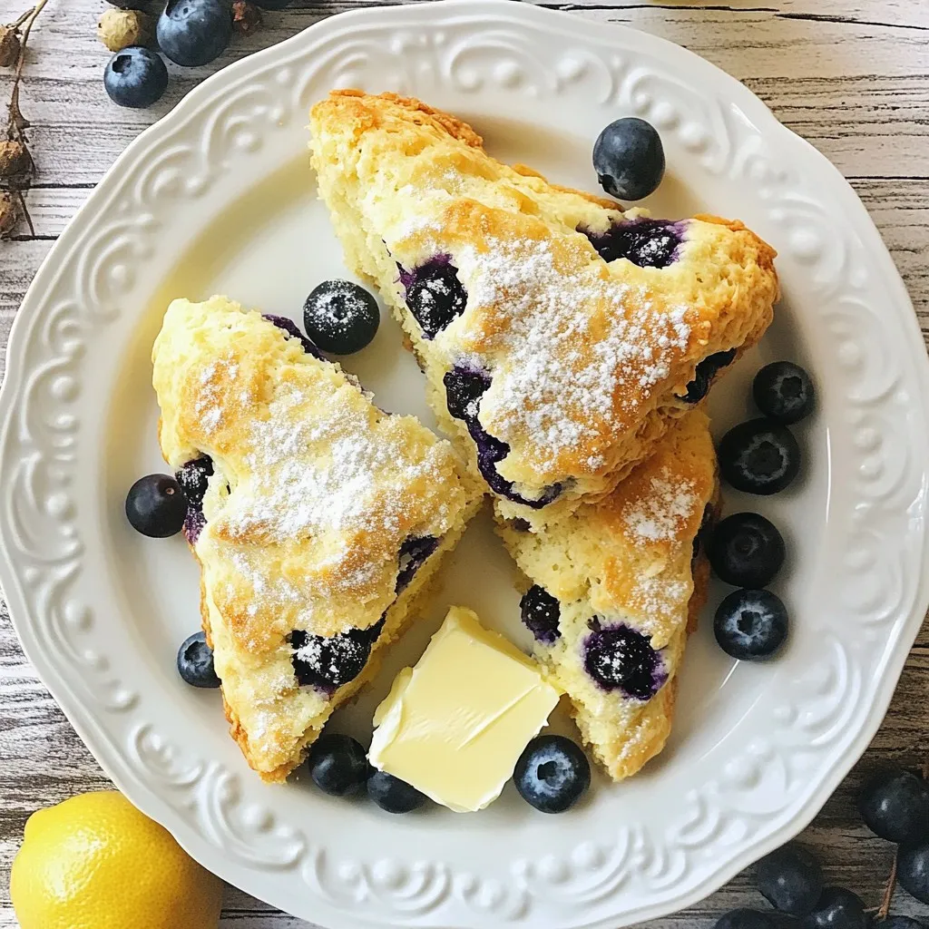 These scones shine with a dollop of clotted cream or butter. You can also pair them with fresh lemon curd for a citrus kick. A cup of tea or coffee complements them nicely, too. For an extra touch, sprinkle some lemon zest or scatter whole blueberries on top when serving.