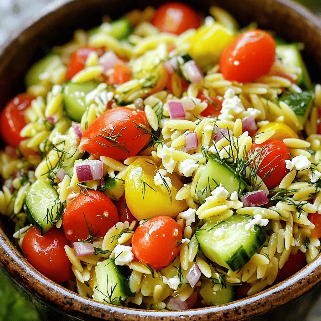 To create a bright and tasty Lemon Dill Orzo Salad, gather these key items: - 1 cup orzo pasta - 2 tablespoons olive oil - 1 tablespoon fresh lemon juice - Zest of 1 lemon - 1 cup cherry tomatoes, halved - 1 medium cucumber, diced - 1/4 red onion, finely chopped - 1/4 cup fresh dill, roughly chopped - Salt and freshly ground black pepper to taste These ingredients come together to make a fresh and vibrant dish that bursts with flavor. You can customize your salad with these optional ingredients: - Crumbled feta cheese (for a creamy touch) - Olives (for a briny kick) - Bell peppers (for added crunch) - Avocado (for creaminess and healthy fats) Feel free to mix and match based on your taste. Fresh herbs and garnishes elevate this salad. Consider these options: - Extra dill (for a pop of green) - Chives (for a mild onion flavor) - Parsley (for freshness) - Lemon wedges (for serving) These additions not only enhance taste but also make your dish look stunning. For the complete cooking process, check out the Full Recipe. Start with a large pot. Fill it with about 4 cups of salted water. Heat the water until it boils. Now, add 1 cup of orzo pasta. Cook the orzo for 8 to 10 minutes. You want it to be al dente, which means firm to the bite. Once cooked, drain the orzo in a colander. Rinse it under cold water to stop the cooking. Set it aside to cool down. Grab a small mixing bowl. In it, whisk together 2 tablespoons of olive oil. Add 1 tablespoon of fresh lemon juice and the zest of 1 lemon. Don't forget to sprinkle in a pinch of salt and pepper. Mix well until the dressing comes together and looks smooth. Taste it to see if you need more salt or lemon juice. In a big mixing bowl, add your cooled orzo. Toss in 1 cup of halved cherry tomatoes and 1 diced cucumber. Next, add 1/4 of a finely chopped red onion and 1/4 cup of roughly chopped fresh dill. Gently mix everything until it is evenly combined. Now, pour the dressing over the orzo and veggies. Using a large spoon, toss everything to coat well. Taste the salad and adjust seasoning if needed. If you like, you can sprinkle crumbled feta cheese on top. Serve it chilled or at room temperature. This recipe is a fresh and colorful treat. For the full details, check the Full Recipe. To cook orzo just right, use a large pot. Add about 4 cups of salted water. Bring it to a rolling boil. Carefully drop in the orzo pasta. Cook it for 8 to 10 minutes. Stir it occasionally to keep it from sticking. You want it to be al dente, or firm to the bite. Once done, drain it in a colander. Rinse it under cold water to stop the cooking. This keeps it from getting mushy. Making Lemon Dill Orzo Salad ahead of time is simple. Prepare the orzo and let it cool. Chop the veggies and fresh dill. Store each part in separate containers. When you are ready to eat, mix them together. Add the dressing right before serving. This keeps the salad fresh and crunchy. It’s a great option for lunch or dinner during a busy week. Taste your salad before serving. If it needs more flavor, add more salt. You can also add more lemon juice for brightness. Freshly ground black pepper can give a nice kick. If you like it creamy, sprinkle on some crumbled feta cheese. Remember, cooking is all about your preference. Feel free to experiment until you find your perfect balance. For the full recipe, check out the details above! {{image_4}} You can make Lemon Dill Orzo Salad heartier by adding protein. Grilled chicken or shrimp works great. Simply cook the chicken or shrimp until done, then slice or toss it in. This twist gives the salad a satisfying boost. The flavors of lemon and dill pair well with grilled meats. They add depth and make the salad a full meal. For a vegetarian touch, try adding chickpeas or creamy avocado. Chickpeas bring protein and a nice bite. Just drain and rinse them before mixing in. Avocado adds a rich, smooth texture. Cut it into cubes and fold it in gently. Both options keep the salad light and fresh while making it filling. Seasonal veggies can change the salad's flavor and texture. In spring, add asparagus or peas for a crisp crunch. In summer, try bell peppers or zucchini for a sweet touch. Fall's harvest brings roasted squash or beets, giving warmth and color. Feel free to swap in any fresh produce you love. This keeps the dish exciting and flexible. Check out the Full Recipe for more inspiration! To keep Lemon Dill Orzo Salad fresh, store it in an airtight container. Make sure the salad is cool before sealing it. This helps preserve its flavors and texture. If you have added feta cheese, it’s best to store it separately. This prevents the cheese from becoming soggy. Reheating orzo salad is simple. You can warm it in the microwave for 30 seconds to 1 minute. Stir it halfway to heat evenly. If you prefer it cold, enjoy it straight from the fridge. The flavors actually get better as it sits! Lemon Dill Orzo Salad lasts about 3 to 5 days in the fridge. Always check for any signs of spoilage before eating. If it smells off or has a strange texture, throw it away. To keep your salad at its best, eat it within this time frame. For a full recipe, refer back to the beginning! Yes, you can make this salad gluten-free. Use gluten-free orzo pasta or any gluten-free pasta you like. Cooking times may differ, so check the package for best results. The rest of the ingredients are gluten-free. This way, everyone can enjoy the bright flavors of the salad. If you want to skip feta cheese, try goat cheese or ricotta. Both add a creamy texture and great taste. For a dairy-free option, use avocado or omit cheese entirely. The salad still tastes fresh and delicious without it. You can also try adding nuts for crunch. To spice up the salad, add chopped jalapeños or red pepper flakes. You can also include a dash of hot sauce in the dressing. These options will give the salad a nice kick. Just remember to taste as you go. You want it to be tasty, not overwhelming. For the complete recip